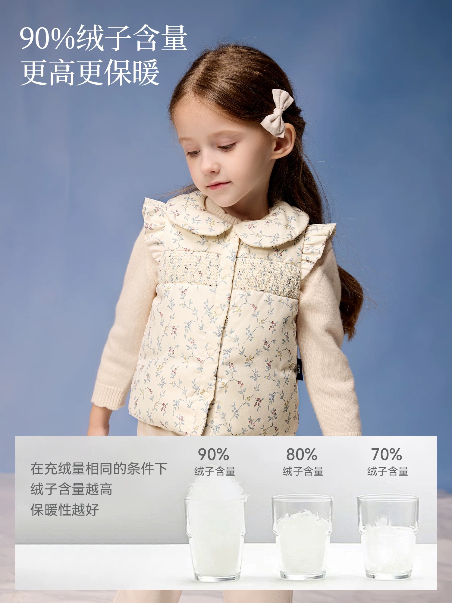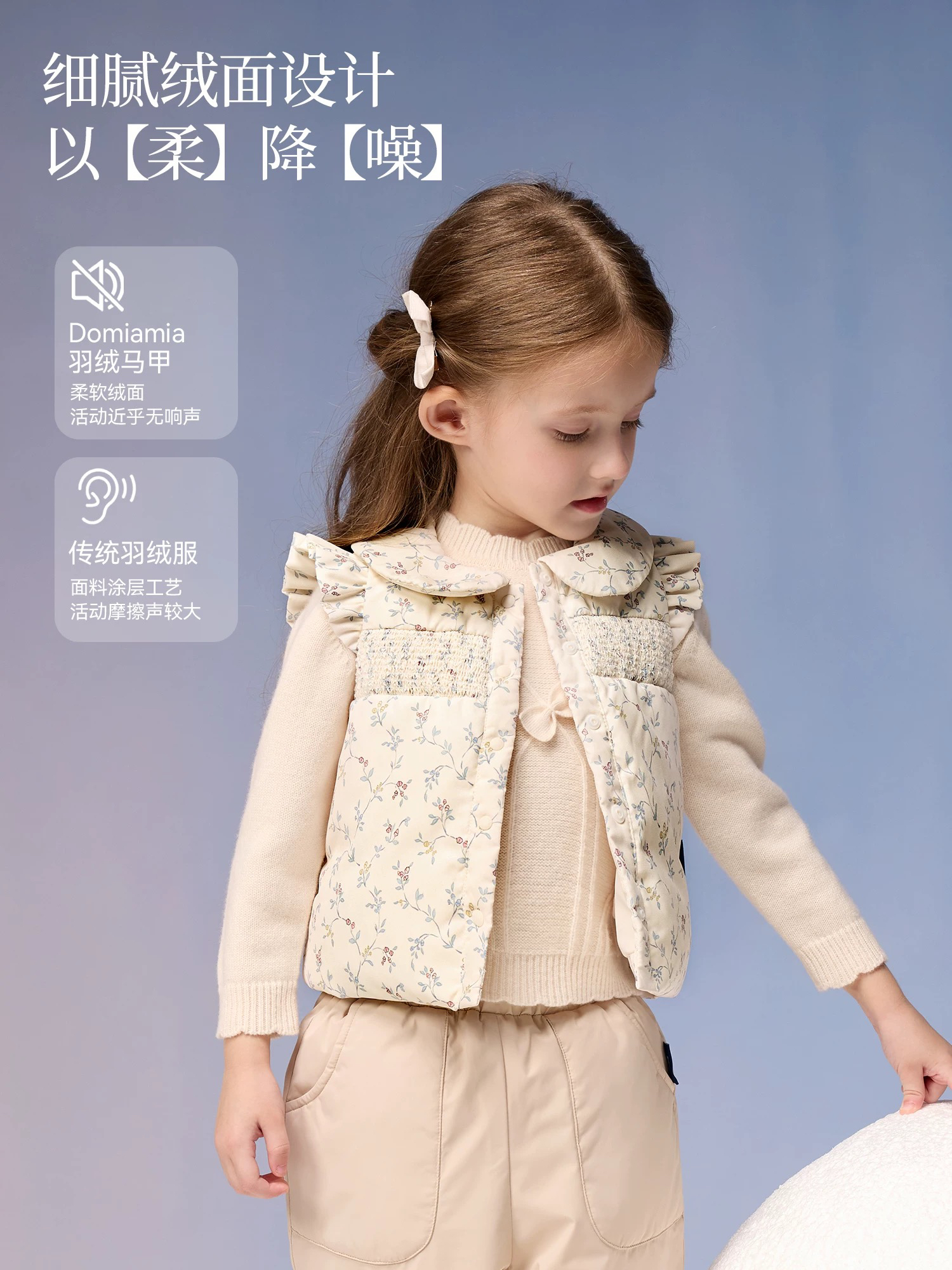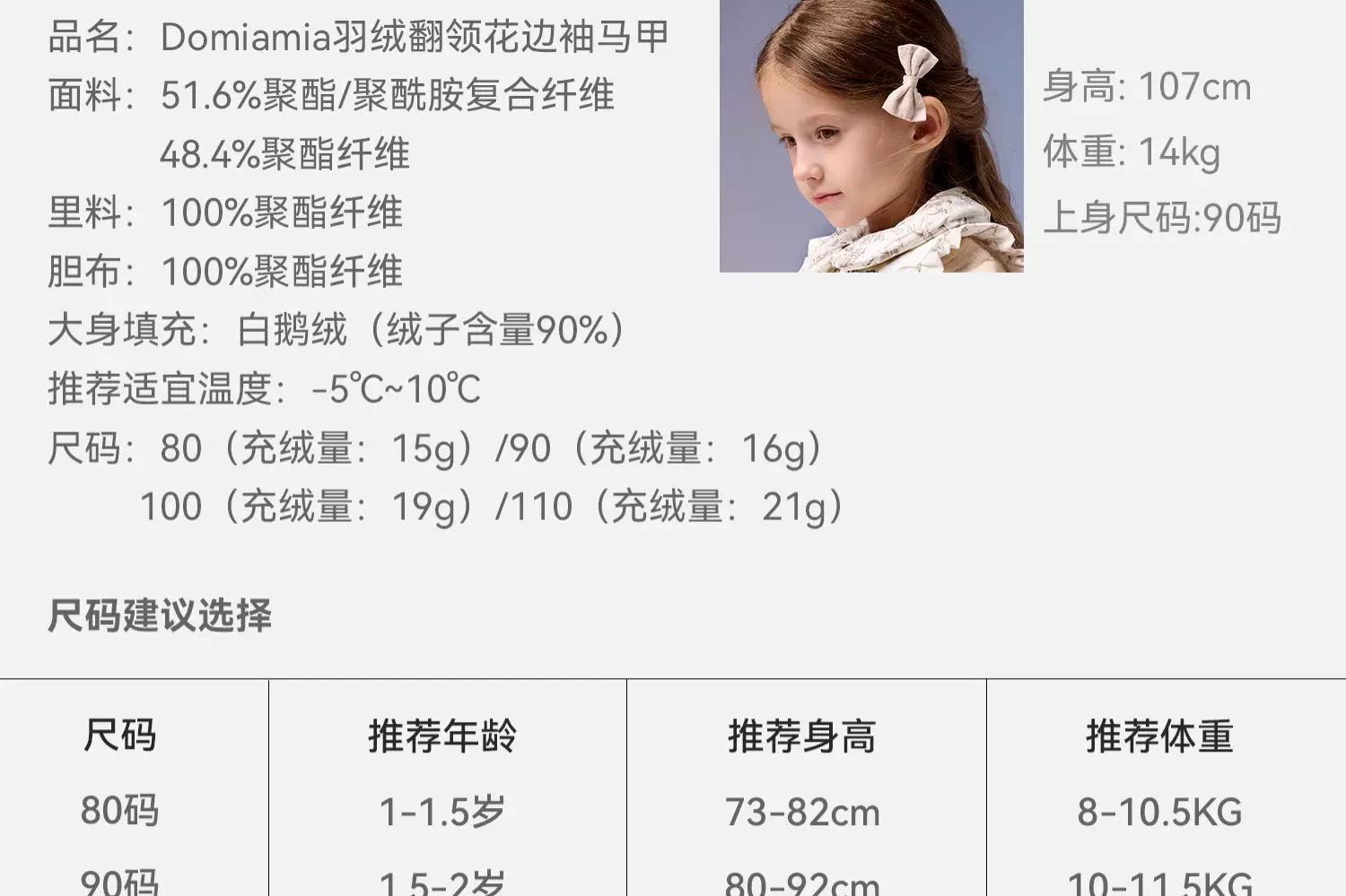 Domiamia 女童羽绒翻领花边袖马甲 春秋冬款外穿内搭鹅绒百搭保暖背心