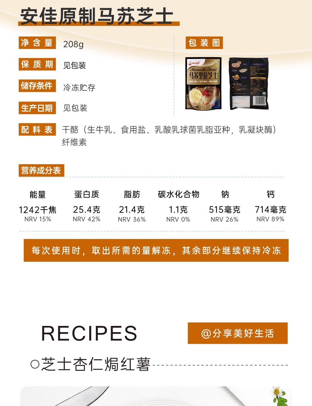 208g 原制安佳马苏里拉芝士碎马苏里拉奶酪条 披萨焗饭拉丝芝士 冷冻