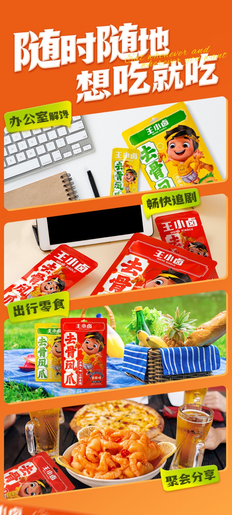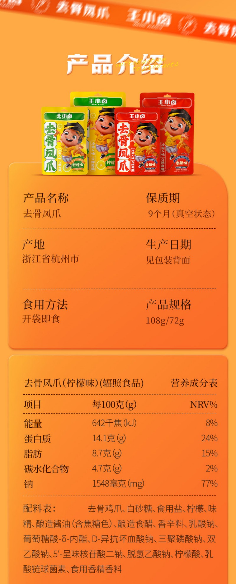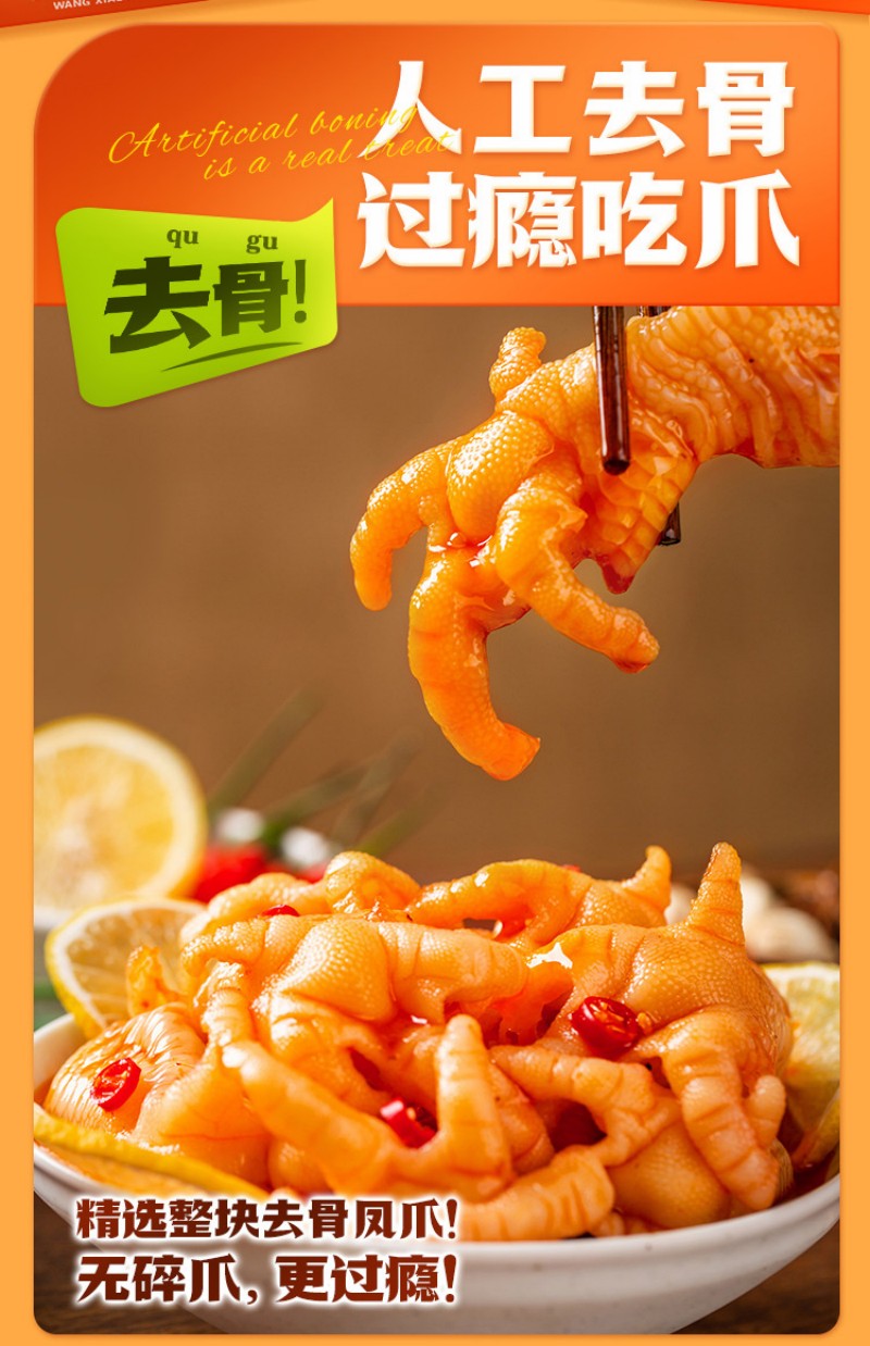 王小卤去骨鸡爪混合口味(柠檬味72g+香辣味72g)无骨鸡爪休闲零食独立包装开袋