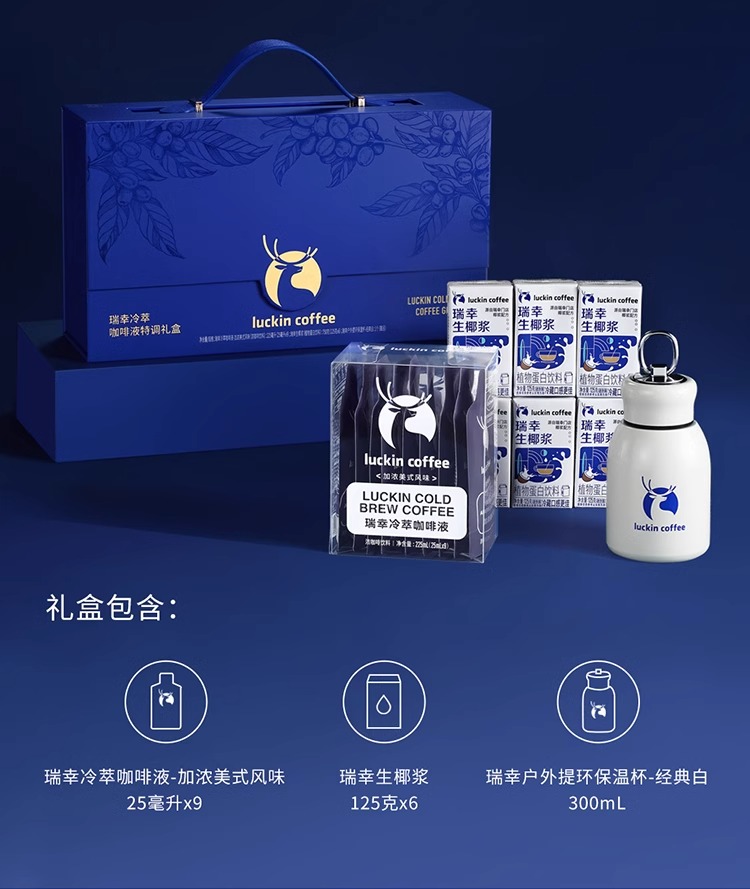 【分仓直发包邮】瑞幸冷萃咖啡液特调礼盒(瑞幸生椰浆125g*6+瑞幸冷萃咖啡液加浓美式风味25ml*9+瑞幸户外提环保温杯经典白300ml)
