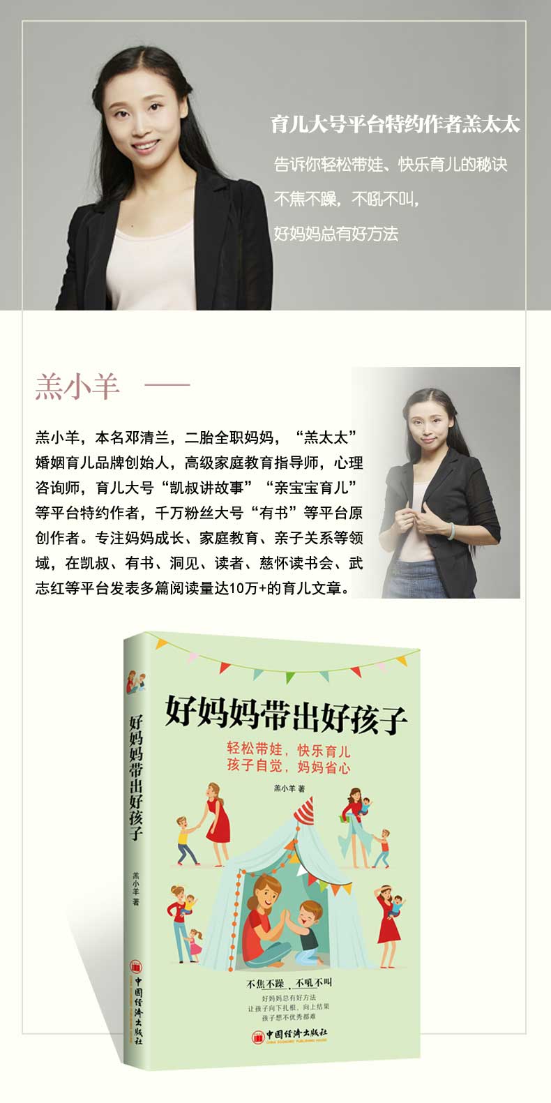 羔小羊,本名邓清兰,二胎全职妈妈,“羔太太”婚姻育儿品牌创始人,高级家庭教育指导师,心理咨询师,育儿大号“凯叔讲故事”“亲宝宝育儿”等平台特约作者,千万粉丝大号“有书”等平台原创作者。专注妈妈成长、家庭教育、亲子关系等领域,在凯叔、有书、洞见、读者、慈怀读书会、武志红等平台发表多篇阅读量达10万+的育儿文章。