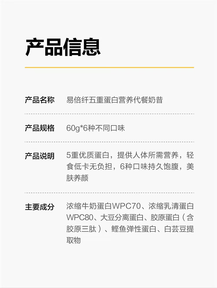 自营(麦吉丽)-易倍纤五重蛋白代餐营养奶昔 60g*6瓶一盒(云仓直发 无质量问题不支持退换货)