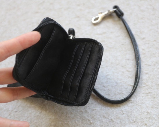 表层 黑色暗花的织物 内里布衬 前一个贴袋 主袋内无隔断 1个贴袋+3卡位