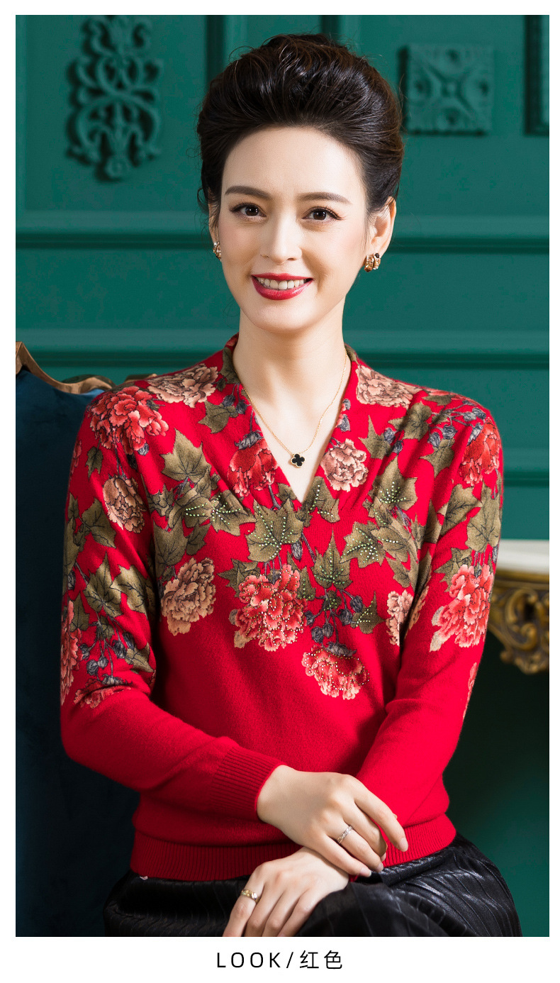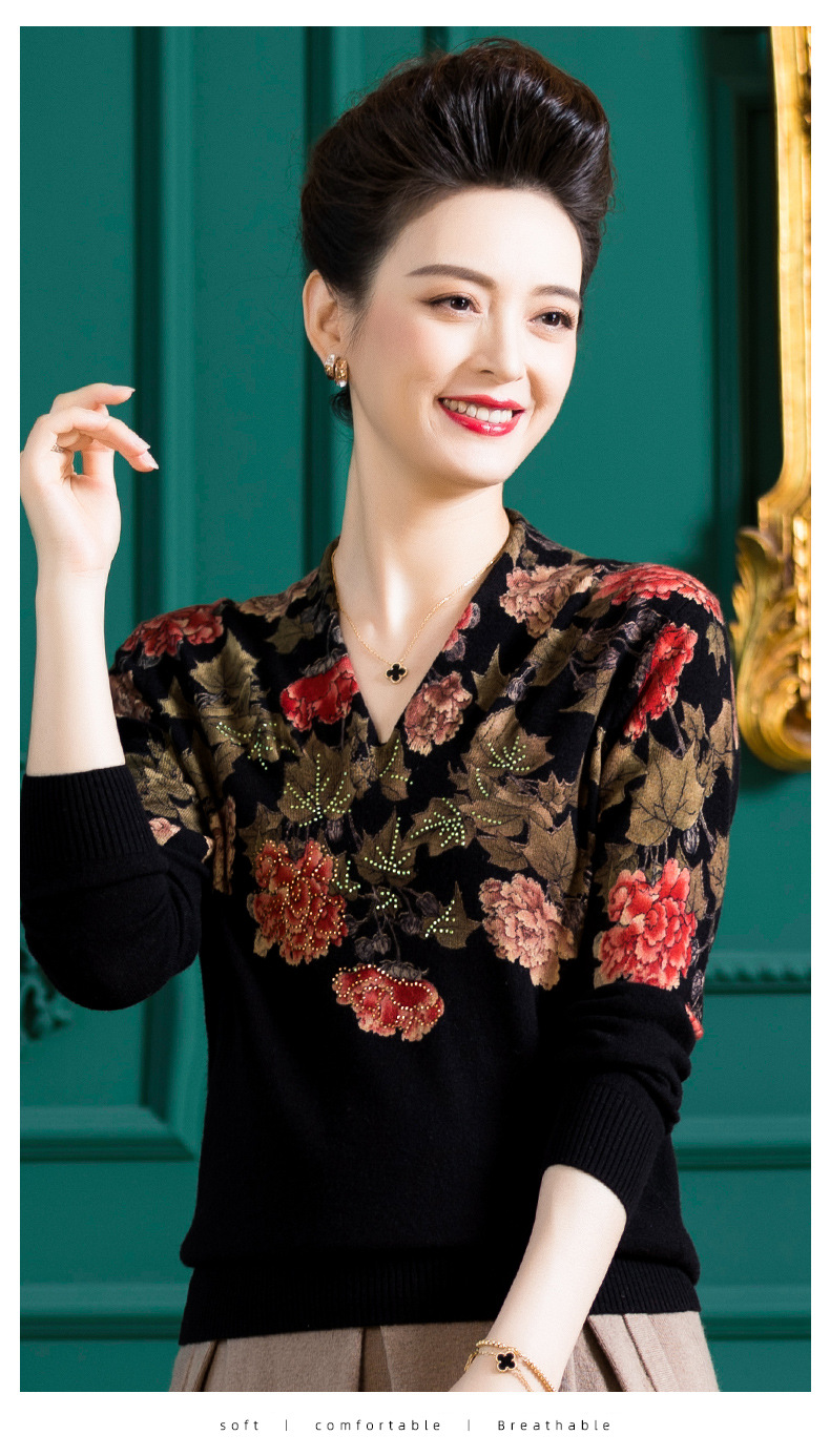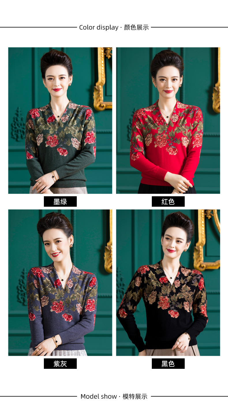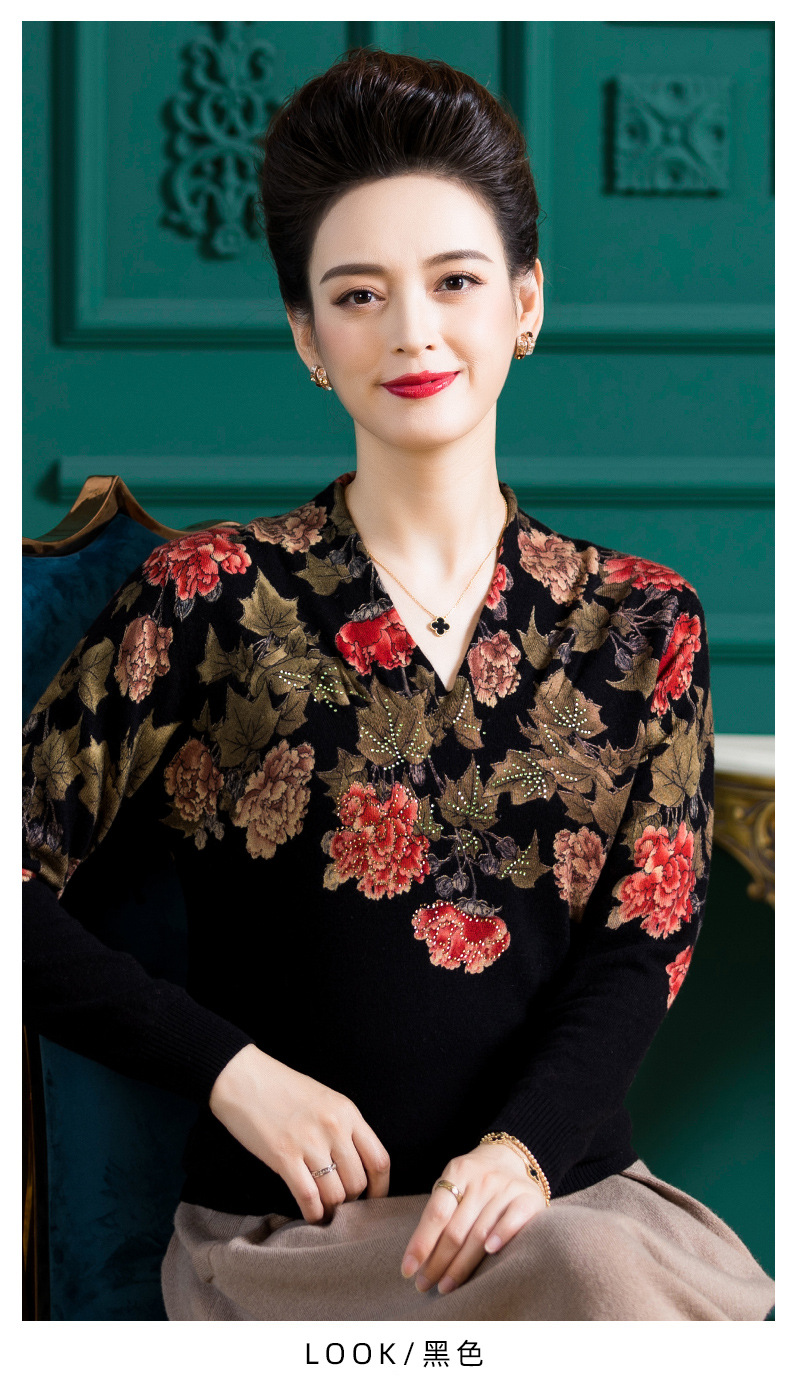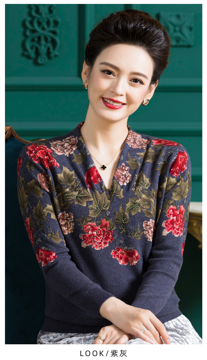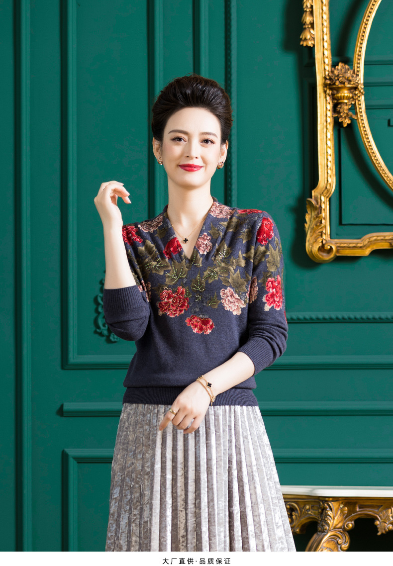 V领复古羊毛衫,镶钻针织毛衣长袖打底衫WY-M98939