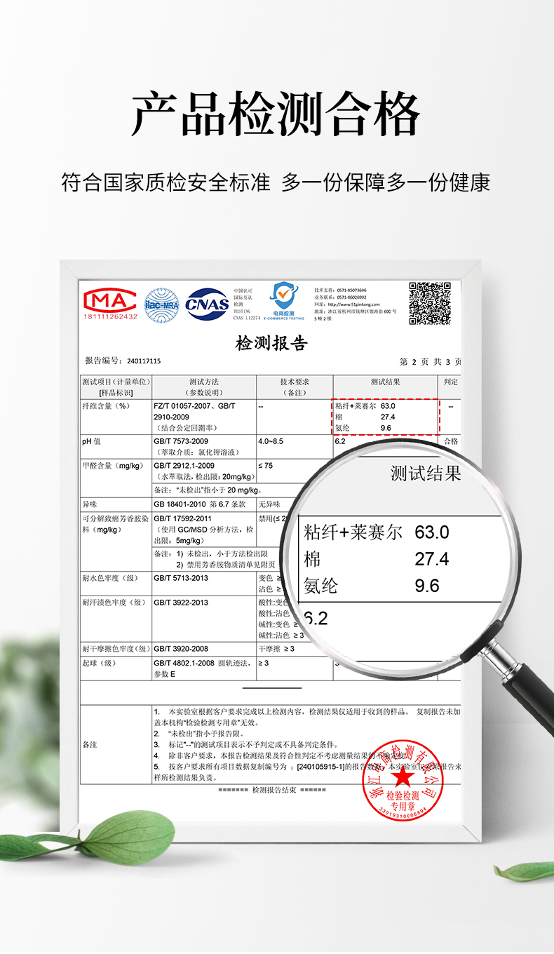 【成分】:莱赛尔(天丝)+粘纤(竹纤维)63% 棉 27.4% 氨纶 9.6%
