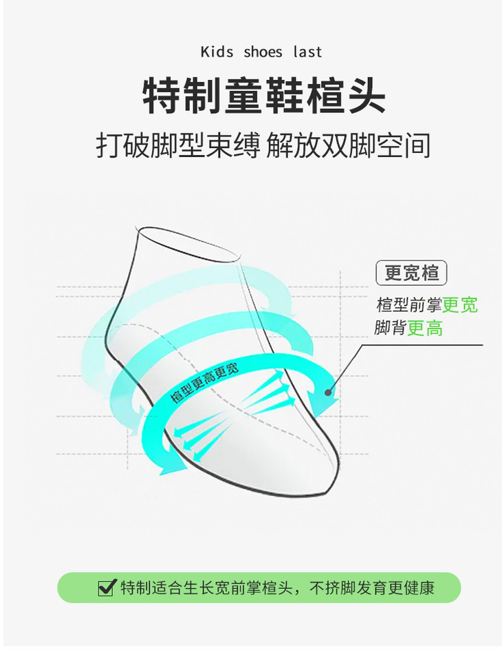 鞋型设计,更专注于亚洲儿童脚型 从设计到成型,进行了多次真人测试 按照中国儿童的脚型做了适当调整 最终做出更符合我们中国人的人工体学设计 脚感无敌好,穿上舒服的都不想脱