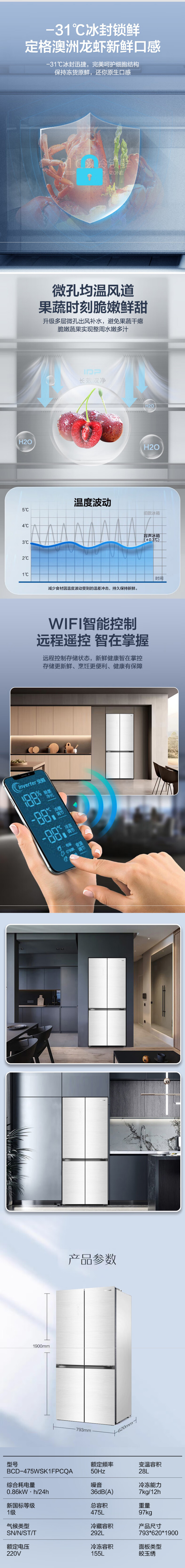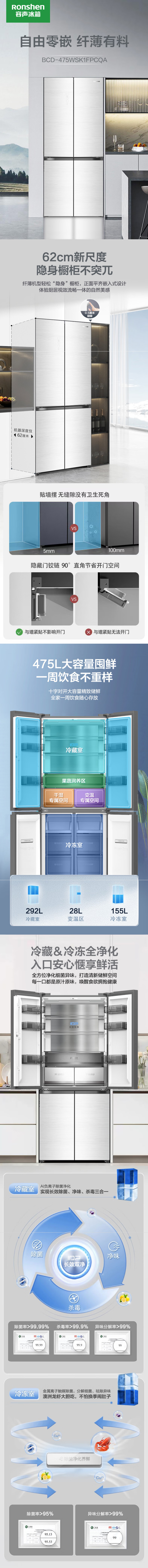 容声 冰箱 BCD-475WSK1FPCQA 475升 风冷 变频 一级能效 十字对开门 嵌入式 自由零嵌 白色系 皎玉绣