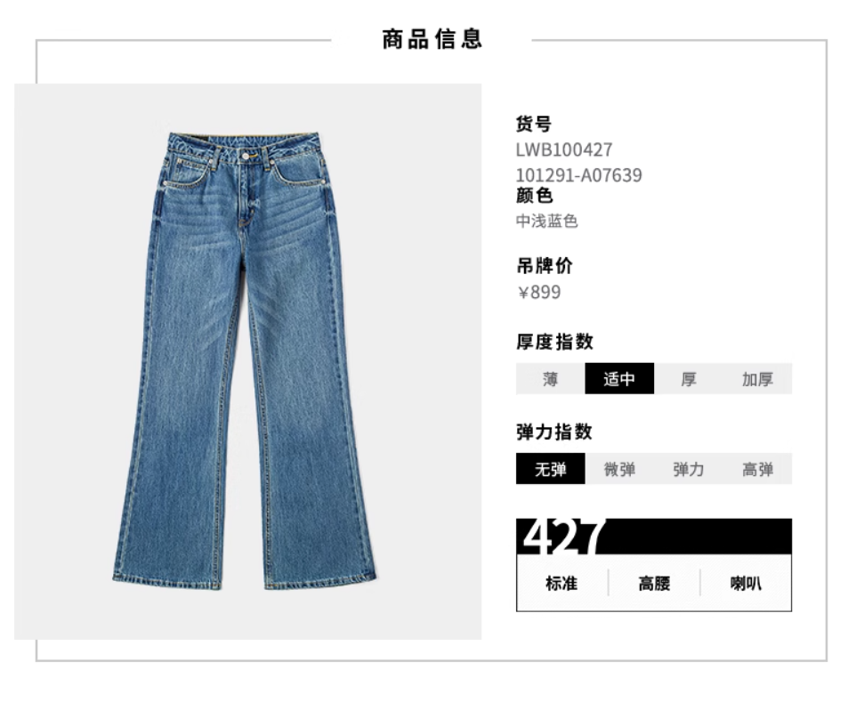 LEE新品427高腰喇叭中浅蓝女牛仔裤潮LWB100427101291