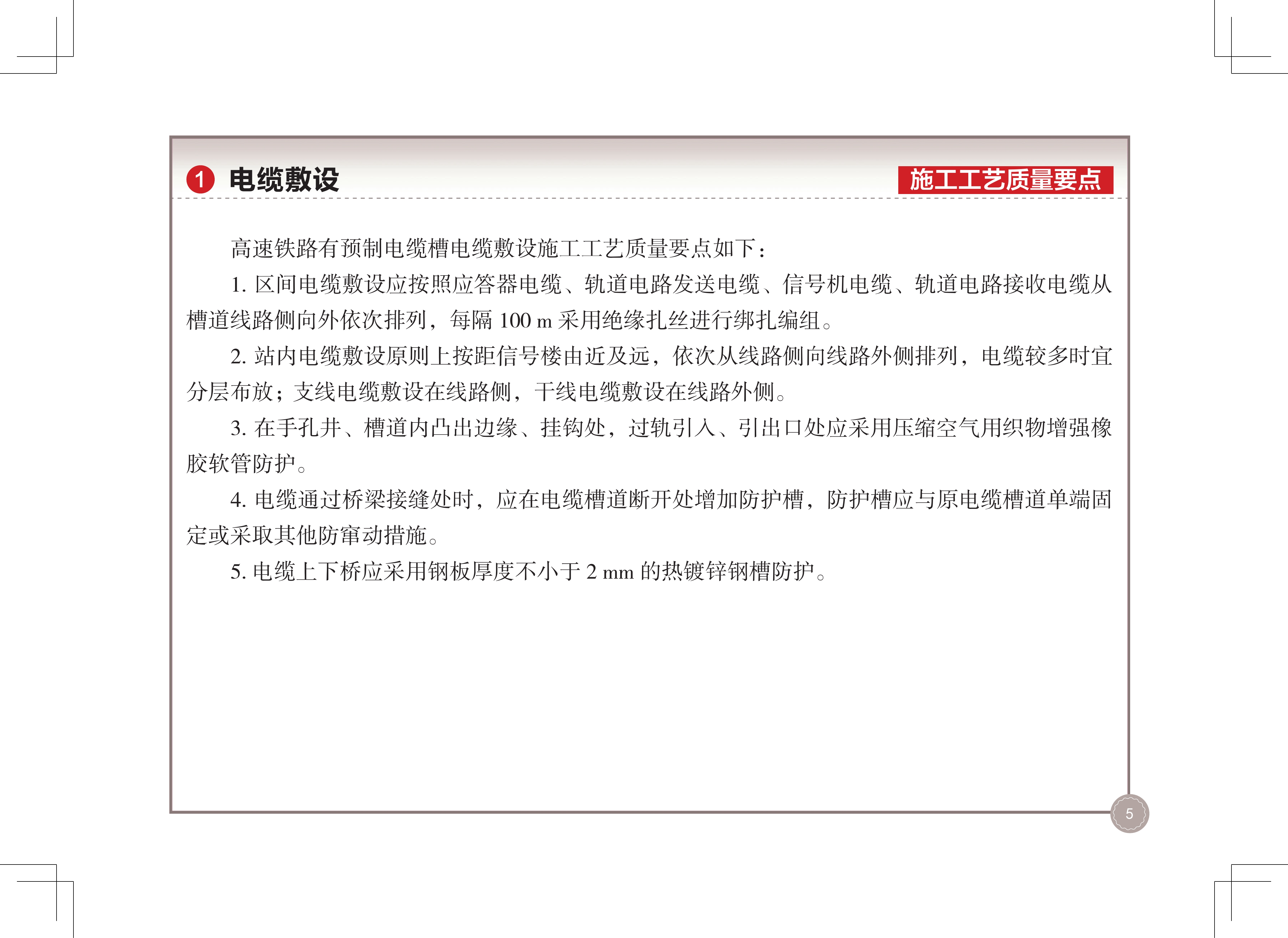 本书吸纳了近年来铁路信号工程建设、运营维护管理实践经验和科研成果,借鉴国内相关标准,利用图文形式表述了室内外信号设备施工全过程。室外包括:电缆敷设安装、箱盒安装、信号机安装、道岔设备安装、轨道设备安装、应答器安装、设备硬面化等部分;室内包括:机柜设备安装、室内布线、室内配线、室内设备安装、电缆引入、室内接地、室内其他设备安装等部分。并对其施工要点以及其注意事项进行描述,辅以图纸资料以及现场实际操作图片。
