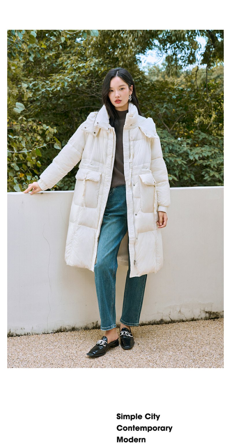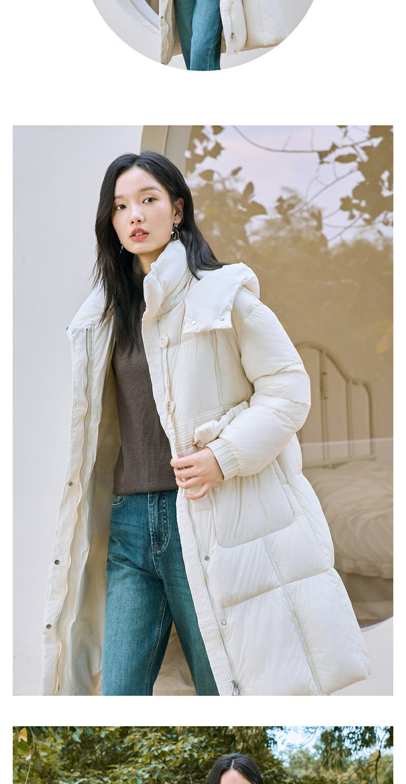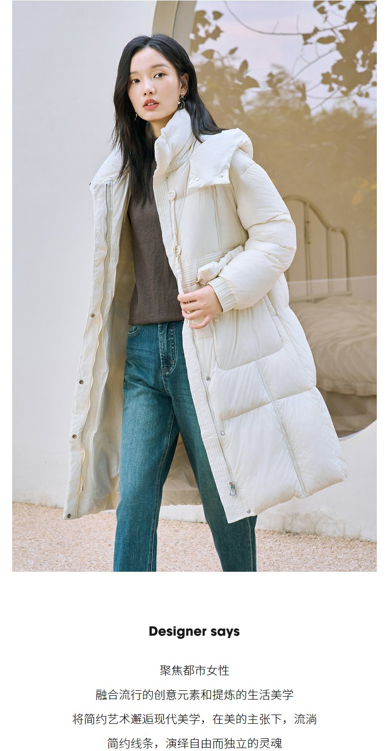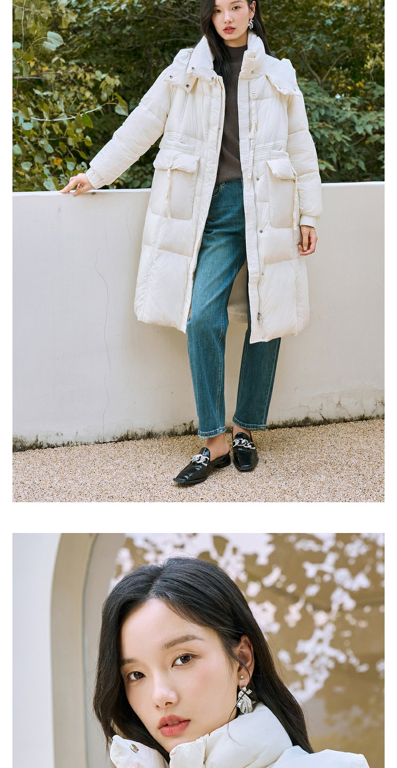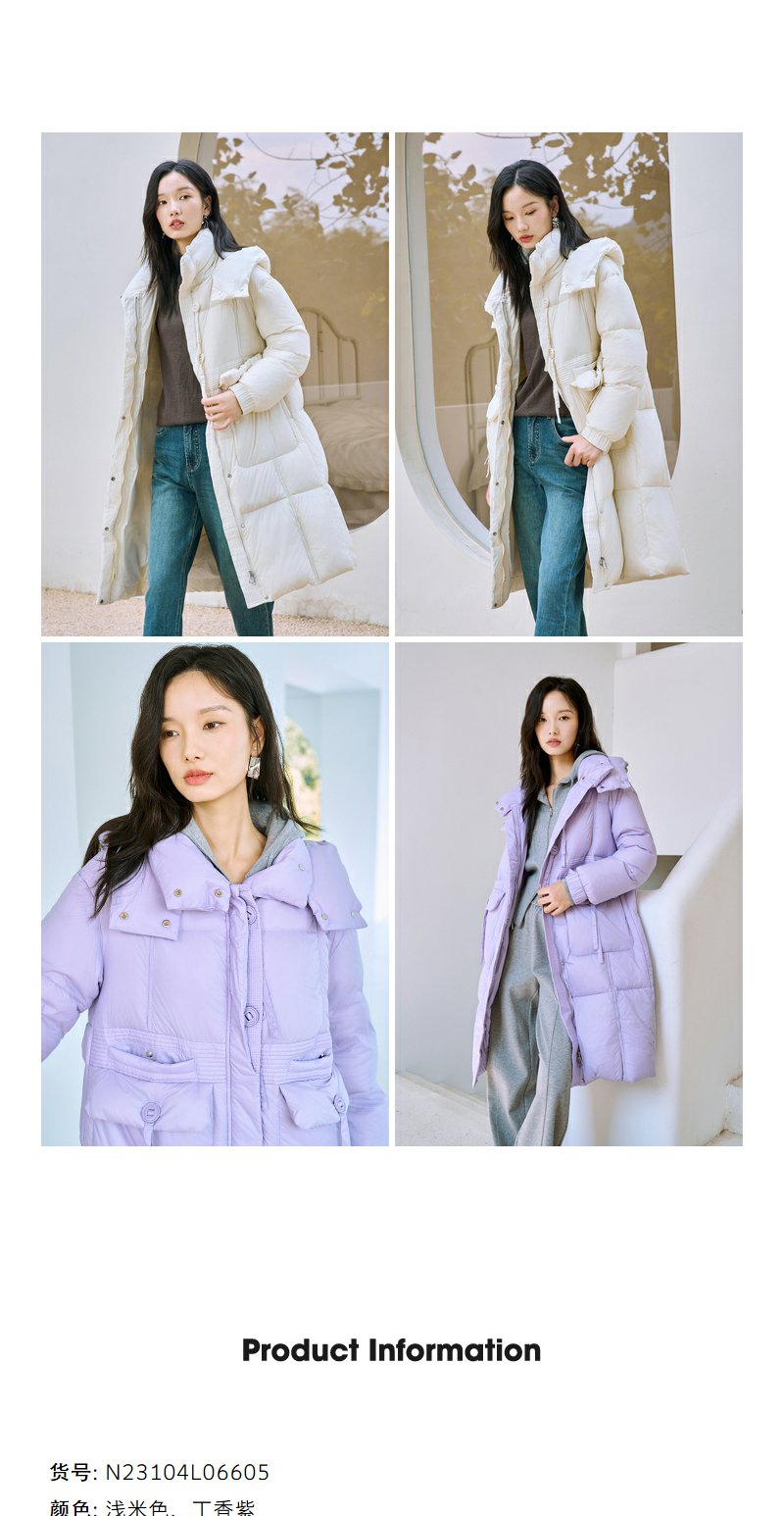 NEELLY纳俪90白鸭绒中长款过膝羽绒服女冬季连帽设计感保暖面包服N23104L06605