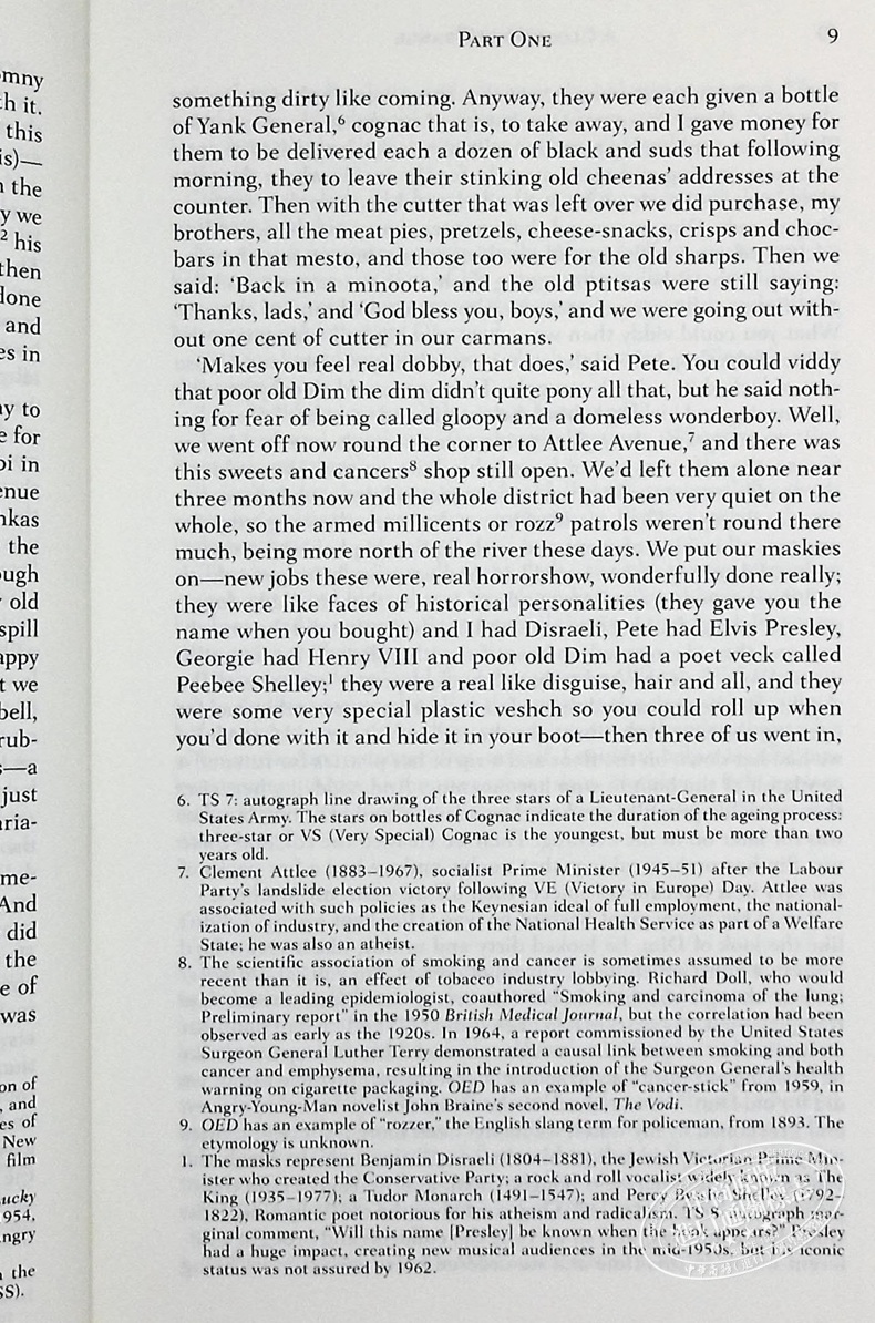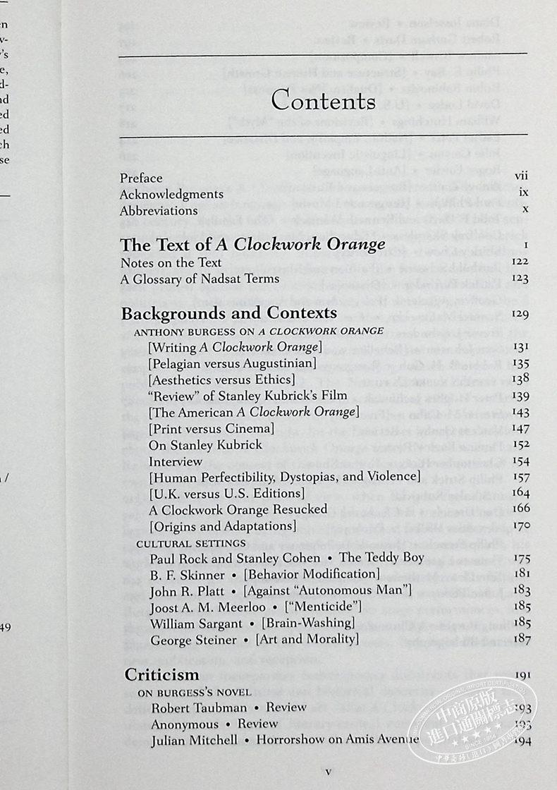 “背景与语境”介绍了编辑选择的大量材料,以丰富读者对这一刻骨铭心的作品的理解,其中许多是伯吉斯本人所为。伯吉斯关于写《发条橙》的观点,其哲学问题以及关于英国版与美国版以及小说与电影改编的辩论都包括在内。Paul Rock和Stanley Cohen,BF Skinner,John R.Platt,Joost AM Meerloo,William Sargent和George Steiner提供了涉及小说中心问题的相关著作,如青春风格,行为改变以及艺术与道德。 。
