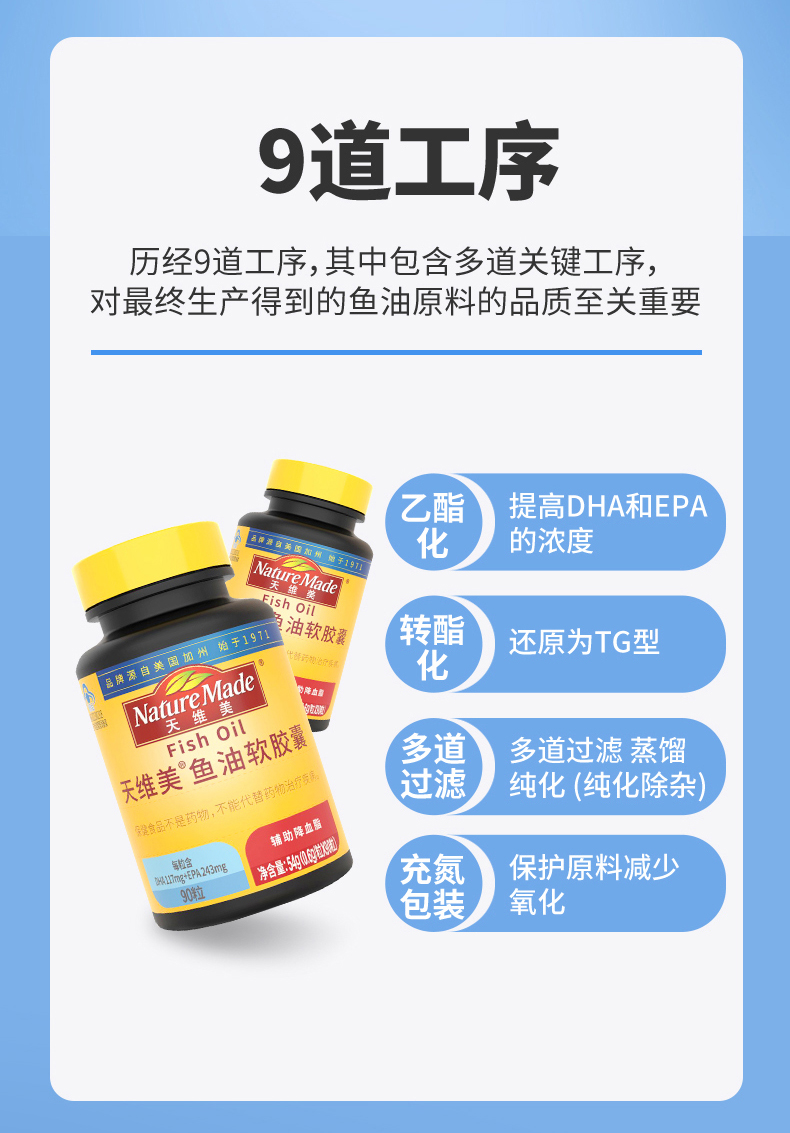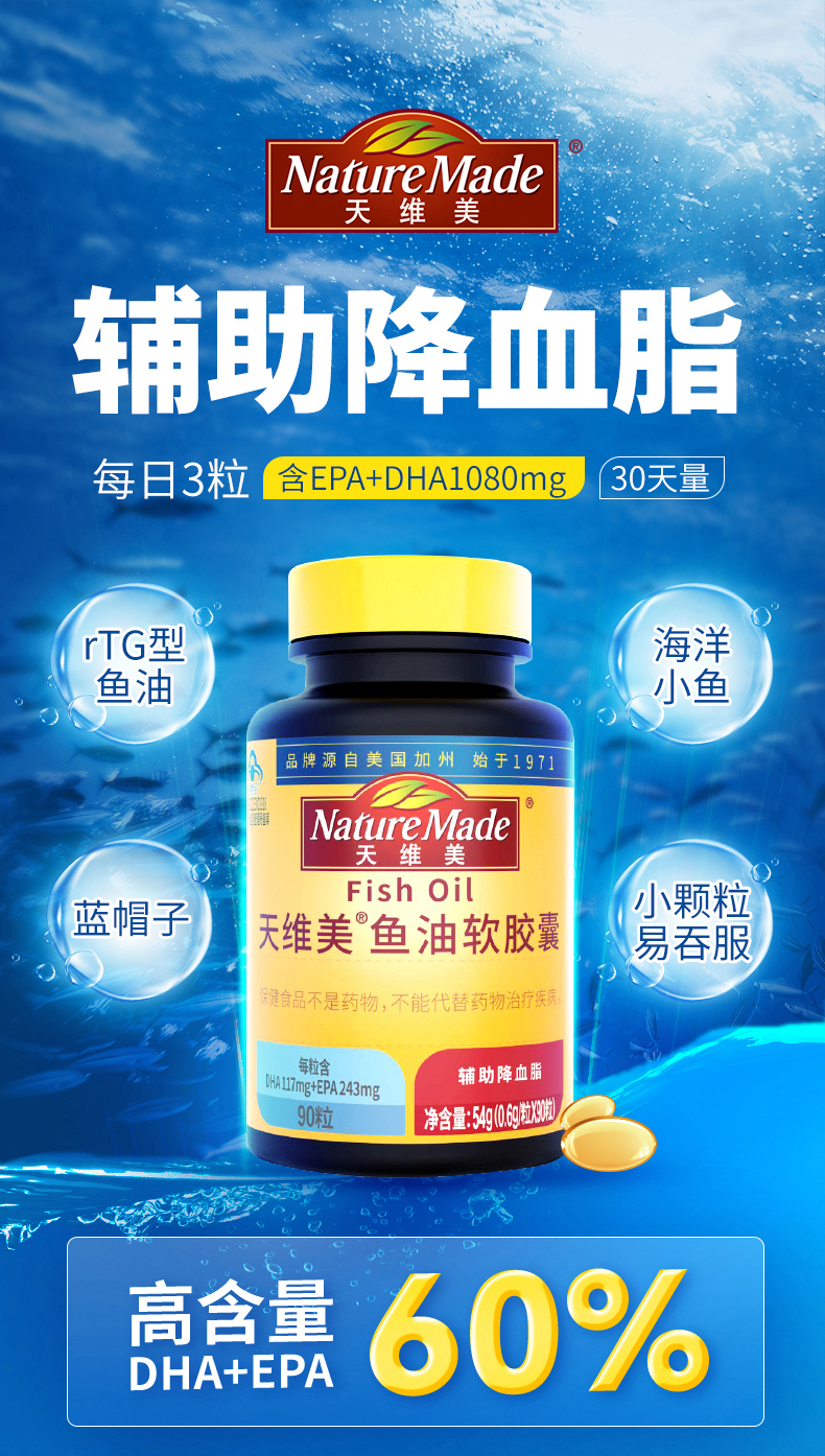 天维美鱼油软胶囊90粒/瓶(到手3瓶,3月量)山姆/Costco/ole/沃尔玛在售品牌 DHA+EPA含量60% rTG型鱼油 稳定好吸收 原料源自野生海洋小鱼 颗粒小易吞服