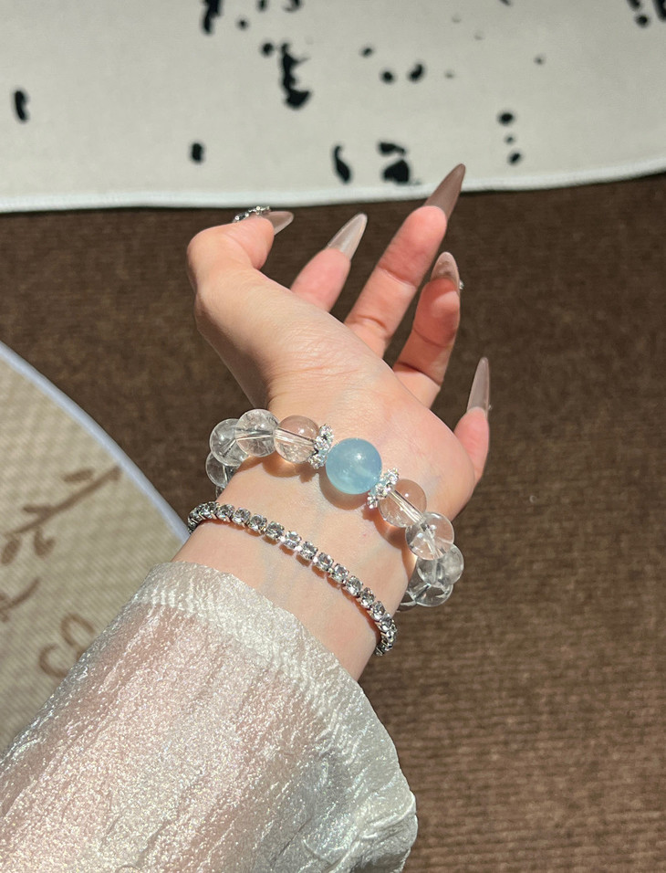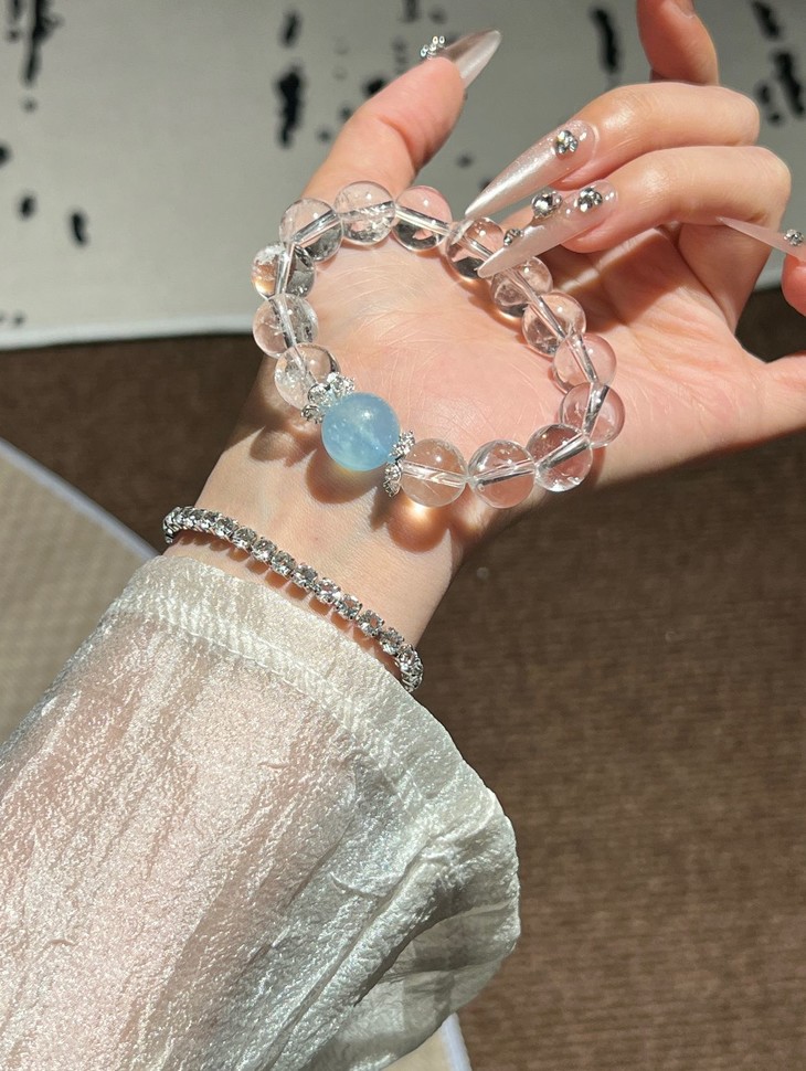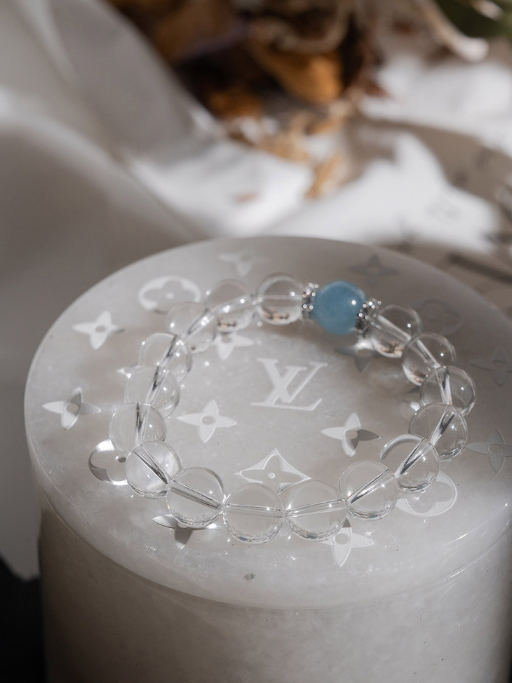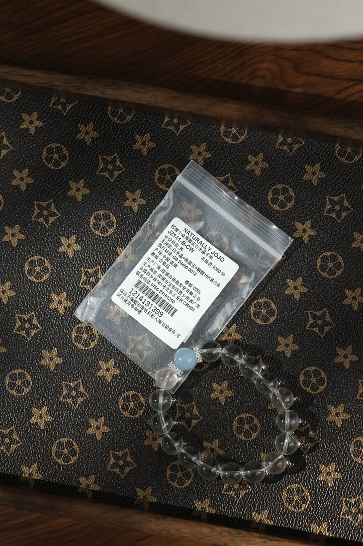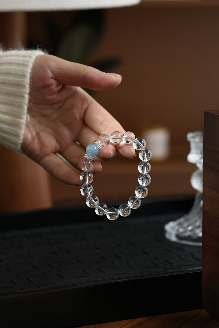 第二款:海蓝宝白水晶手串JZ141-B-CW 【材质】5A级天然白水晶+海蓝宝 【配件】铜镀18K真白金配件+进口水晶弹力线 【工艺】精细打磨抛光 【珠径】约10mm 【链长】约16cm,可微调