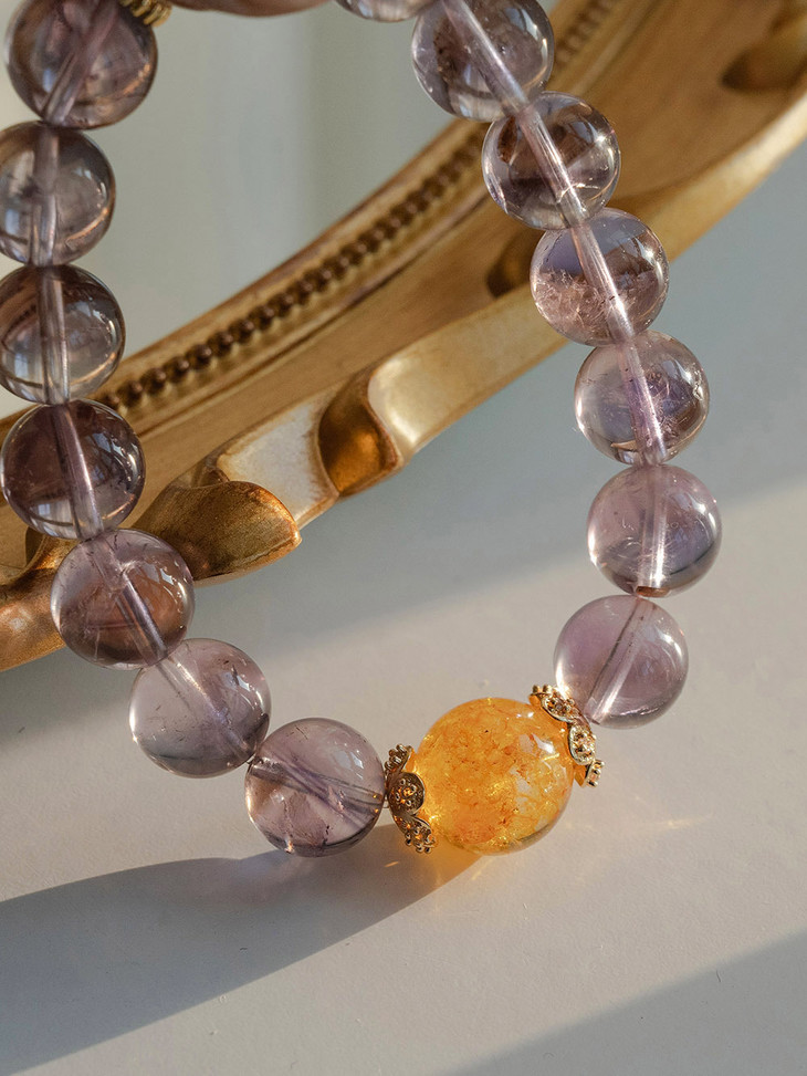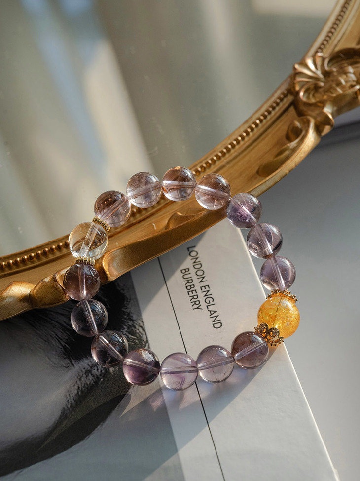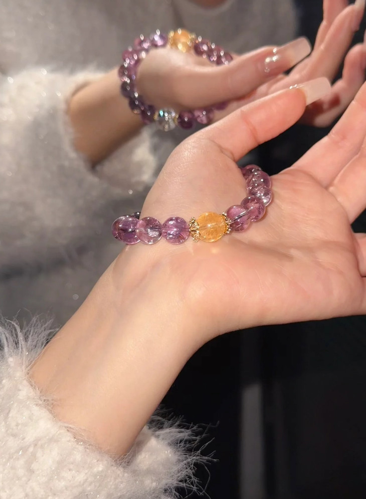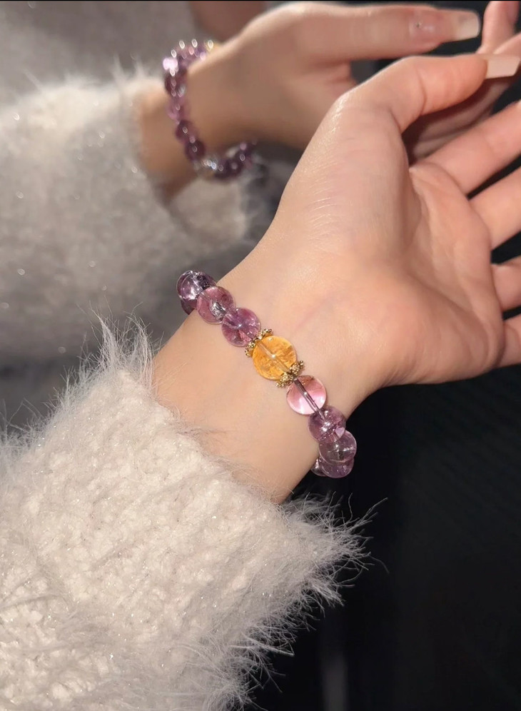 第四款:紫阿赛手水晶手链JZ001-B-CP 【材质】黄塔晶+紫水晶 【工艺】精细打磨抛光 【珍珠尺寸约】10/12mm 【链长】160.0mm