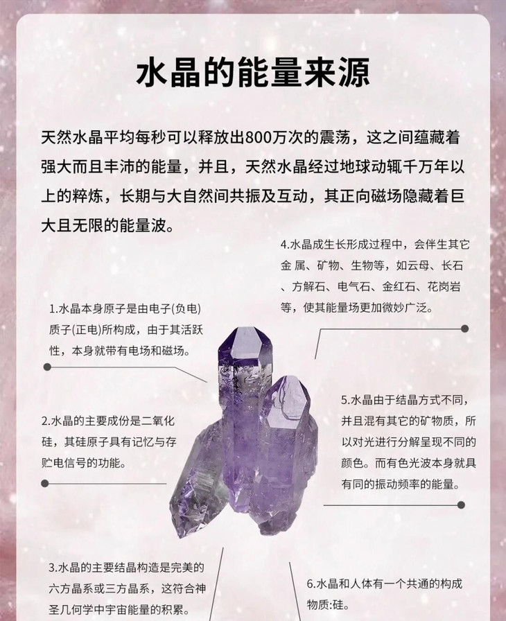 水晶作为一种矿石 具有一定频率的能量震动 量子学认为,任何物质都是能量的震动 包括我们人本身,也有自带能量磁场 水晶的能量频率会在 一定程度上改变你的固有频率 这就是从科学的角度解释 水晶改变你“运 势”的原因 你的底气来自你的能力 养好磁场成为自己的大女主 不同频率的水晶也会有不同的功效发挥 震动的频率和其结构以及颜色有关系 (高频水晶、低频水晶)