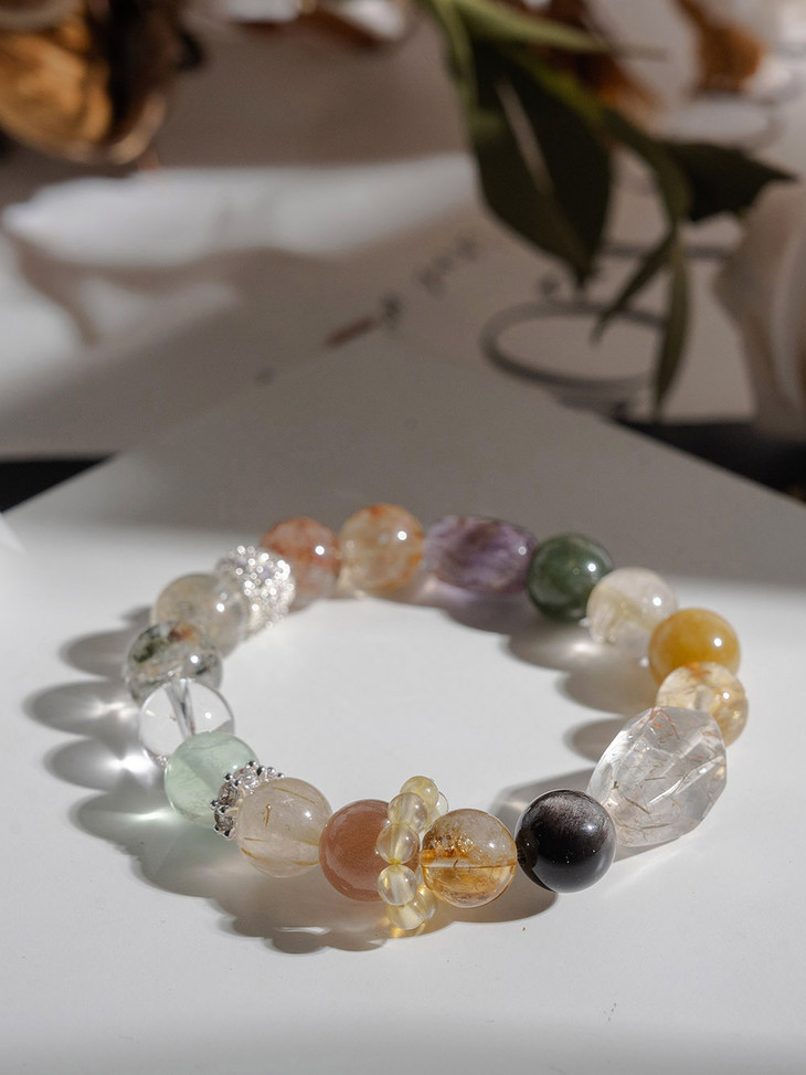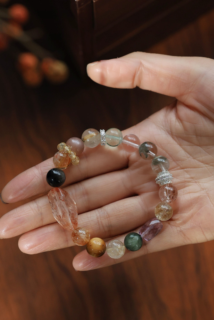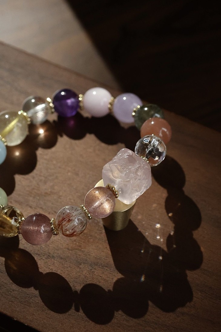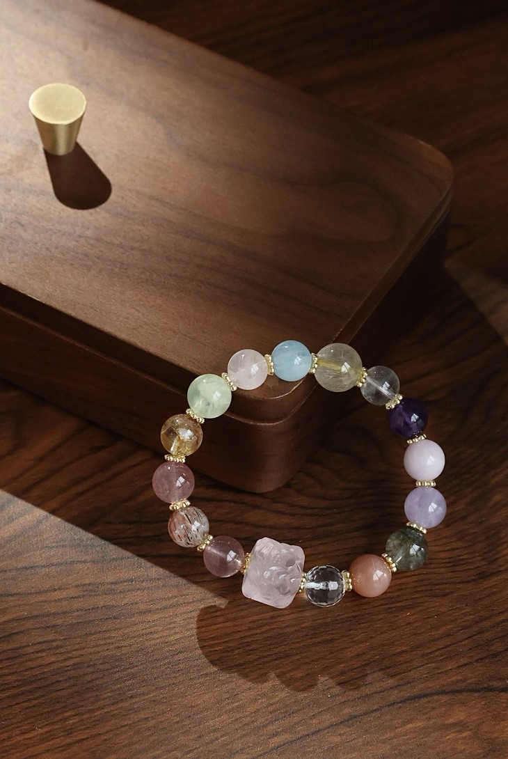 🔻天然多宝水晶手串寓意丰富 主要包括富贵、吉祥、平安、喜乐 和招财进宝的美好愿景 多宝手串通常由多种宝石串成 每一种宝石都有其独特的寓意
