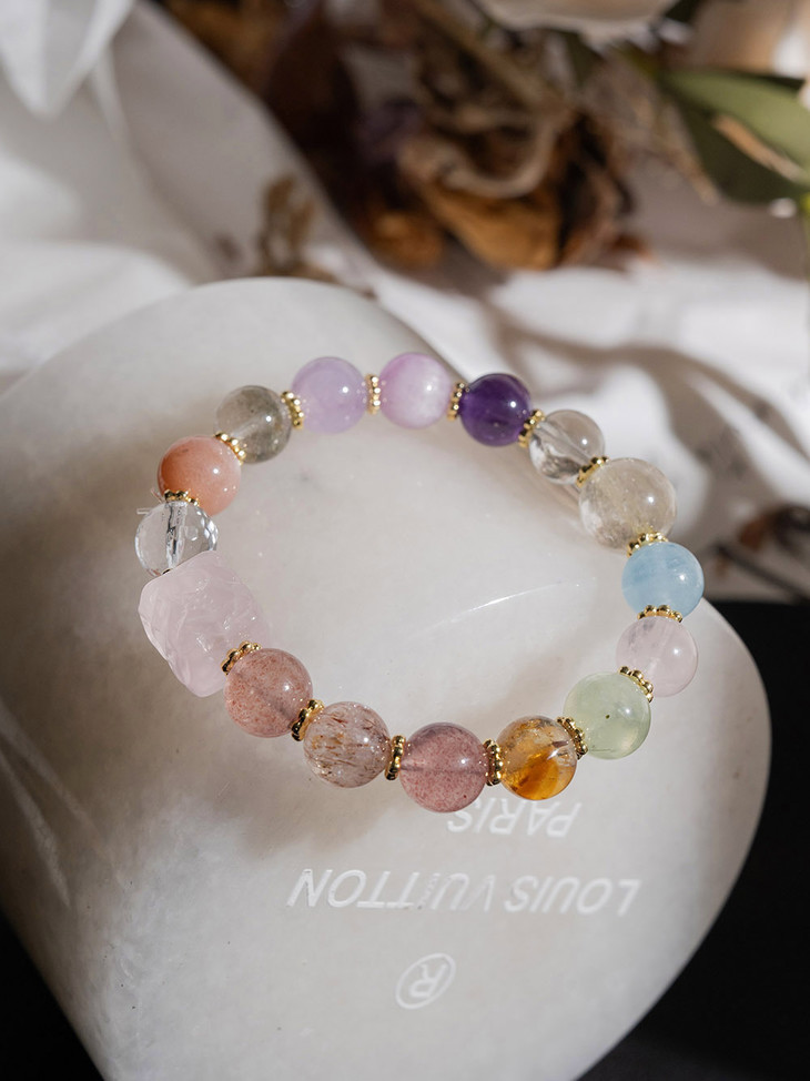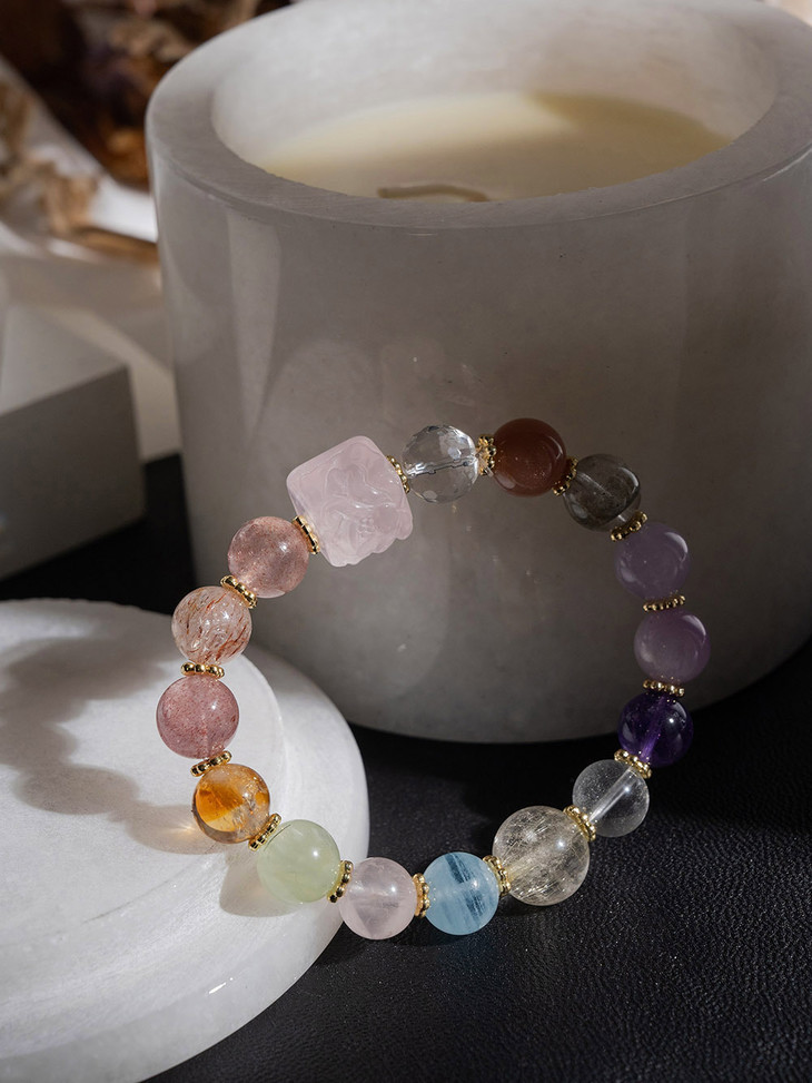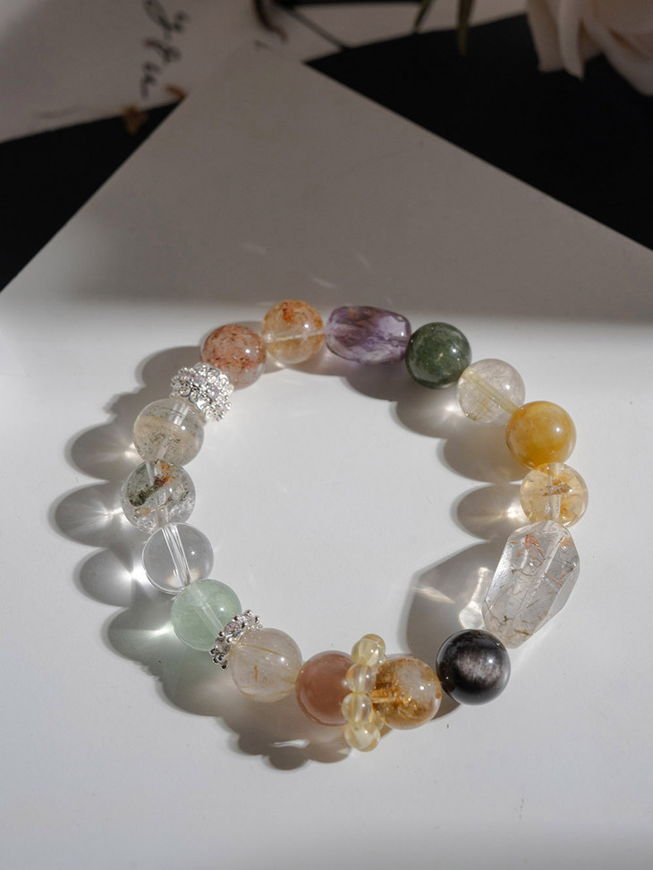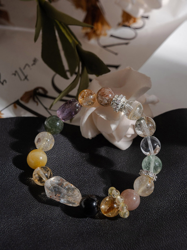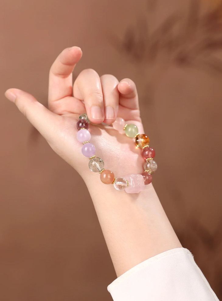 🔻天然多宝水晶手串寓意丰富 主要包括富贵、吉祥、平安、喜乐 和招财进宝的美好愿景 多宝手串通常由多种宝石串成 每一种宝石都有其独特的寓意