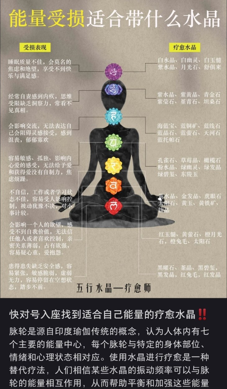 海底轮:红碧玉 象征太阳与勇气,激发你的生命力 太阳轮:黄水晶 如金黄的太阳之光,照耀你的事业与财运 本我轮:红玉髓 守护你的健康,带给你心灵的成长 喉轮:蓝纹玛瑙 平静你的情绪,促进人际沟通 顶轮:紫水晶 带来心灵的成长与创造力 心轮:孔雀石 缓解压力,吸收负面能量 眉心轮:青金石 提升你的专注力与个人能力