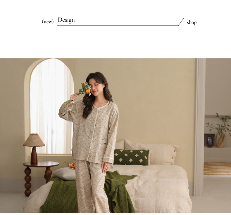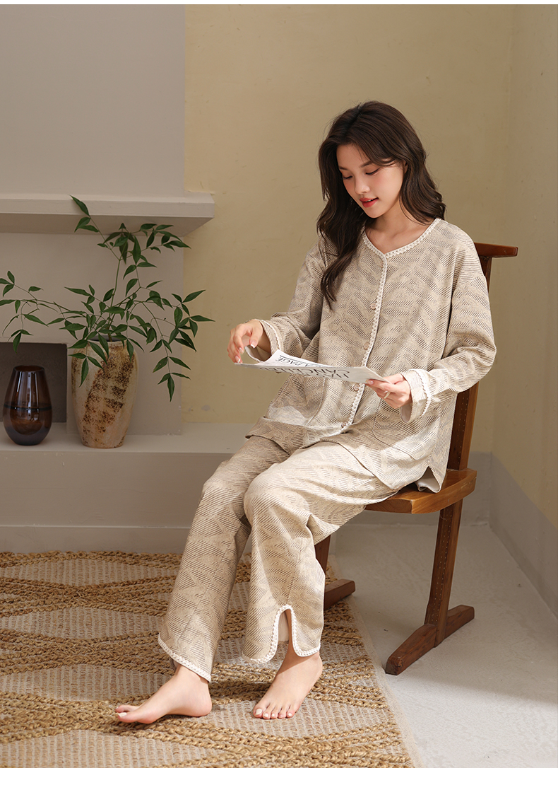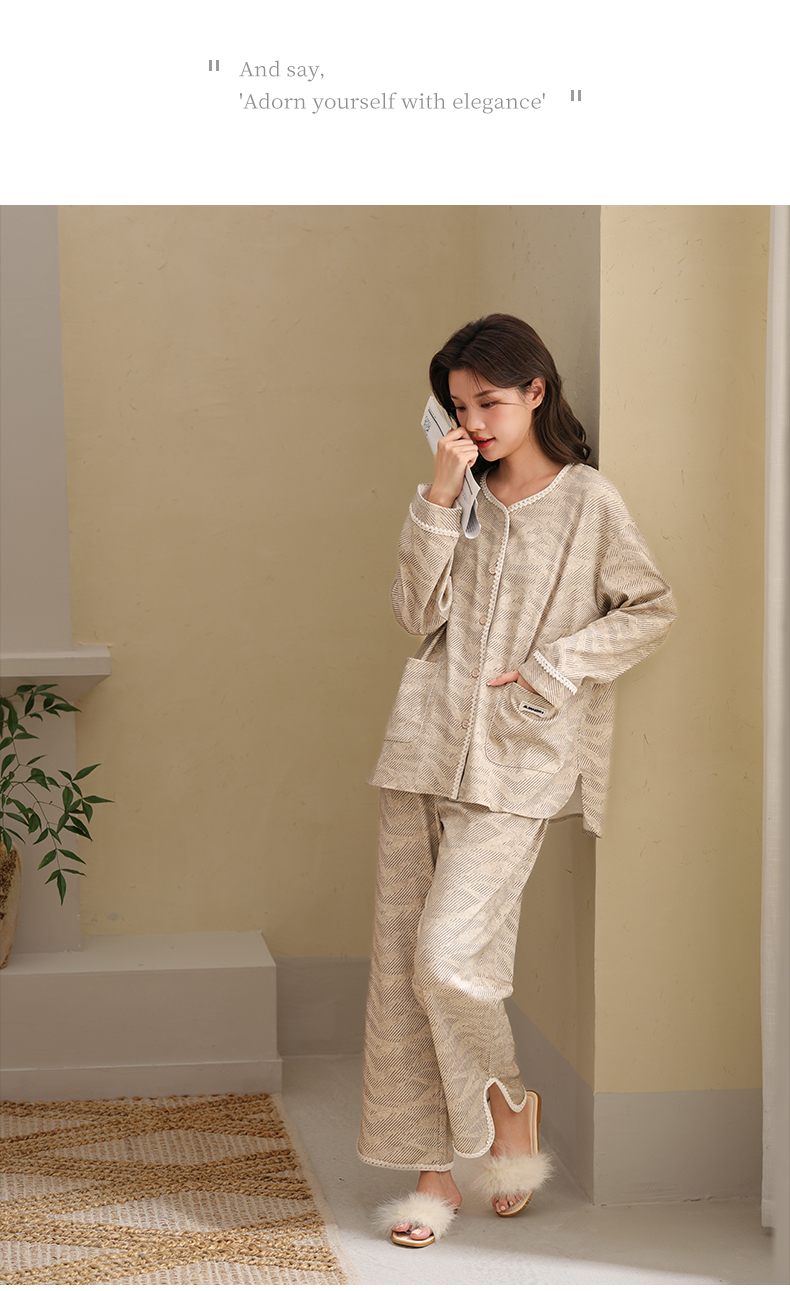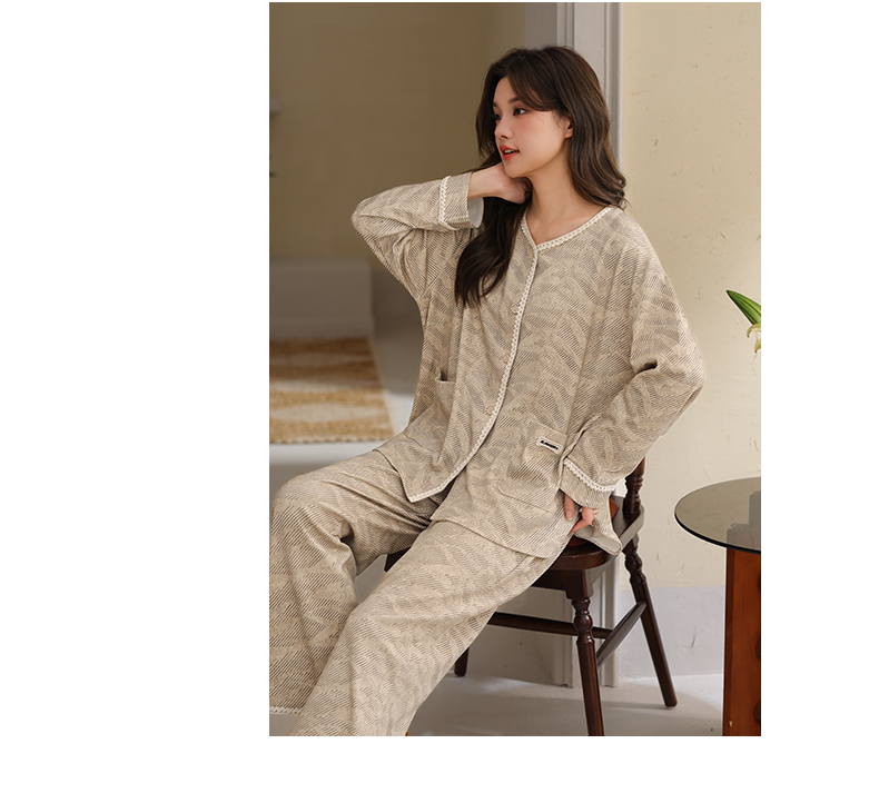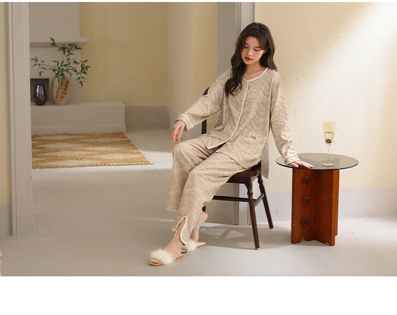 可人儿春秋季带胸垫泡泡绵女士长袖长裤睡衣可外出小众家居服套装