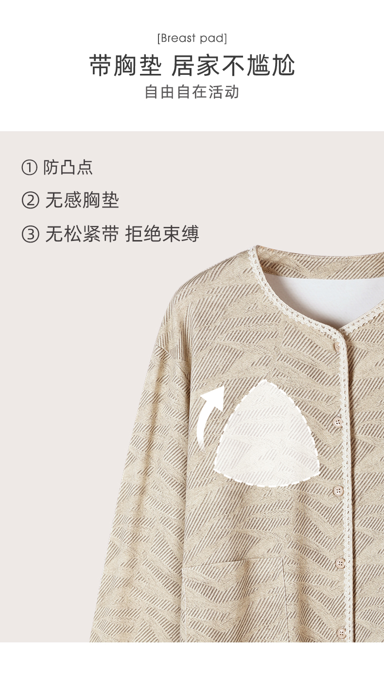 可人儿春秋季带胸垫奥力棉女士长袖长裤睡衣可外出纯棉家居服套装