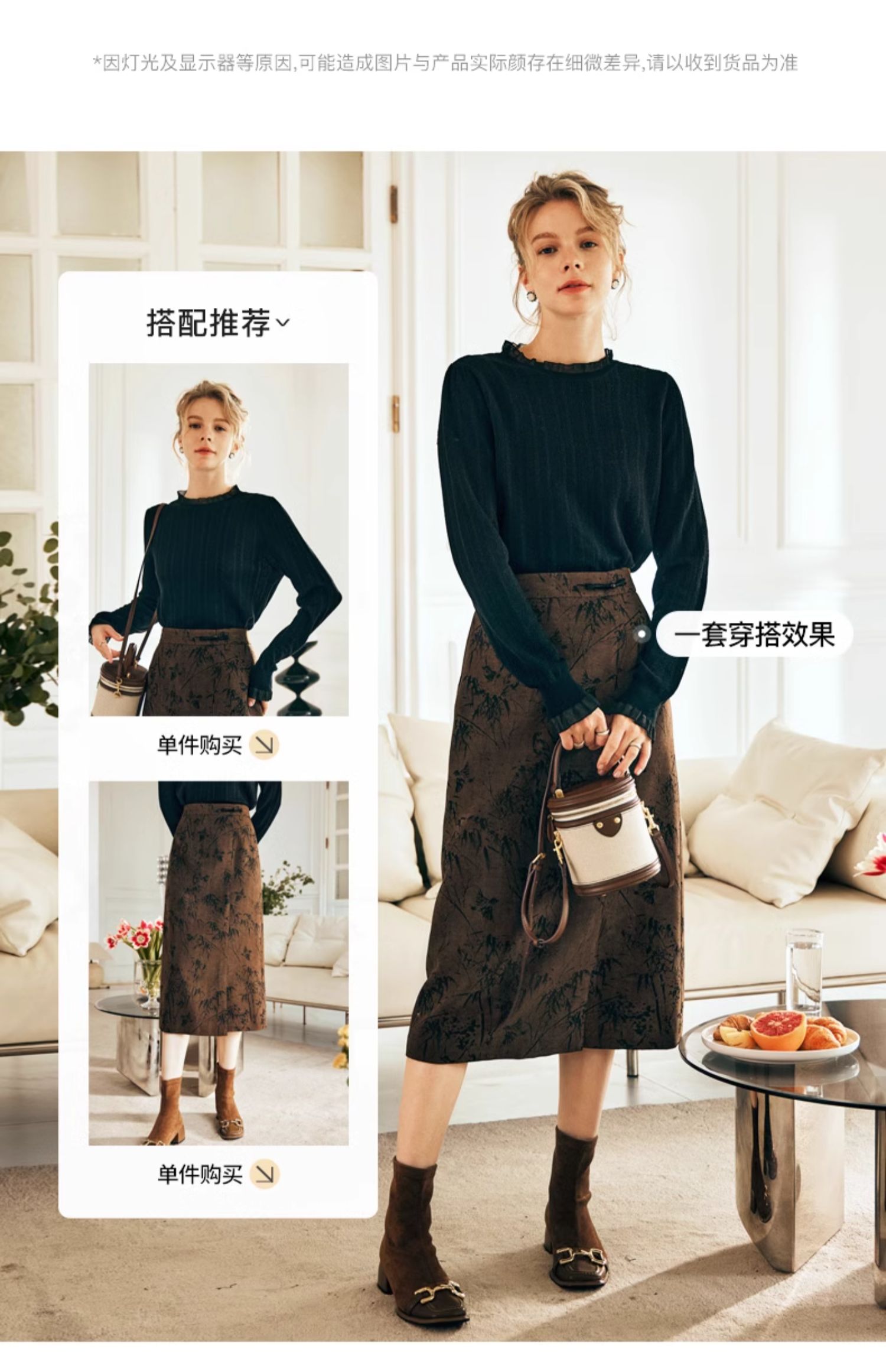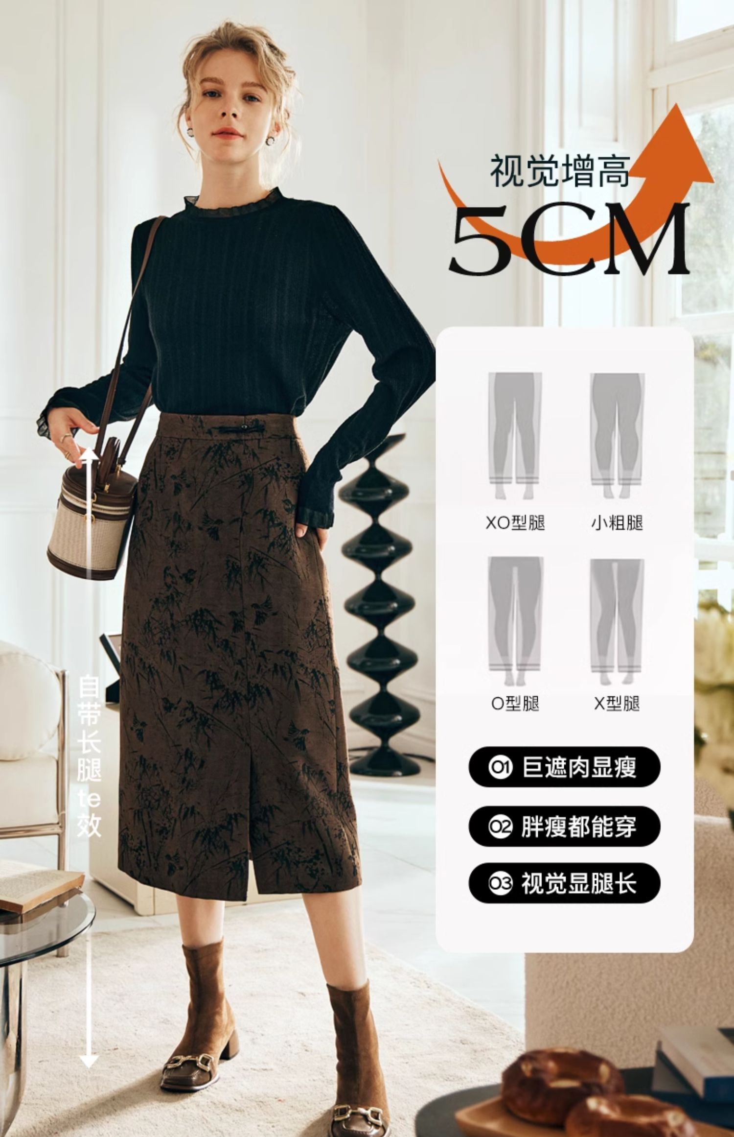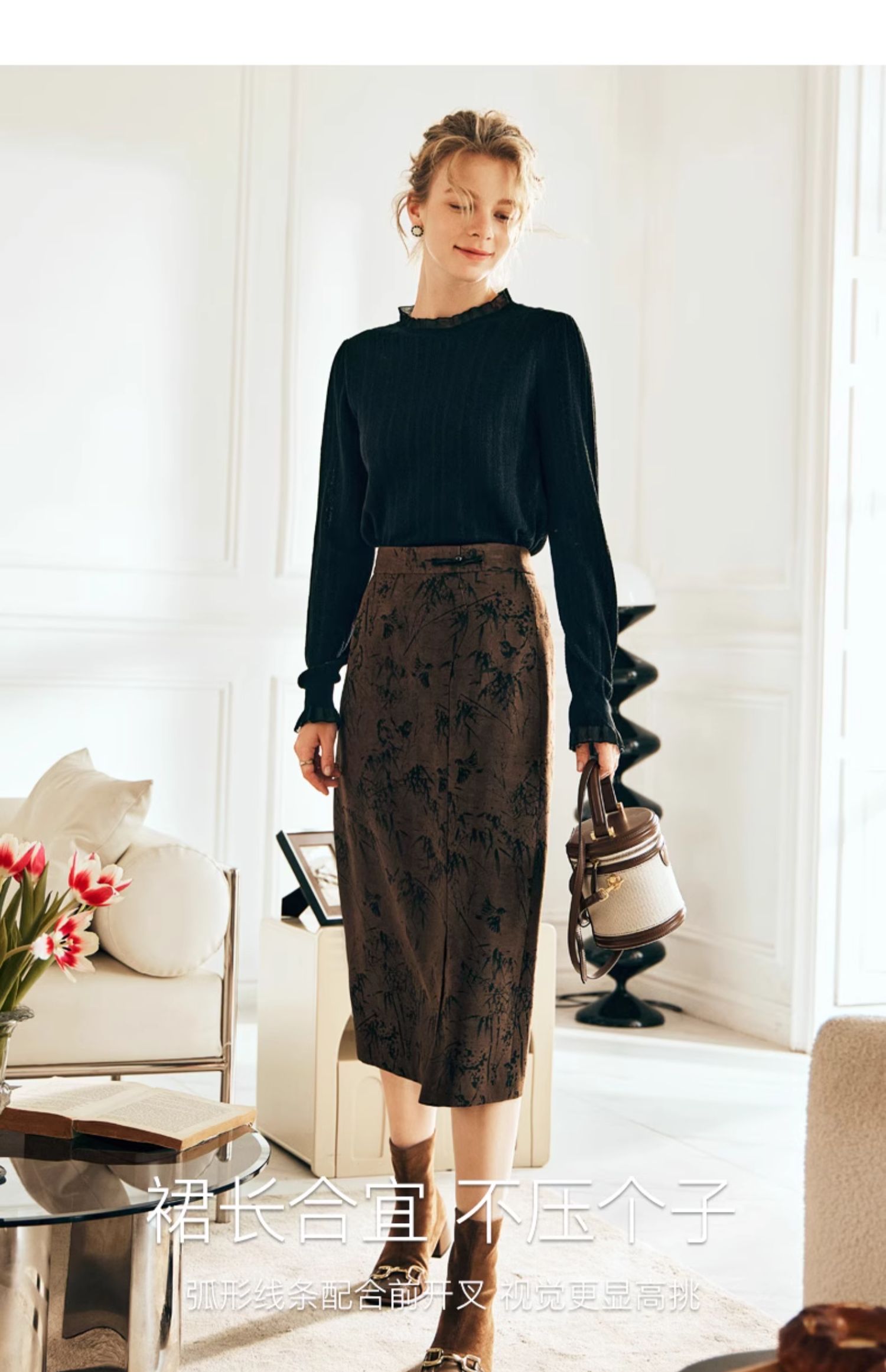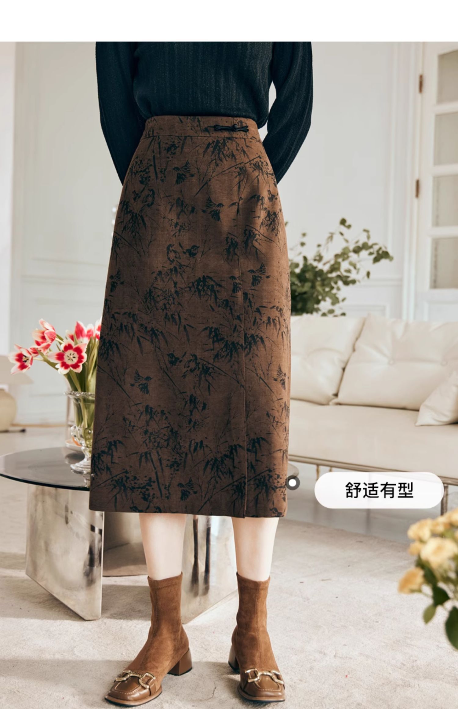 OLrain欧芮儿棕色半身裙女秋冬2023新款复古竹影新中式气质半裙
