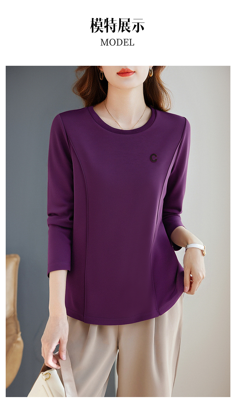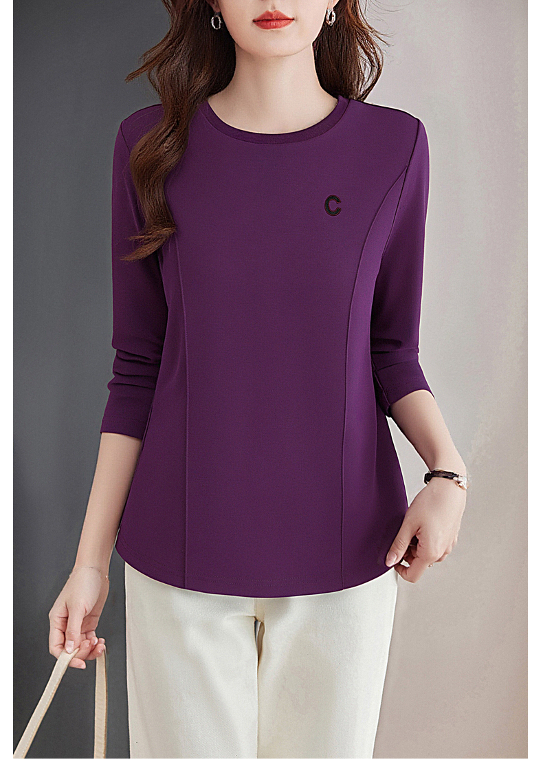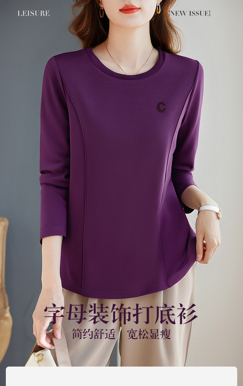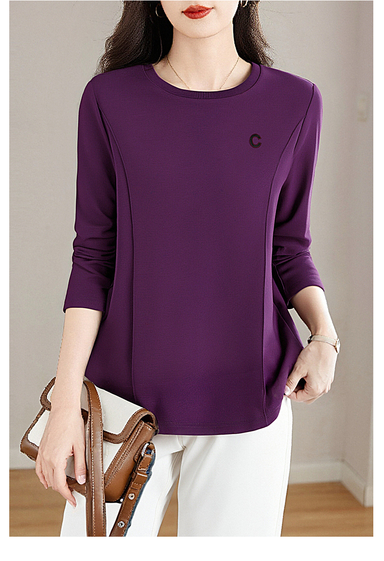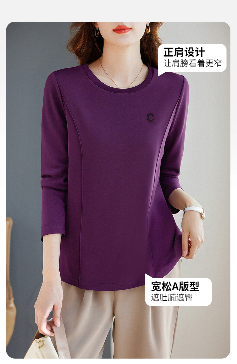 大码长袖T恤女士秋季新款薄款正肩紫色上衣遮肚子显瘦女装打底衫