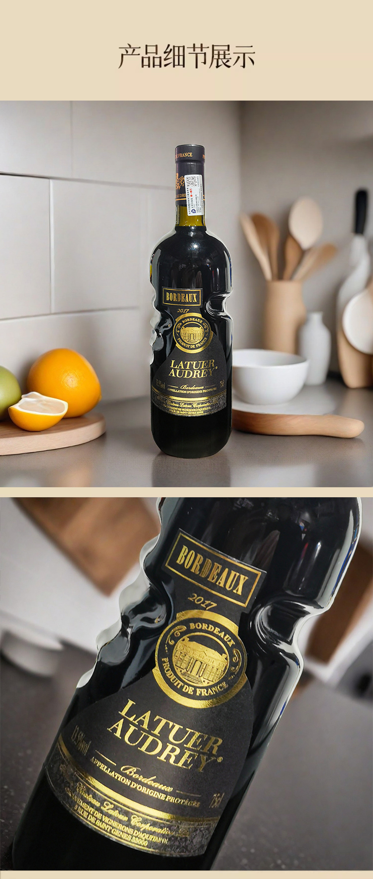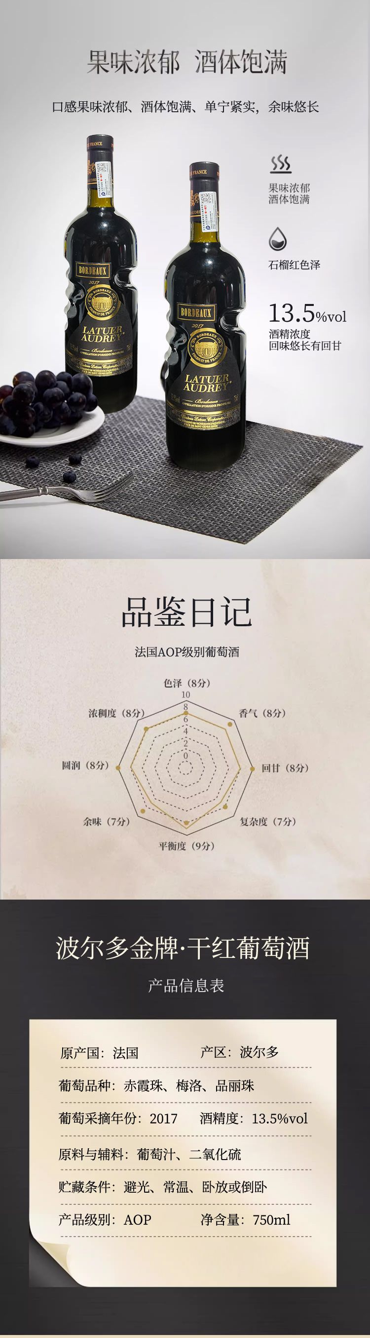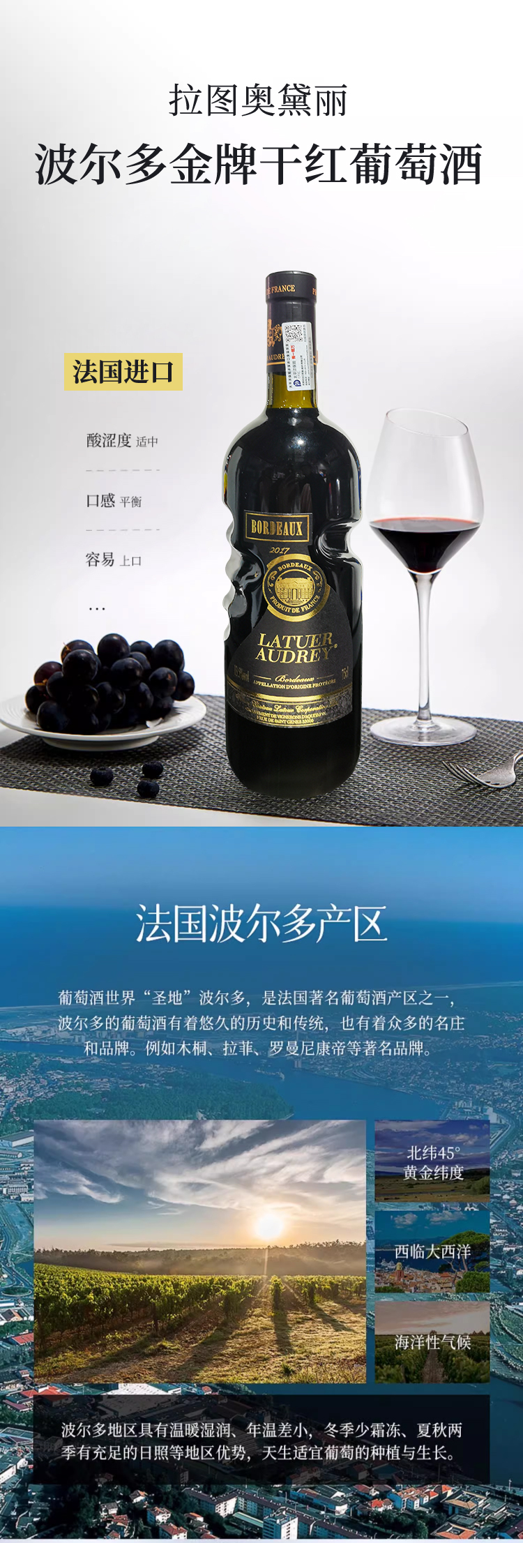 法国进口拉图奥黛丽波尔多金牌干红葡萄酒750ml