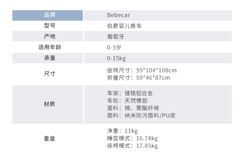 BEBECAR葡萄牙进口婴儿车欧洲高景观避震伯爵贵族四轮婴儿推车(含睡篮)