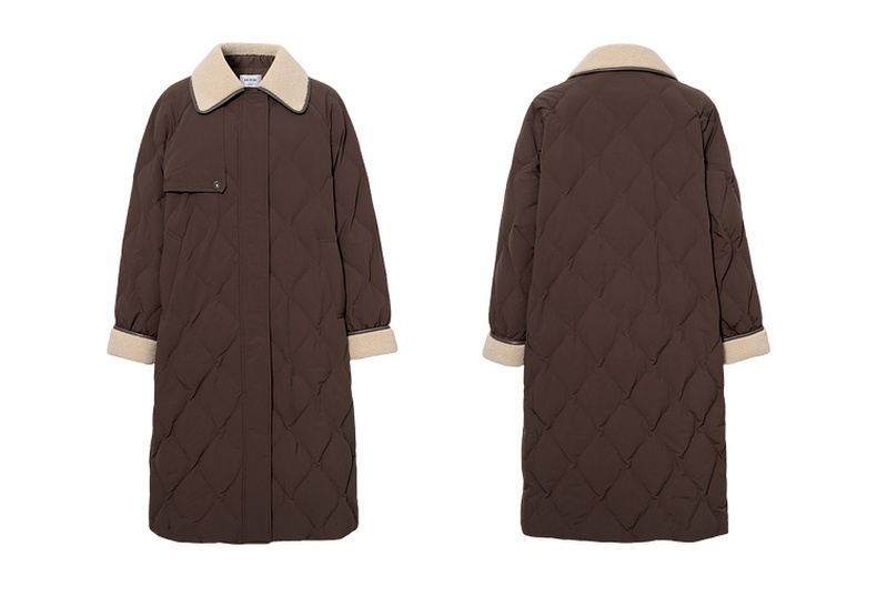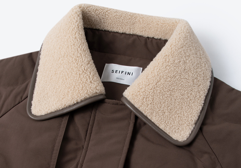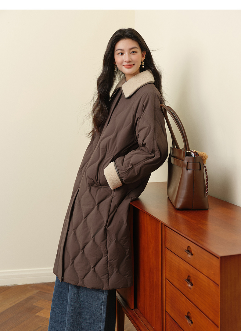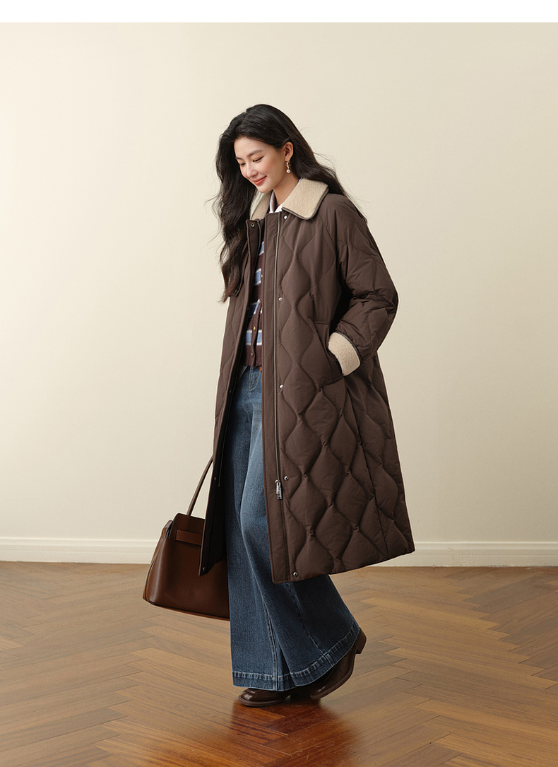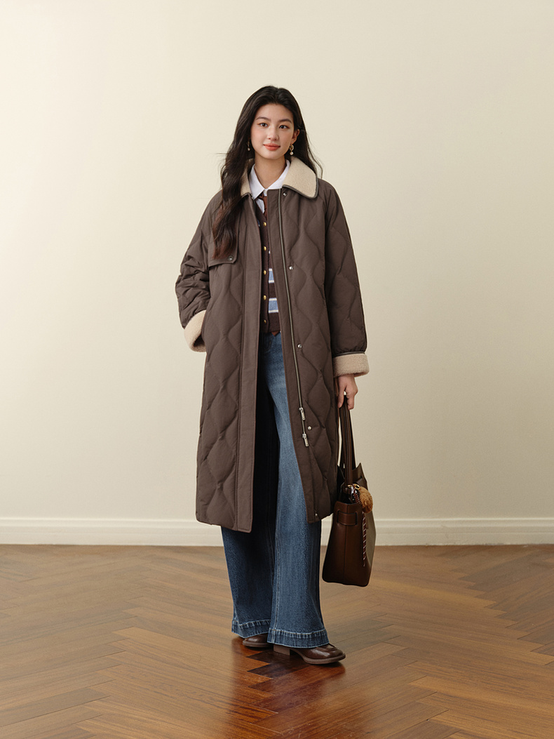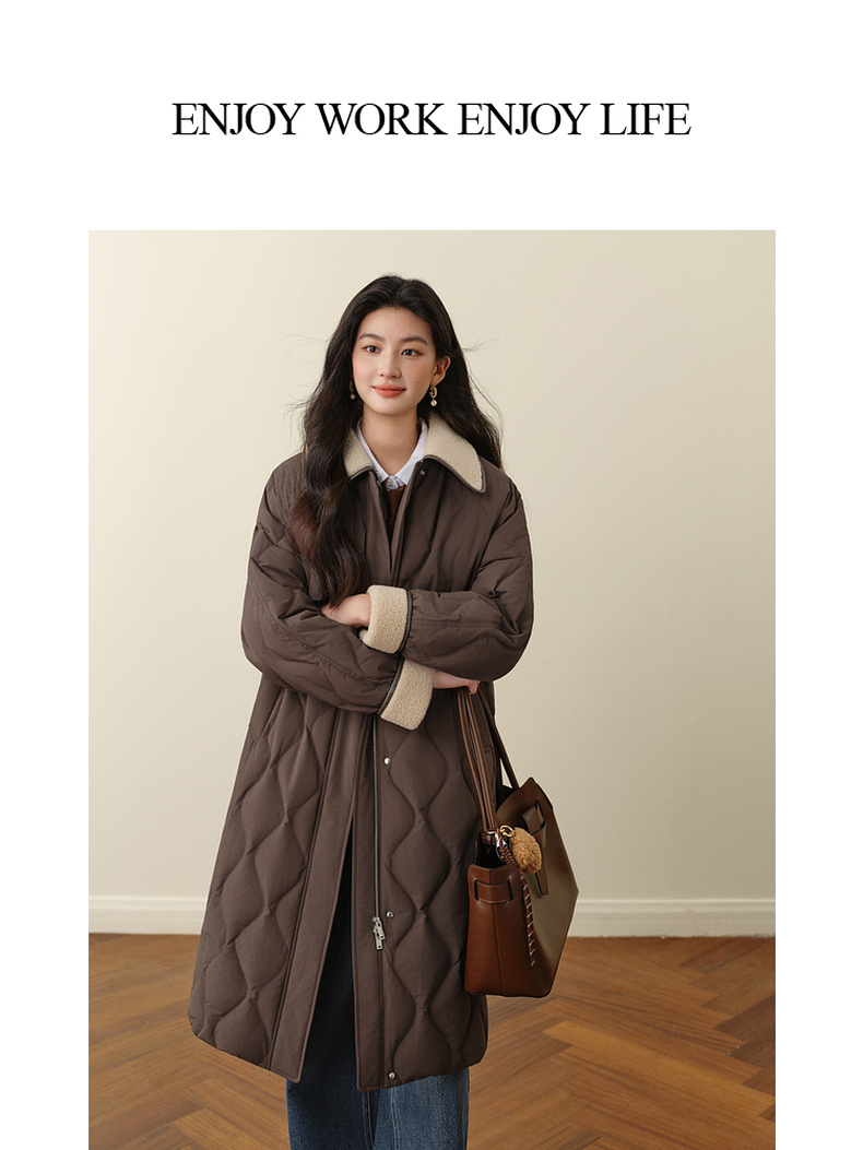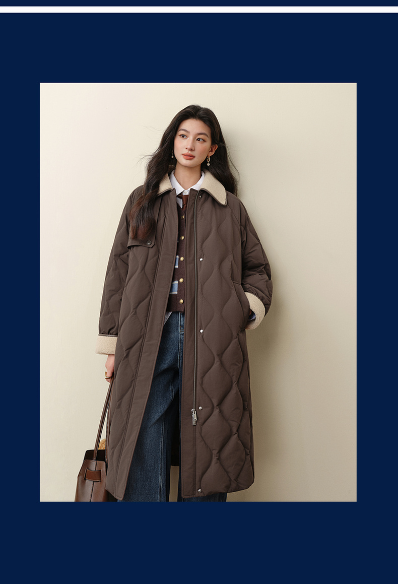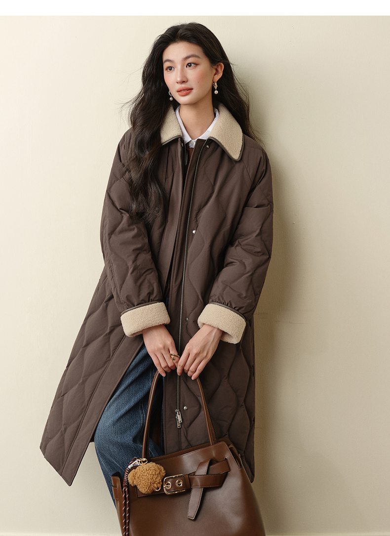【严选】诗凡黎翻领巴恩风长款保暖外套2025秋冬新款拼接羊羔毛领羽绒服女7GA180061