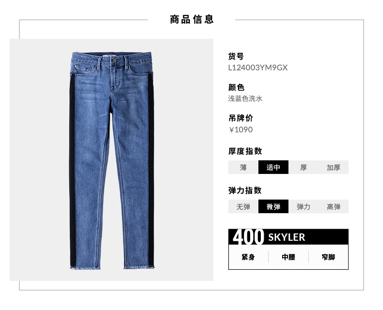 Lee商场同款女款浅蓝色贴身小脚九分牛仔裤新款L124003YM9GX