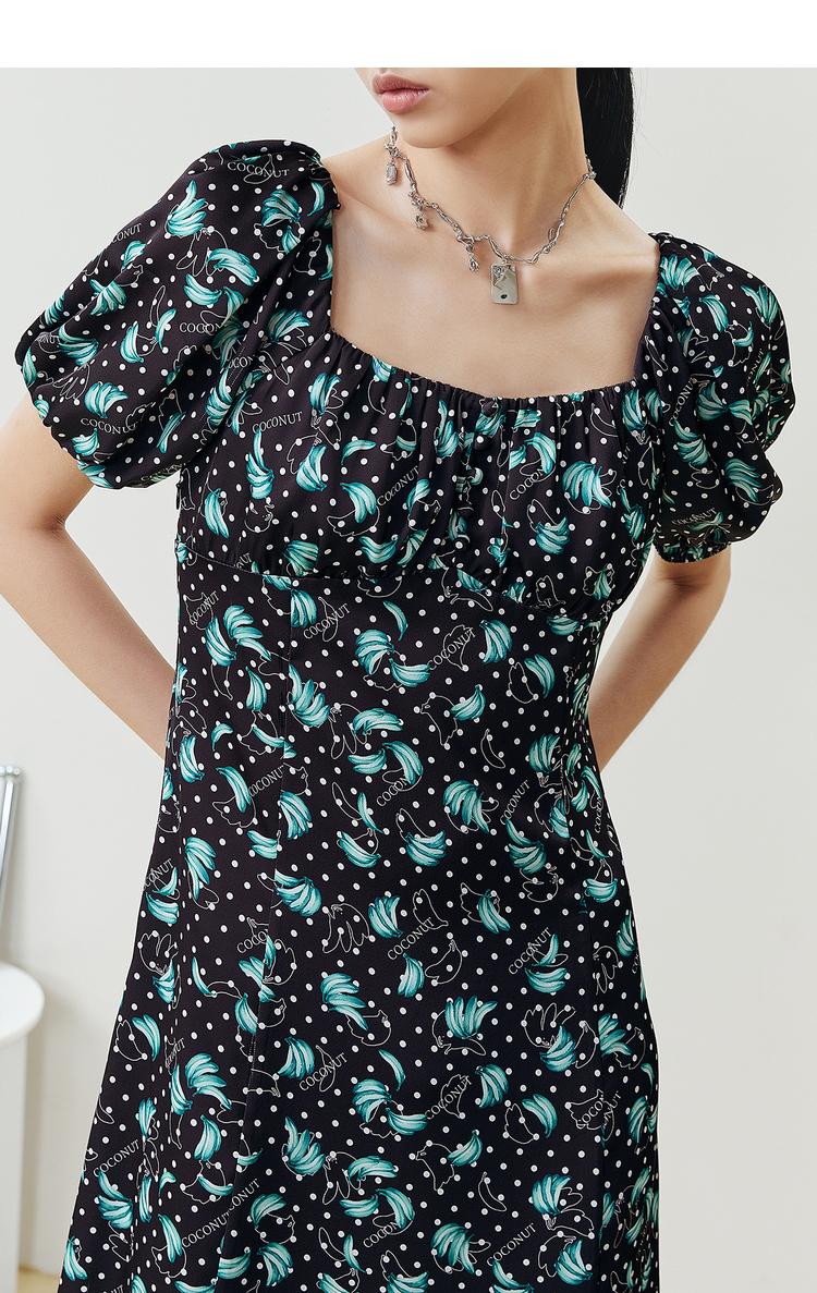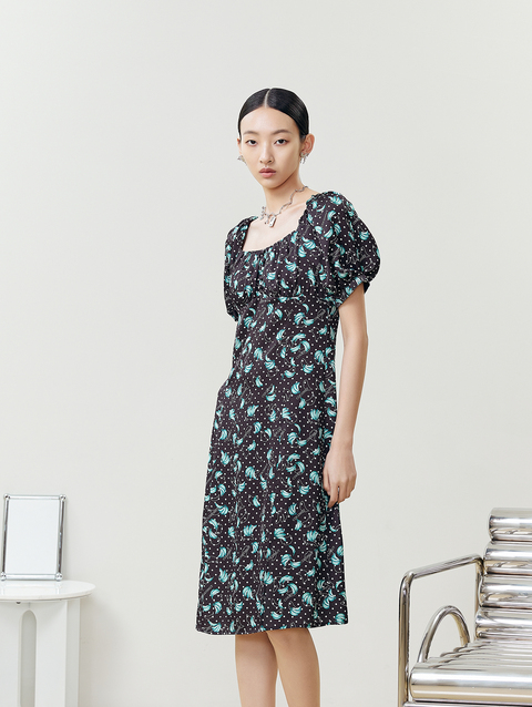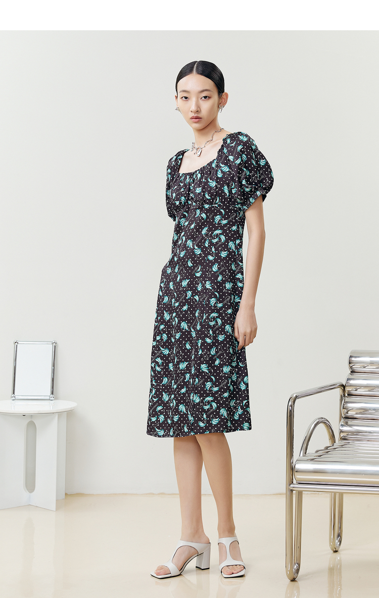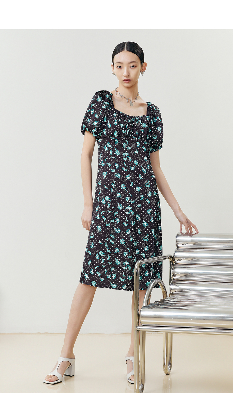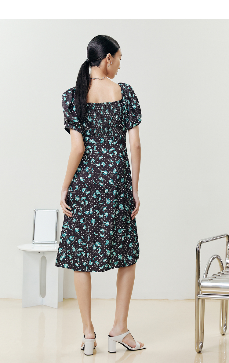 NEELLY纳俪商场同款法式满印连衣裙女方领泡泡袖收腰A字裙中长款