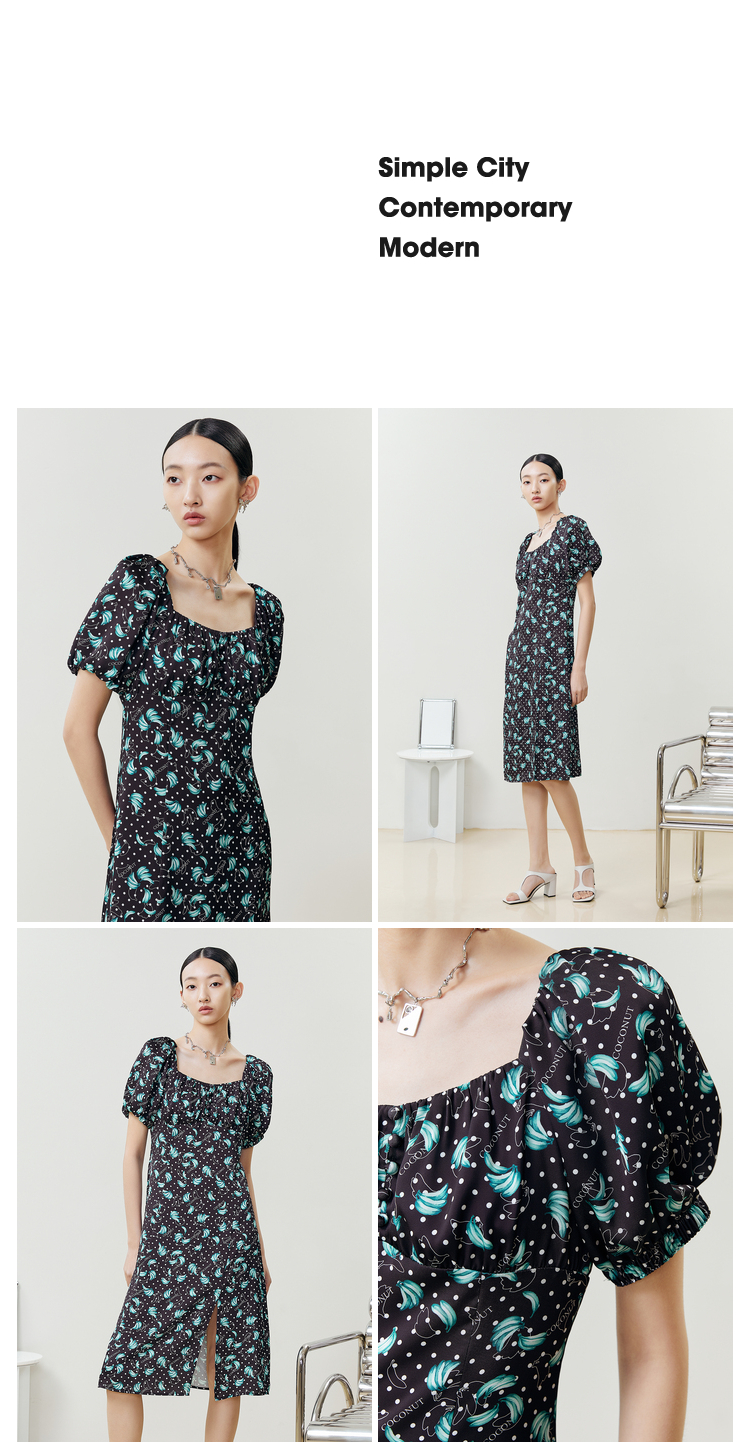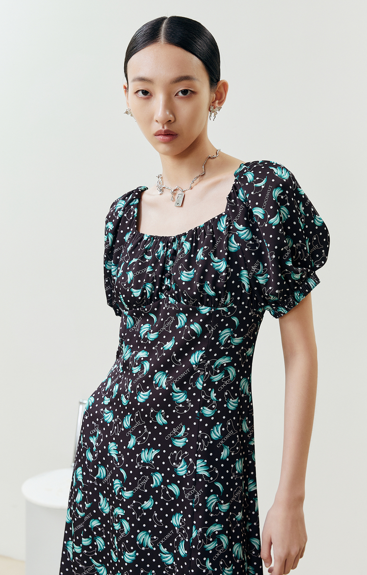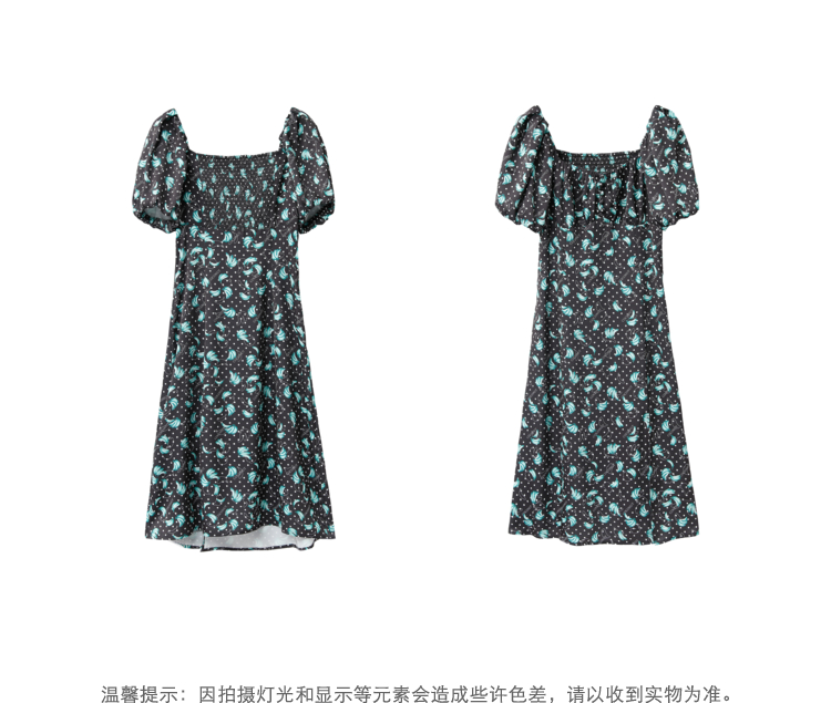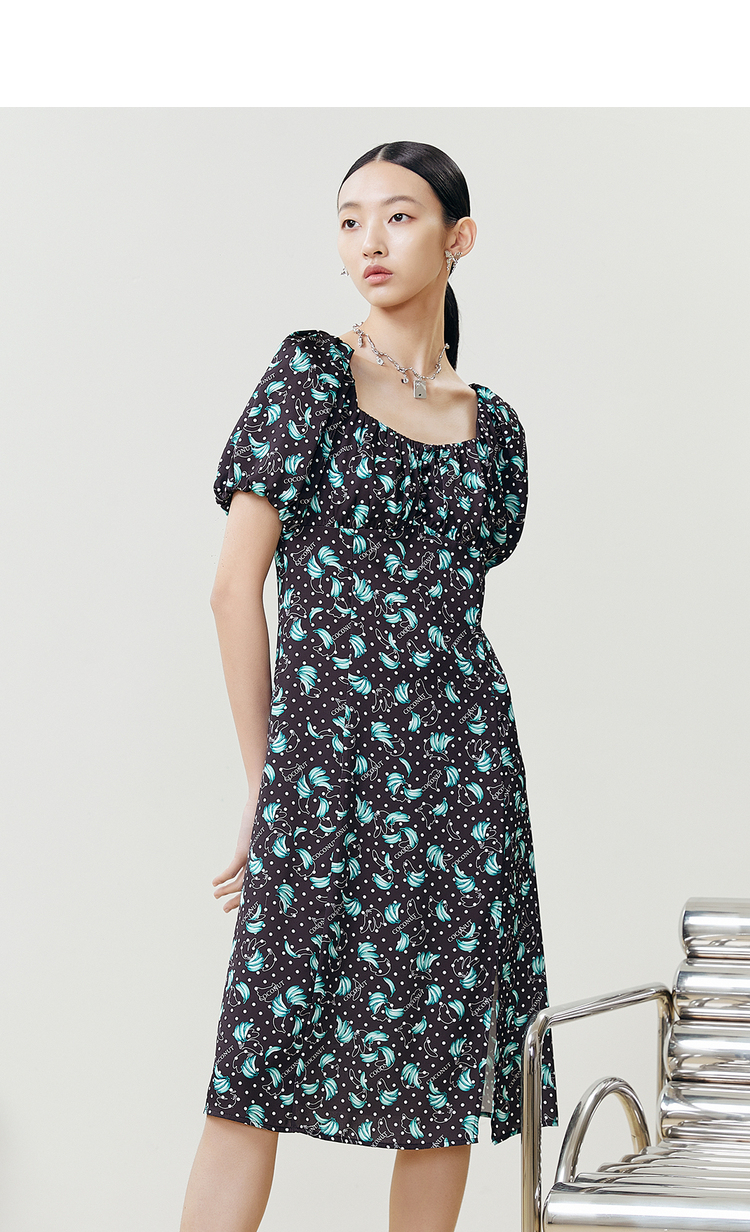 NEELLY纳俪商场同款法式满印连衣裙女方领泡泡袖收腰A字裙中长款