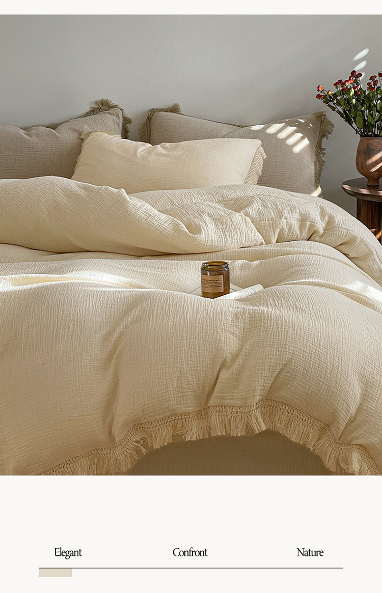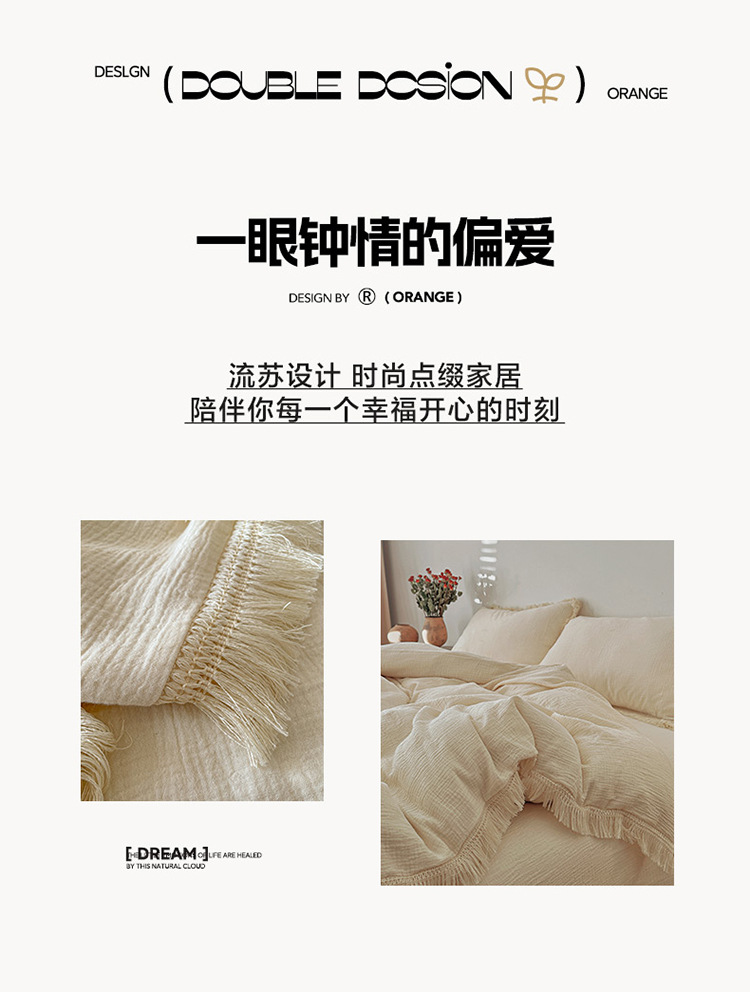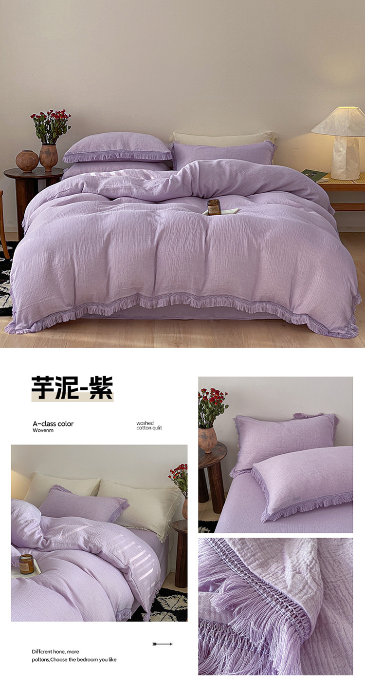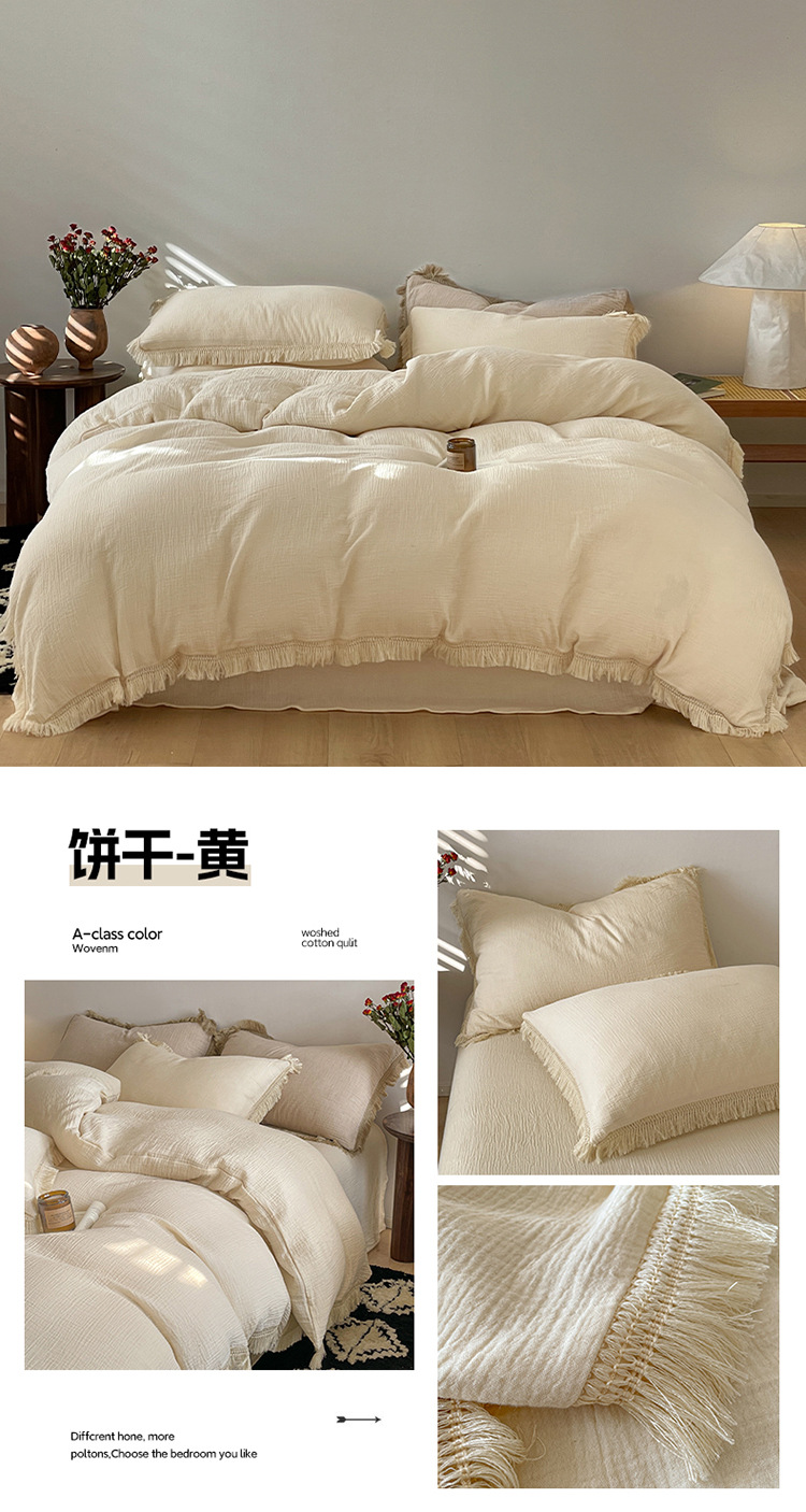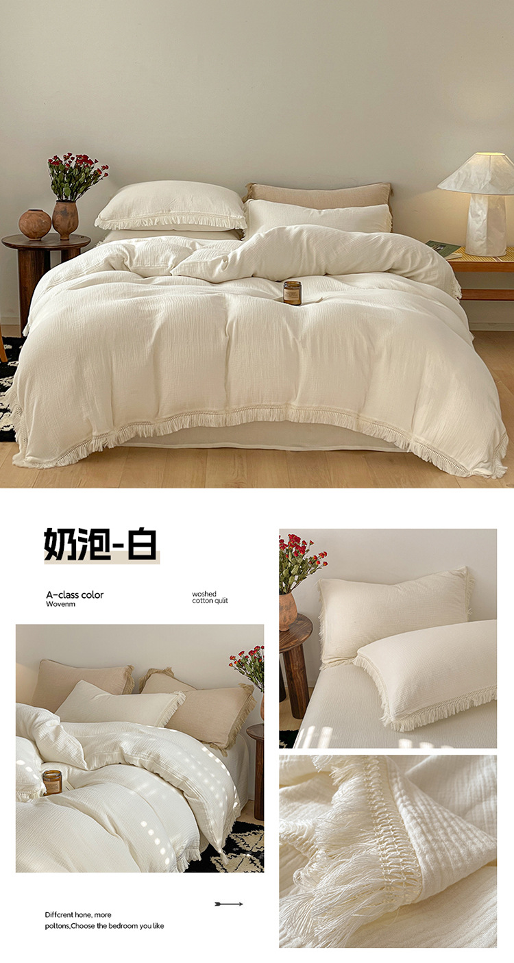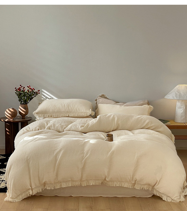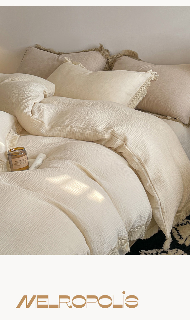 【A类纯棉皱皱纱流苏四件套】全棉双层纱皱皱纱流苏款四件套床品被套纯色A类件套
