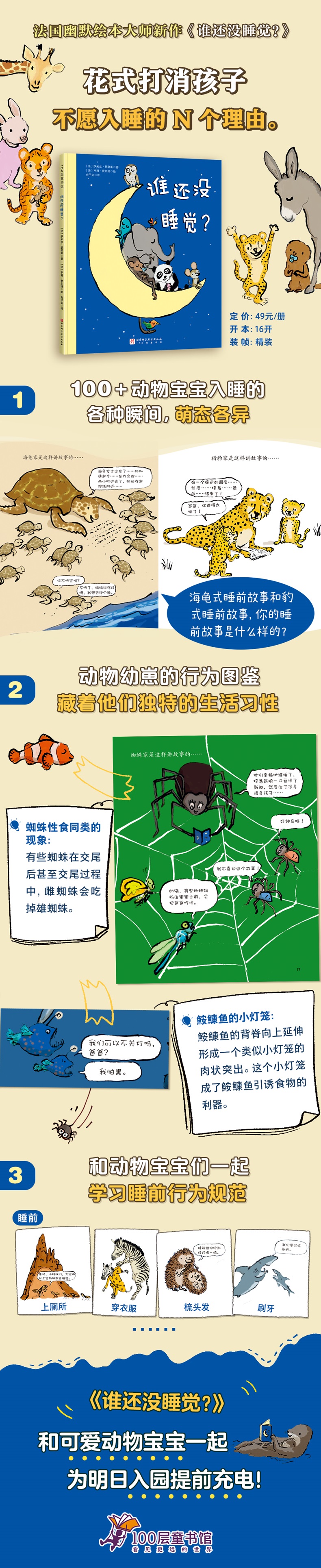 本书是给2-5岁宝宝的晚安主题、睡前哄睡绘本。书中有几十位动物宝宝搞笑上演睡前名场面,磨磨蹭蹭的、走神的、调皮的、毛毛躁躁……肯定有跟自己最像的那一只!法国幽默动物绘本大师萨米尔·瑟努斯的作品,他总是用想象力丰富又幽默的小动物带孩子预演成长的关键瞬间。《谁还没睡觉?》中,孩子会在其他磨磨蹭蹭,不愿入睡,只想多听一个故事的小动物身上找到自己的影子,也感受到爸爸妈妈的爱,美美入睡,为新的一天积攒更多的能量。