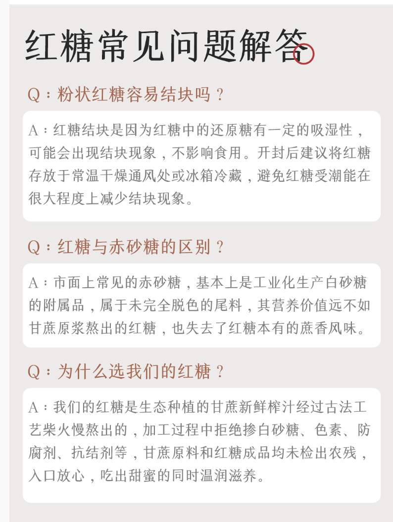 粉状的红糖是我们主推的口味,方便大家在不同的使用场景下食用,红糖粉融水易话,使用量随取方便,可以烹饪做菜肴的时候使用,代替甜味调味品增甜增鲜;可以在做甜点和糖水的时候使用等。