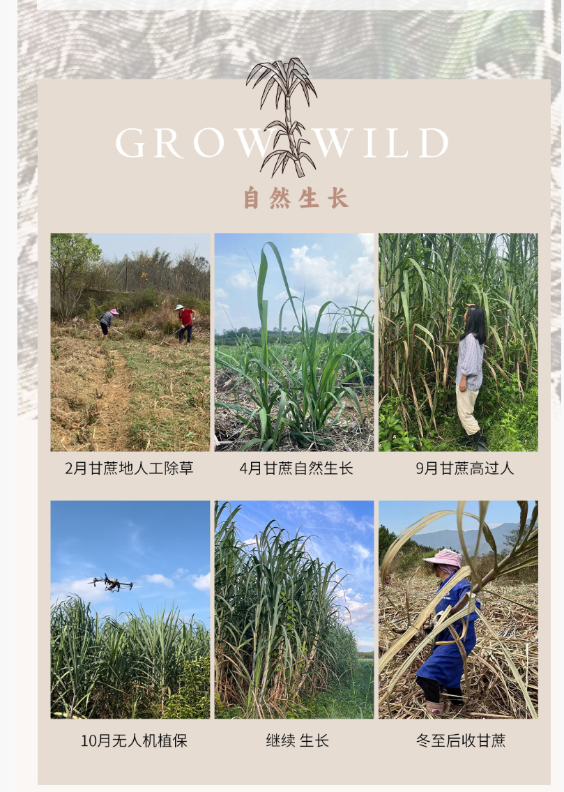 纯甘蔗做出来的红糖还有一个不可避免的问题就是,原料甘蔗在种植过程中存在的一个生产管理方式的问题就是,常规种植的甘蔗是会使用除草剂来代替人工除草的,会使用化学肥料和农药进行投入生产的,所以常规的甘蔗是吃有限的营养元素的氮磷钾肥速效的,甘蔗根系不会深扎于土壤自己寻找养分。这样的甘蔗加工出来的红糖营养价值相对低,还可能会有农药的残留。