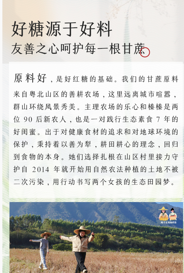 当我们两个90后吃素的小姑娘,碰在一起,决定做一款纯植物加工、不加任何添加的素红糖时,身边朋友都纷纷劝阻:这玩意儿本来就便宜,种植加工又麻烦又辛苦,直接找工厂做不就好了,哪有小姑娘钻进大山里种甘蔗的~