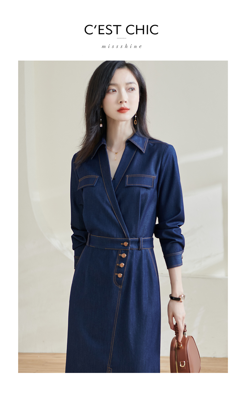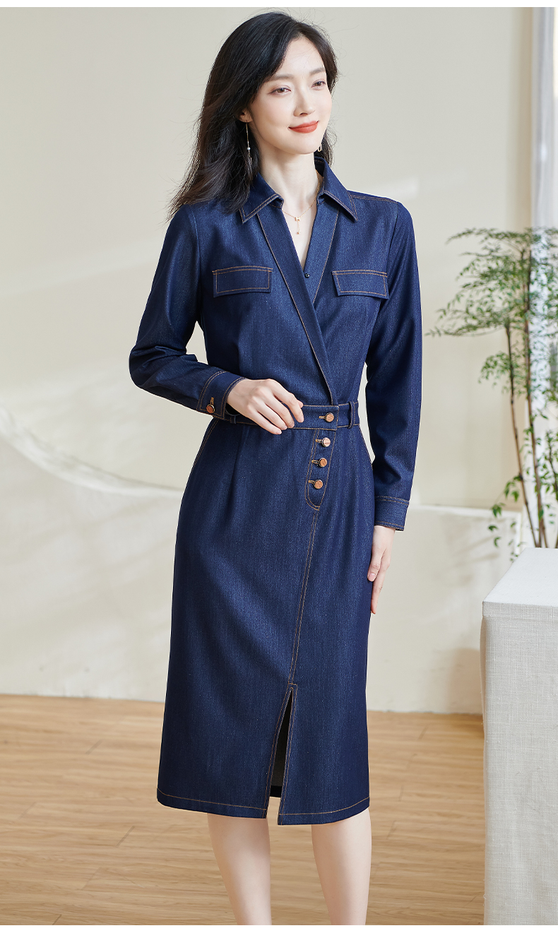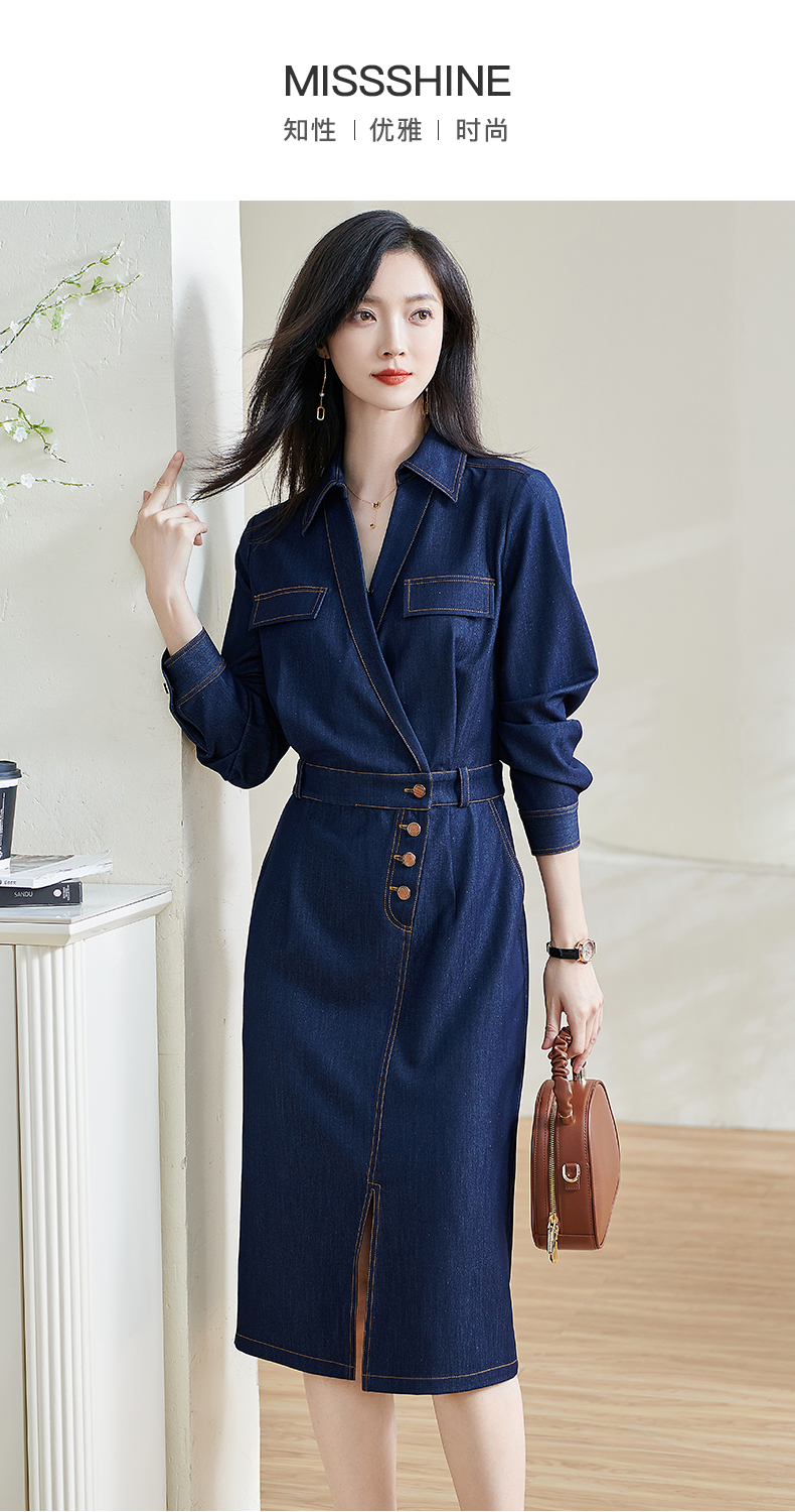 米思阳2026春季新款复古时尚牛仔连衣裙收腰弹力开叉一步裙女0638