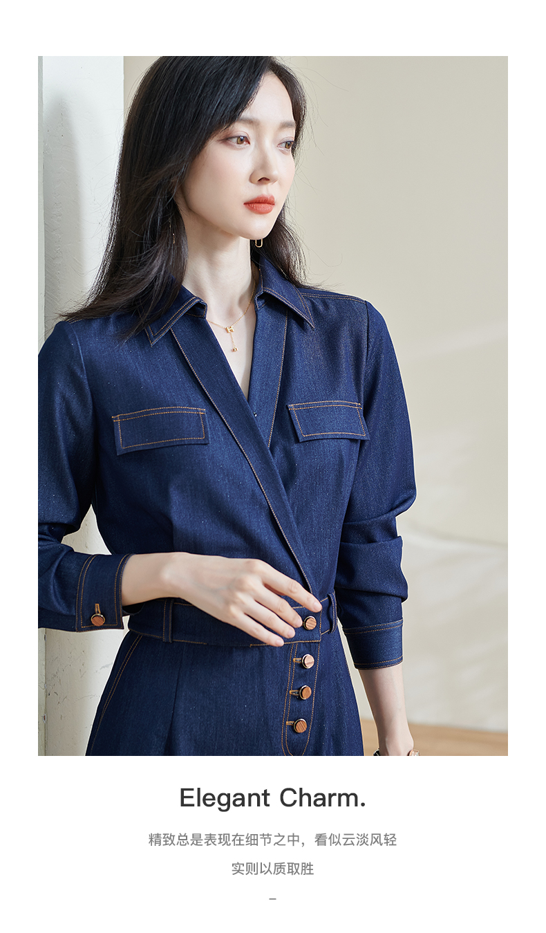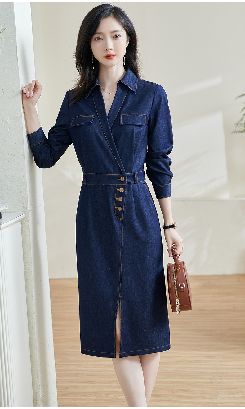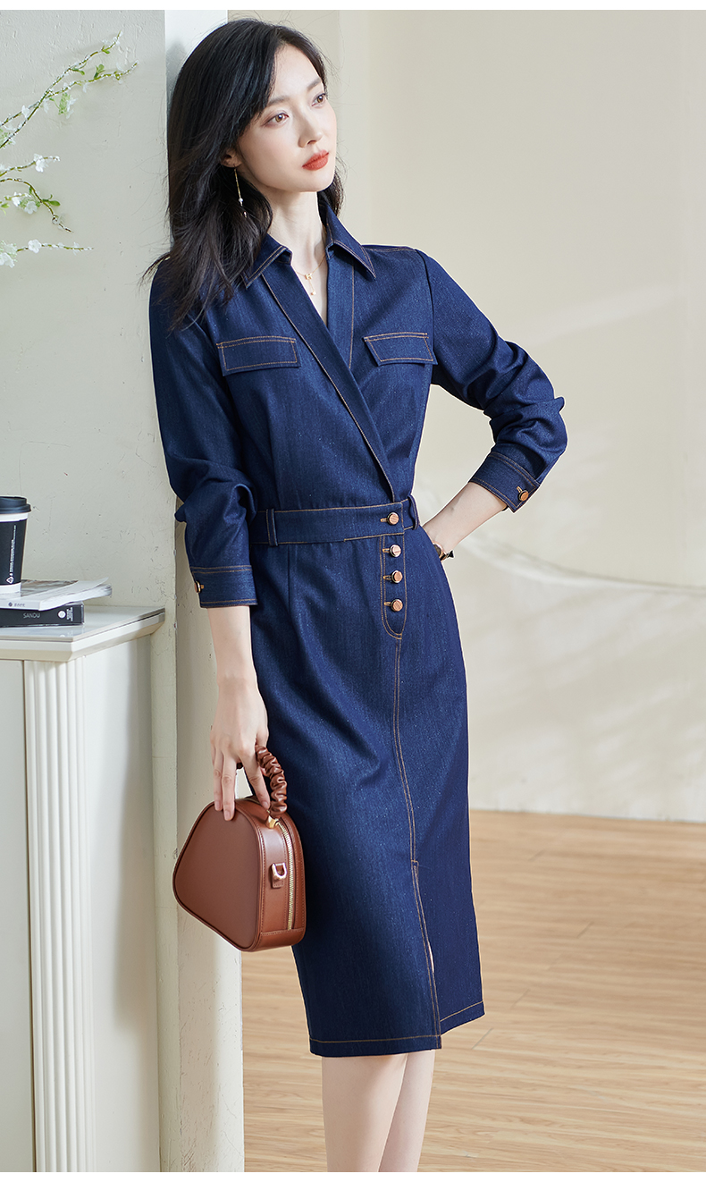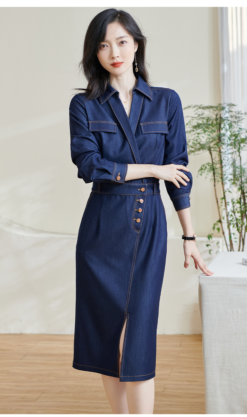 米思阳2026春季新款复古时尚牛仔连衣裙收腰弹力开叉一步裙女0638