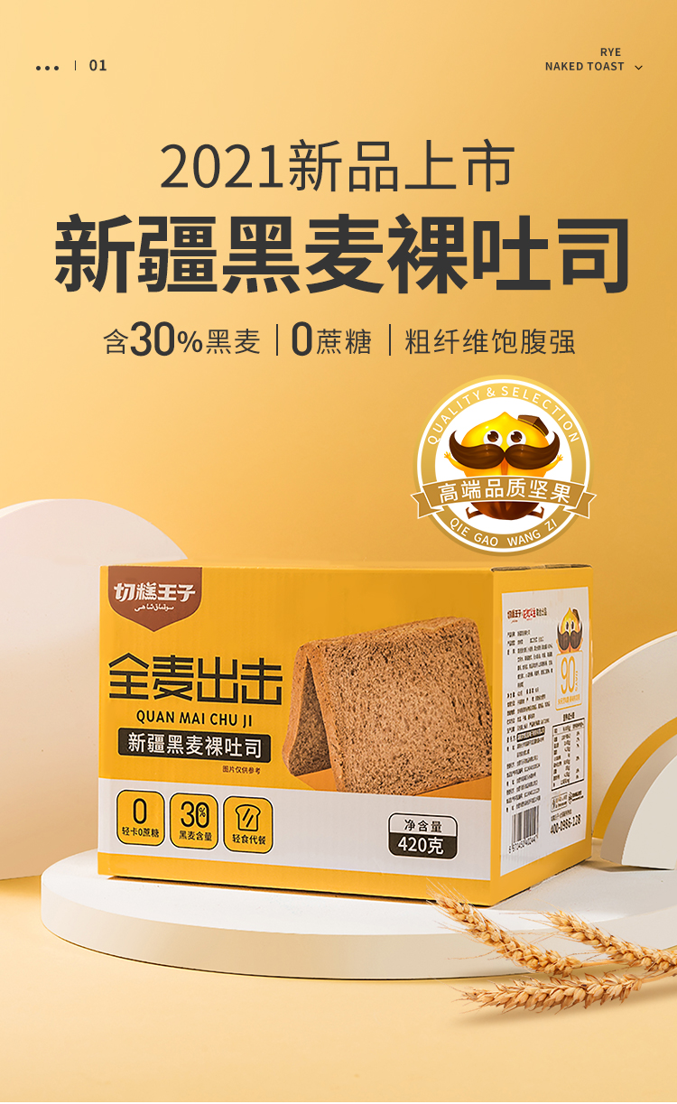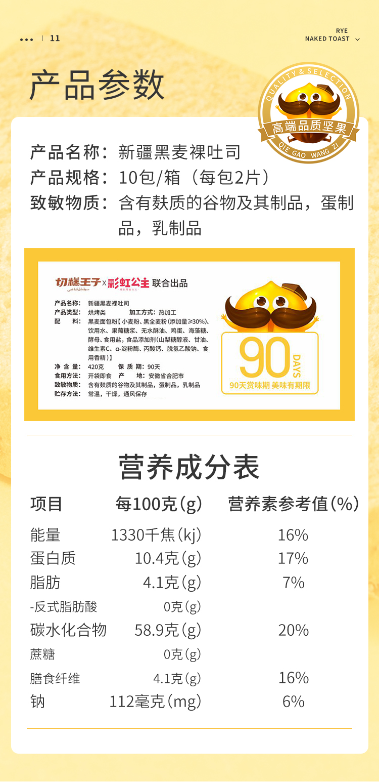 【产品类型】烘烤类 【加工方式】热加工 【产地】安徽省合肥市 【配料表】黑麦面包粉【小麦粉、黑全麦粉(添加量≥30%)、饮用水、果葡糖浆、无水酥油、鸡蛋、海藻糖、酵母、食用盐、食品添加剂(山梨糖醇液、甘油、维生素C、a-淀粉酶、丙酸钙、脱氢乙酸钠、食用香精)】 【净含量】420g 【生产日期】见包装上标示 【保质期】90天 【贮存方式】常温,干燥,通风保存 【生产许可证号】SC12434010205334 【执行标准】GB/T20981 【致敏物质】含有麸质的谷物及其制品,蛋制品,乳制品 【发货地】安徽省合肥市 【包装方式】礼盒 【发货时效】下单后72小时内 【物流方式】韵达/邮政/百世快递随机(不接受指定) 【加运费区域】内蒙古自治区,辽宁省,吉林省,黑龙江省,海南省、青海省、宁夏回族自治区 +收2元/件 ,续件2元