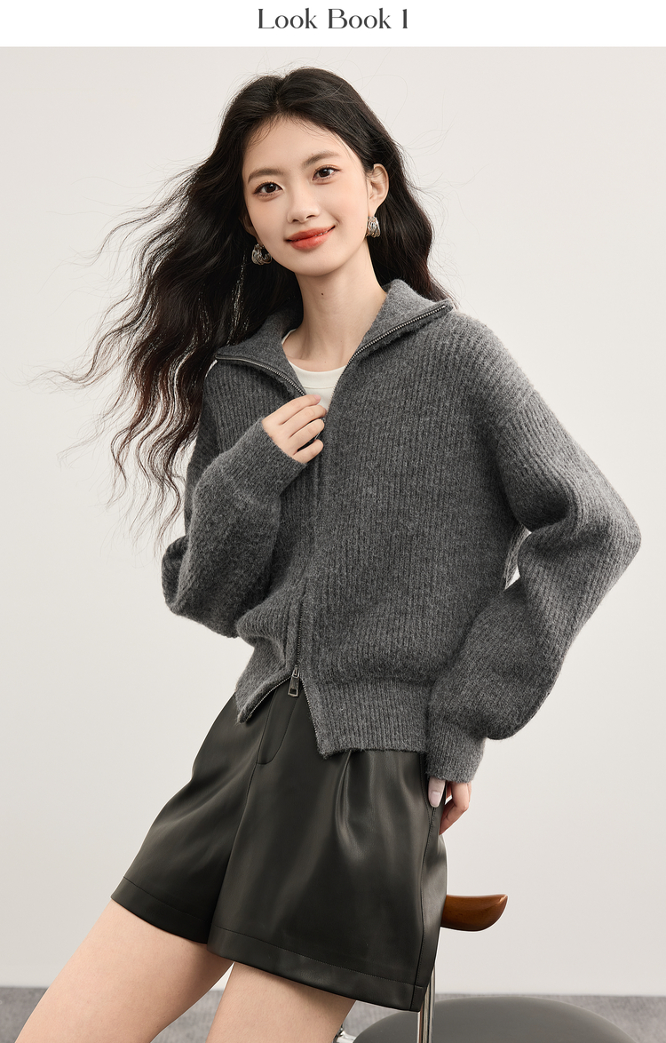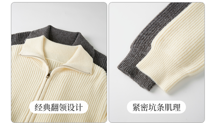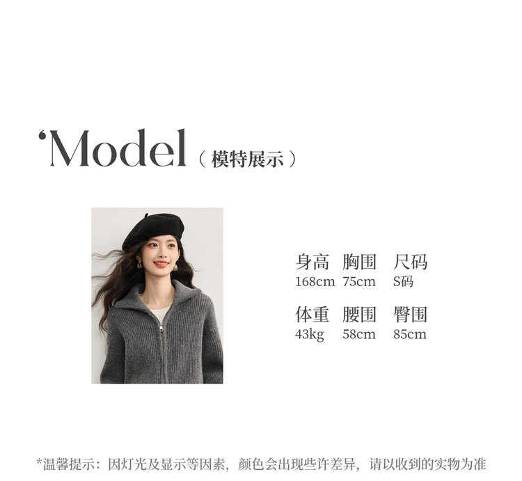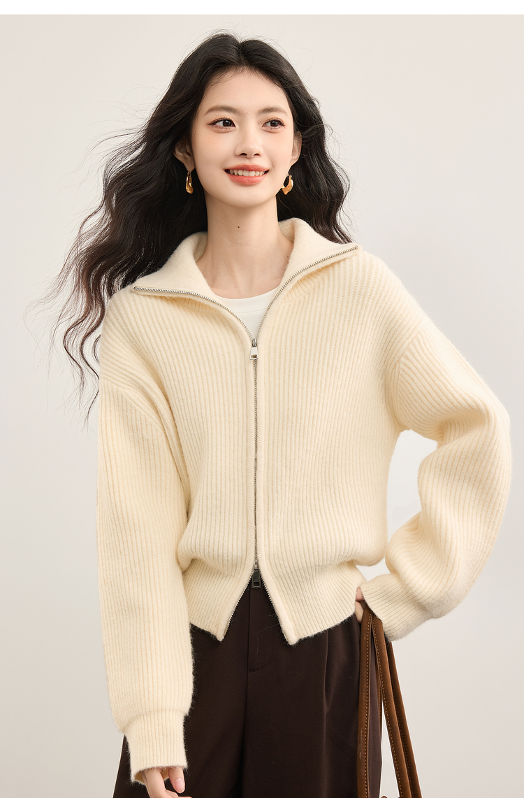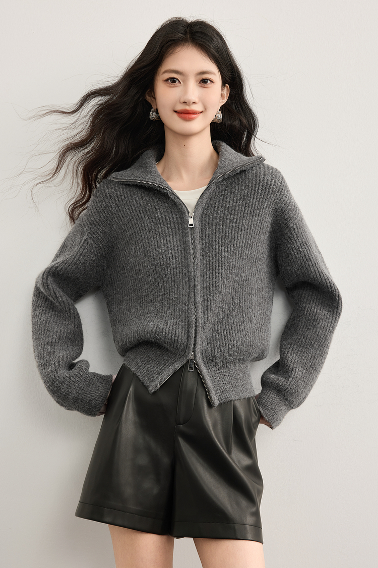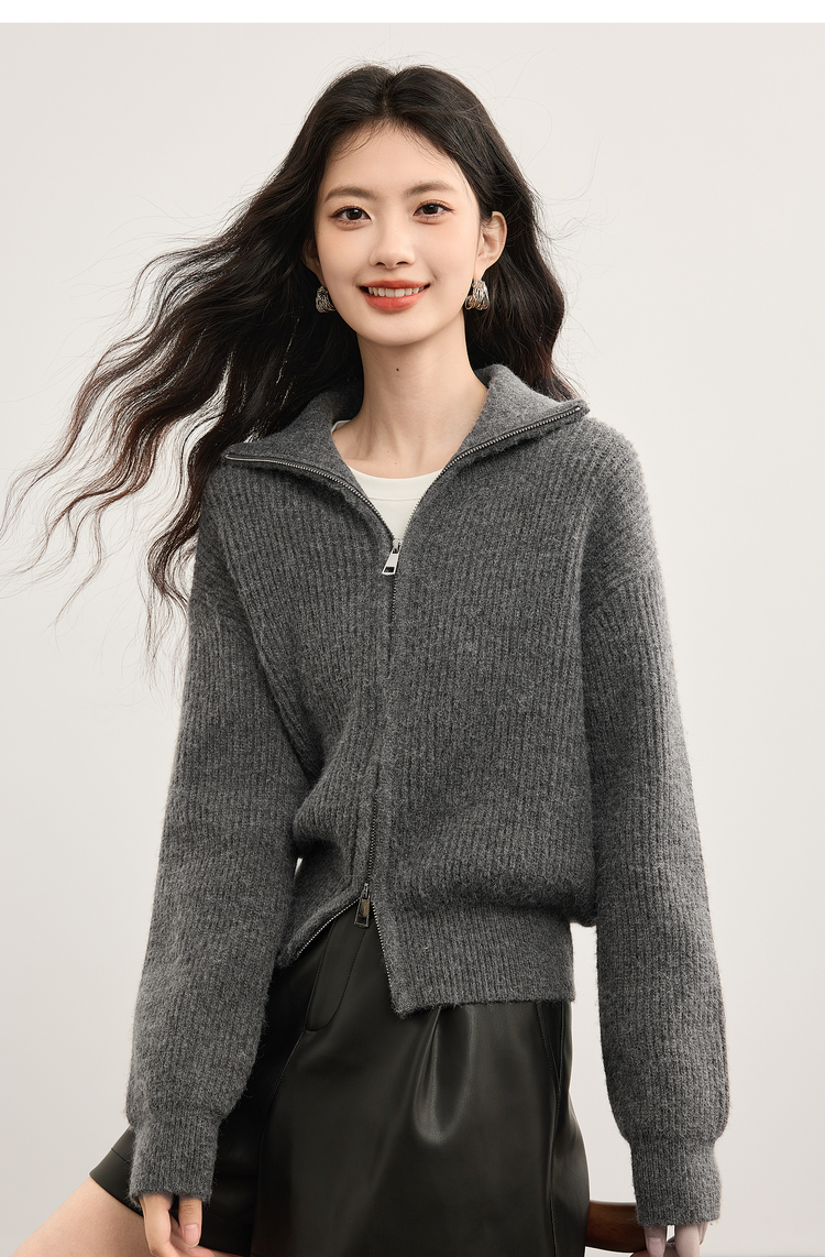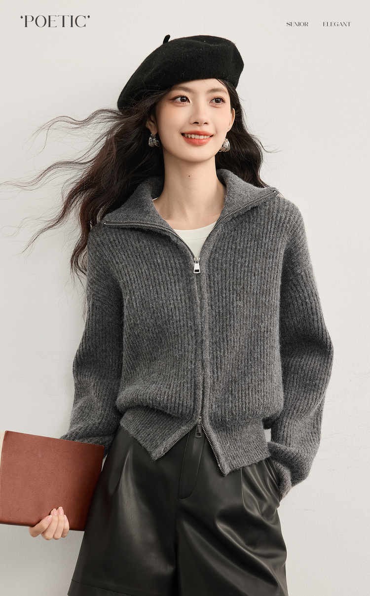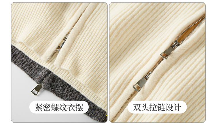 【10/1新品】熙世界仿驼绒坑条毛衣开衫女秋冬2025新款双头拉链翻领针织短外套