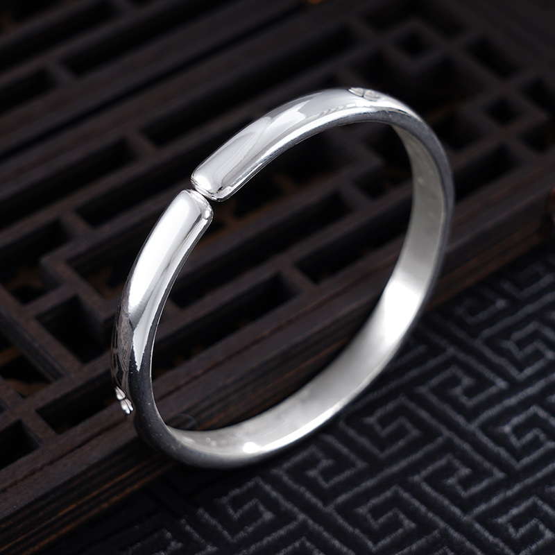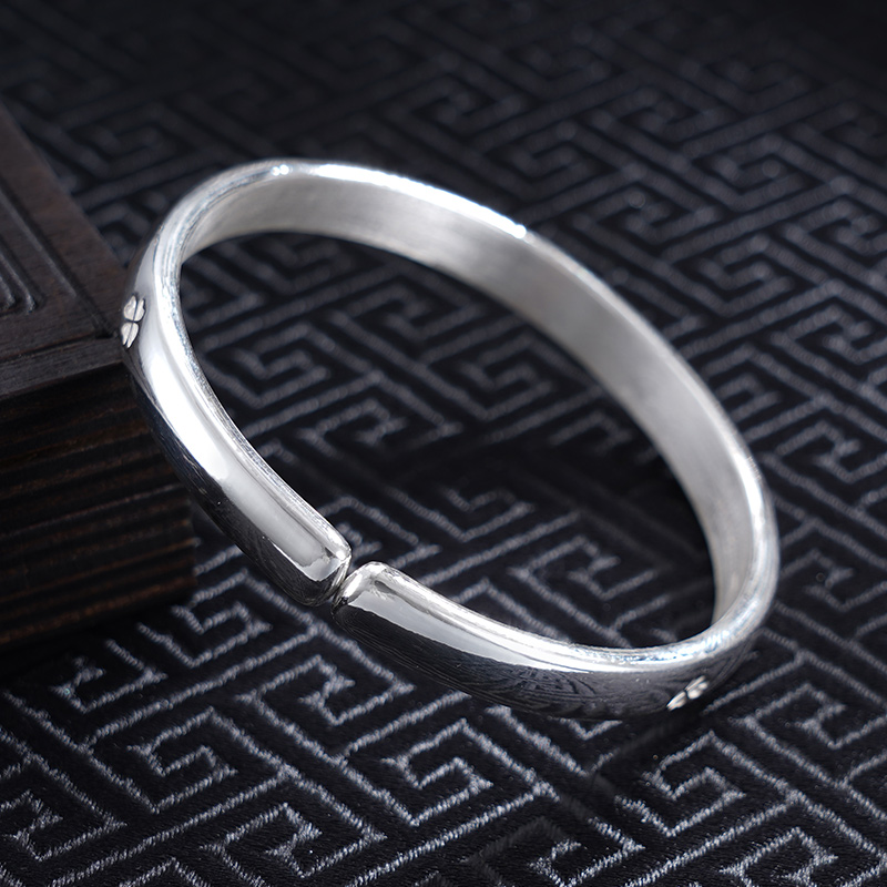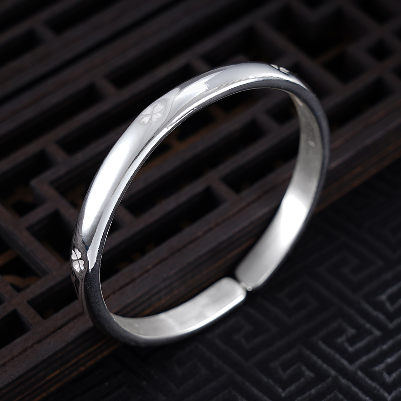 【寓意】:纯银开口手镯,镯面錾刻四叶草纹样,辅以抛光工艺,象征感情纯洁无瑕,寓意真爱相依,幸运相伴。