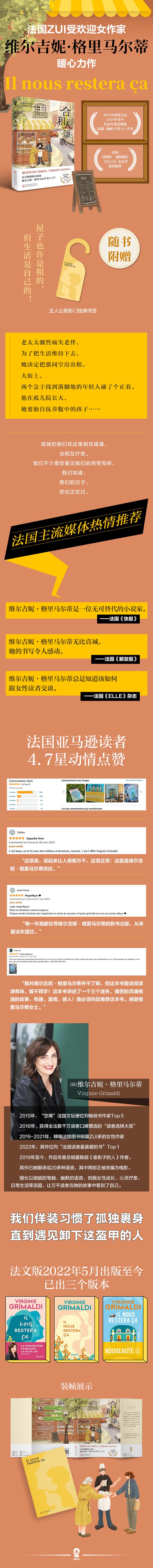 "★法国ZUI受欢迎女作家维尔吉妮·格里马尔蒂暖心力作。 ★法国《快报》《解放报》《ELLE》杂志等热情推荐。 ★一度高居法国亚马逊畅销书总榜第14位、文学榜第10位,法国亚马逊读者4.7分动情点赞。 ★维尔吉妮·格里马尔蒂2015年初登文坛,2019年至今作品年度总销量稳超《偷影子的人》作者。其作已被翻译成20多种语言,畅销英、德、意、日等近40国,其中两部正被改编成电影。 ★抱团取暖好过独自逞强,一曲放下过去、敞开心扉的颂歌。 ★我们佯装习惯了孤独裹身,直到遇见卸下这盔甲的人。 ★随书附赠:主人公剪影门挂牌"