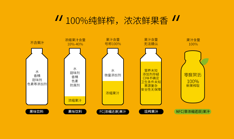我也科普下,市面上的果汁饮品按照果汁含量可以分为:果味饮料、果汁饮料、FC浓缩还原果汁,鲜榨果汁和NFC非浓缩还原果汁。