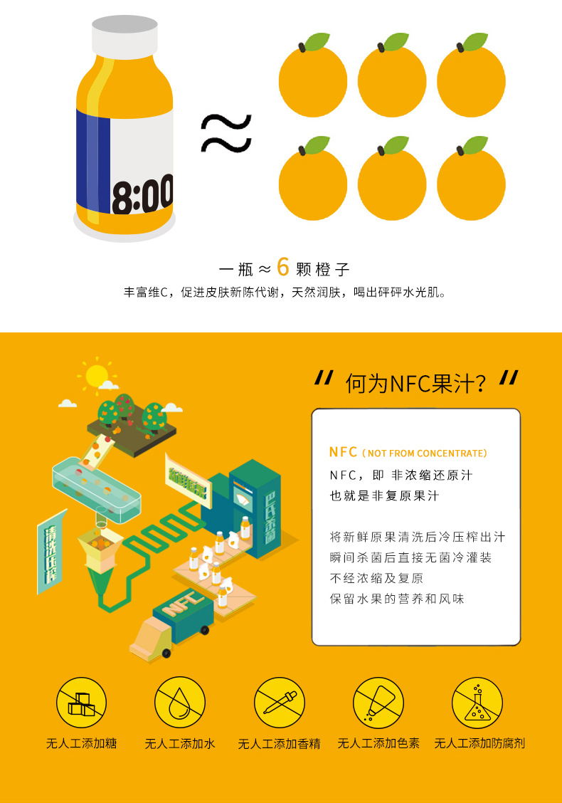 NFC非浓缩还原果汁,是将新鲜水果鲜榨杀菌后,立即罐装的工艺,省去了中间的浓缩、调配(勾兑)过程,其实就是纯纯的果汁了。近两年很多饮料品牌也有涉猎NFC果汁领域,我也喝过几种,口感差强人意。