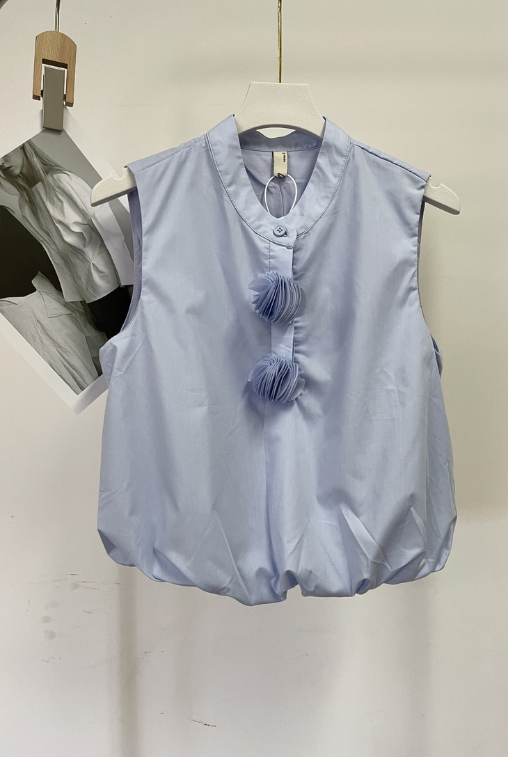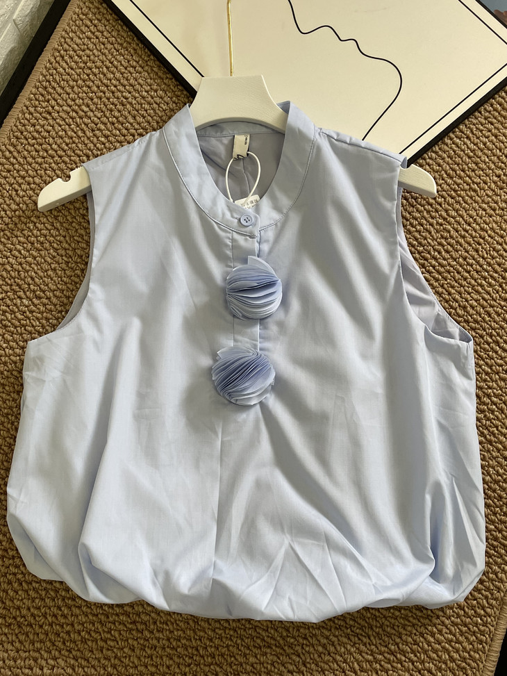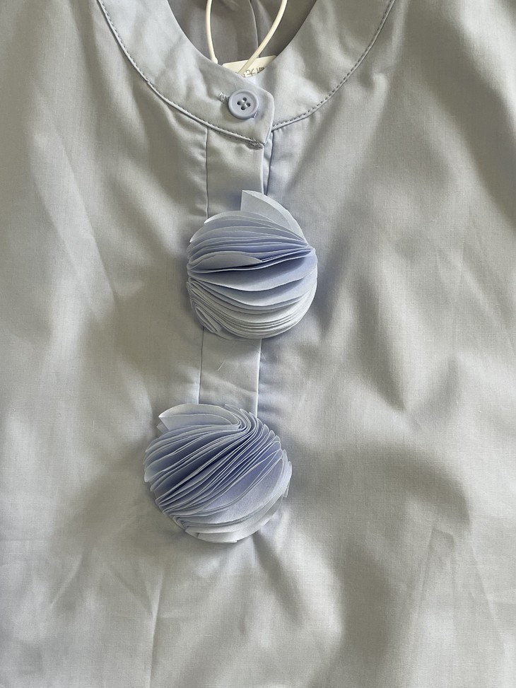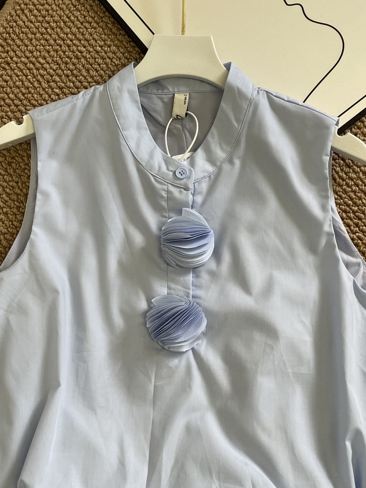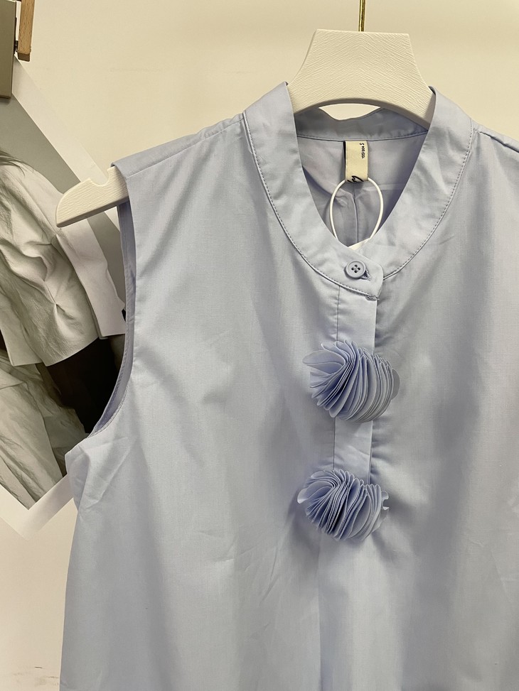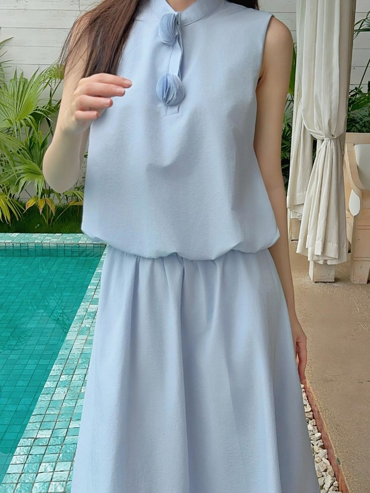 无袖设计 优化肩颈线条,举手投足不受束缚 领口手作立体书页球 如翻卷书质般灵动,灌注艺术气息 隐藏式半开门襟 简洁美观,穿脱轻松