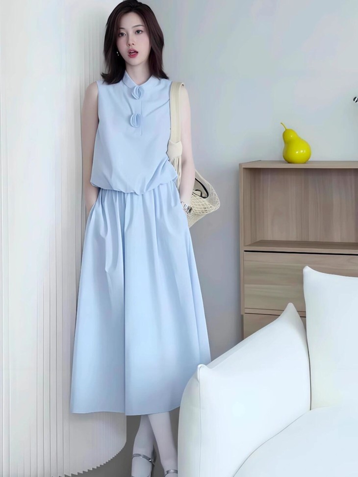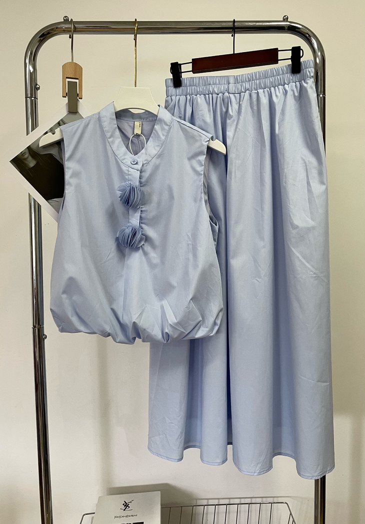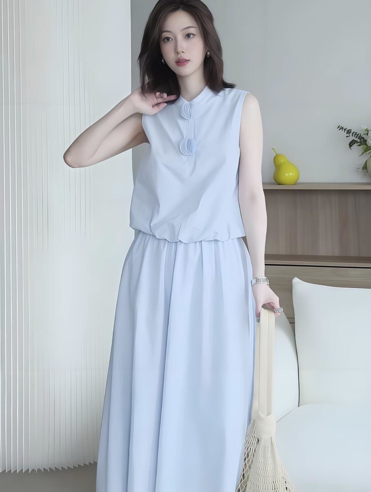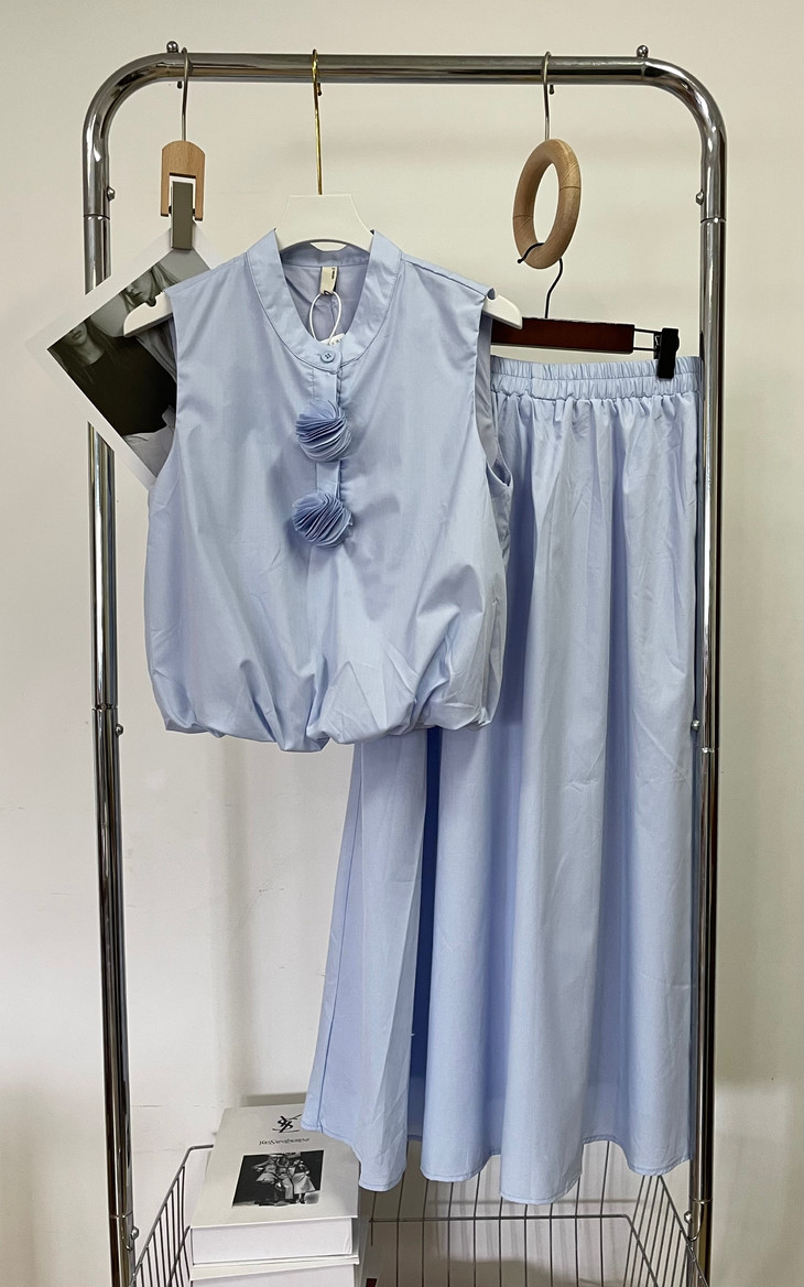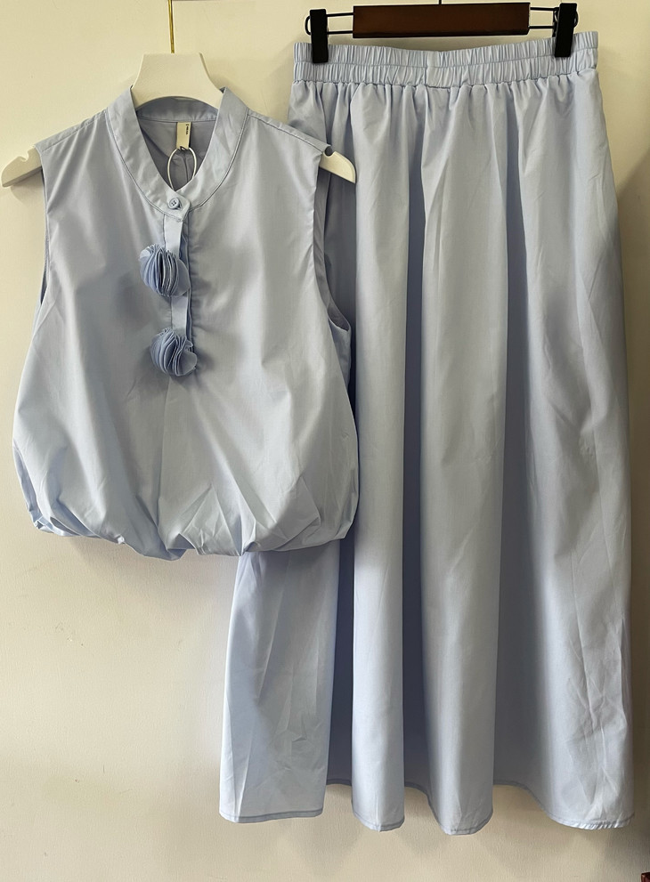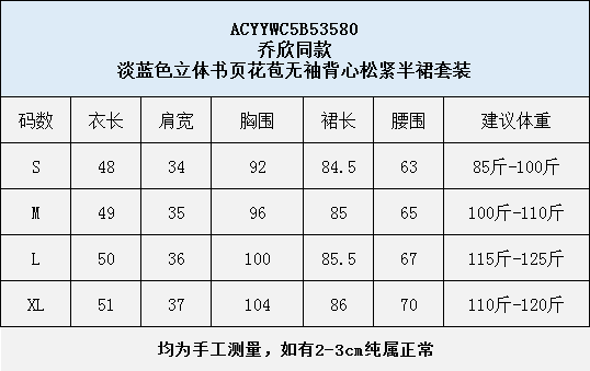 淡蓝色立体书页花苞无袖背心松紧半裙套装 【材质】面料:80%聚酯纤维20%棉;里料:100%聚酯纤维 【颜色】蓝色套装 【尺码】S-XL(80-125斤)