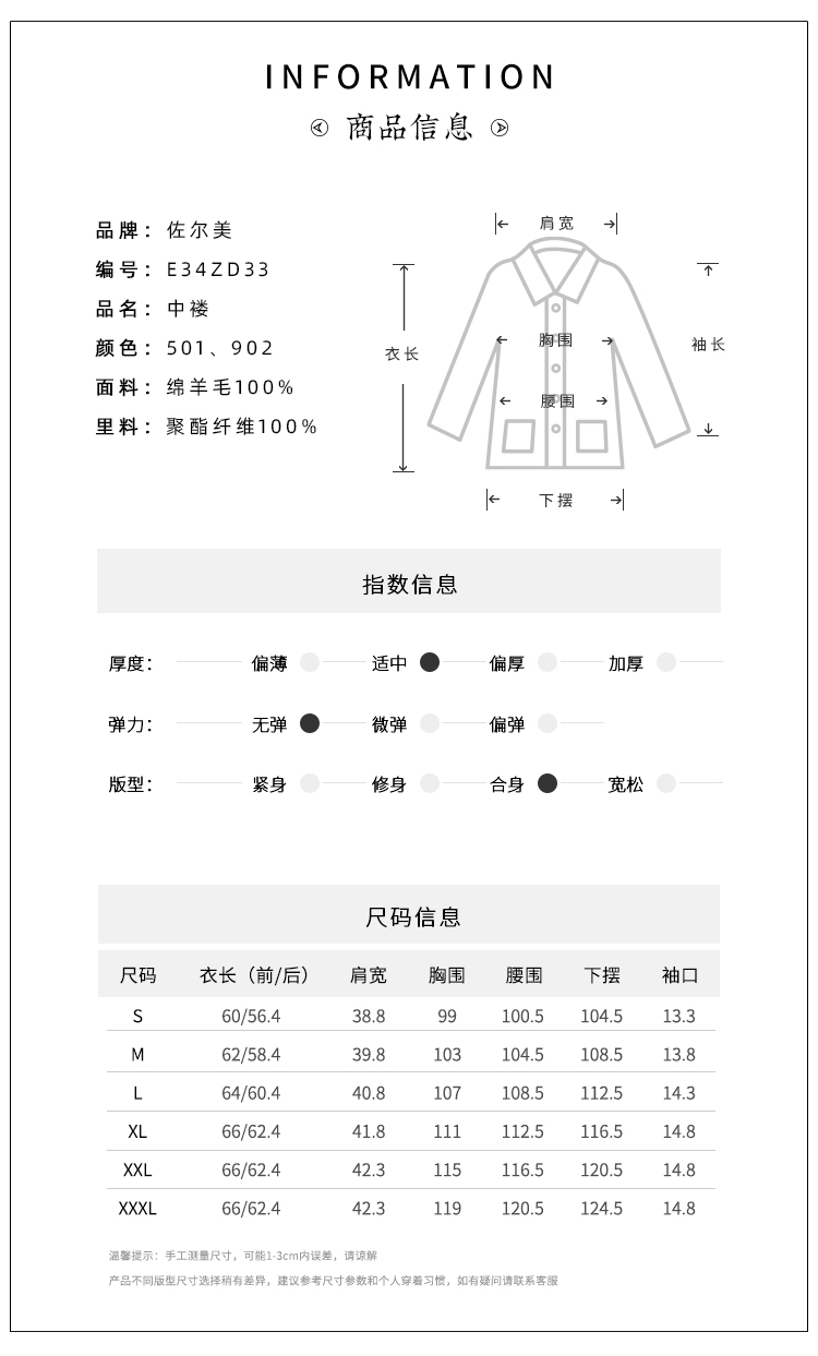 佐尔美新品秋冬新品薄纯色简约时尚妈妈装女外套E73FZ09
