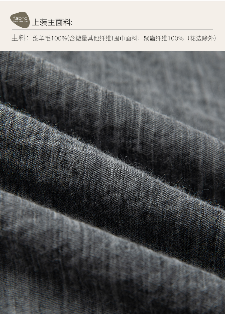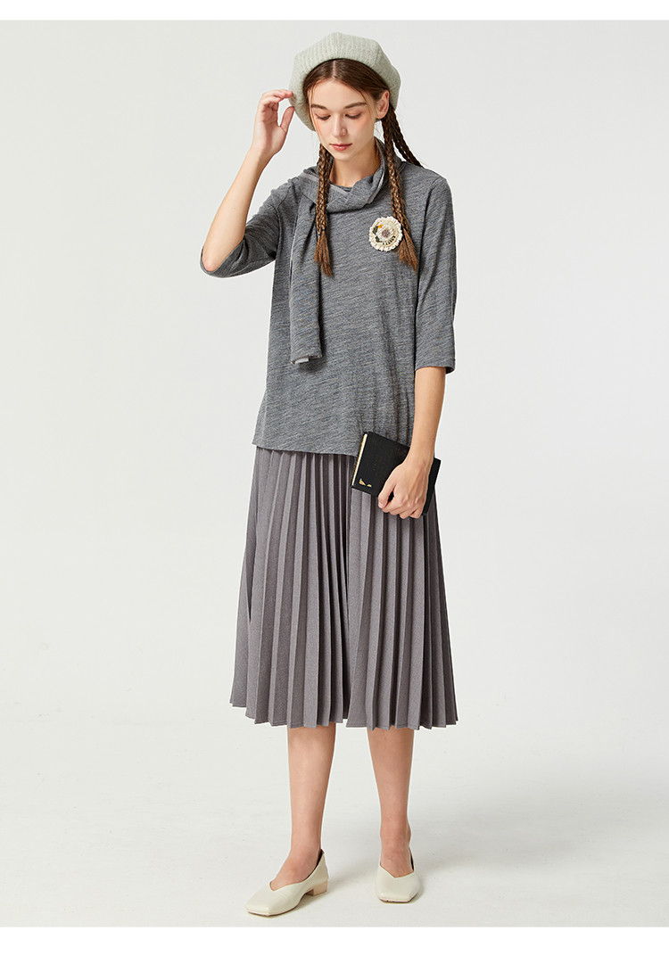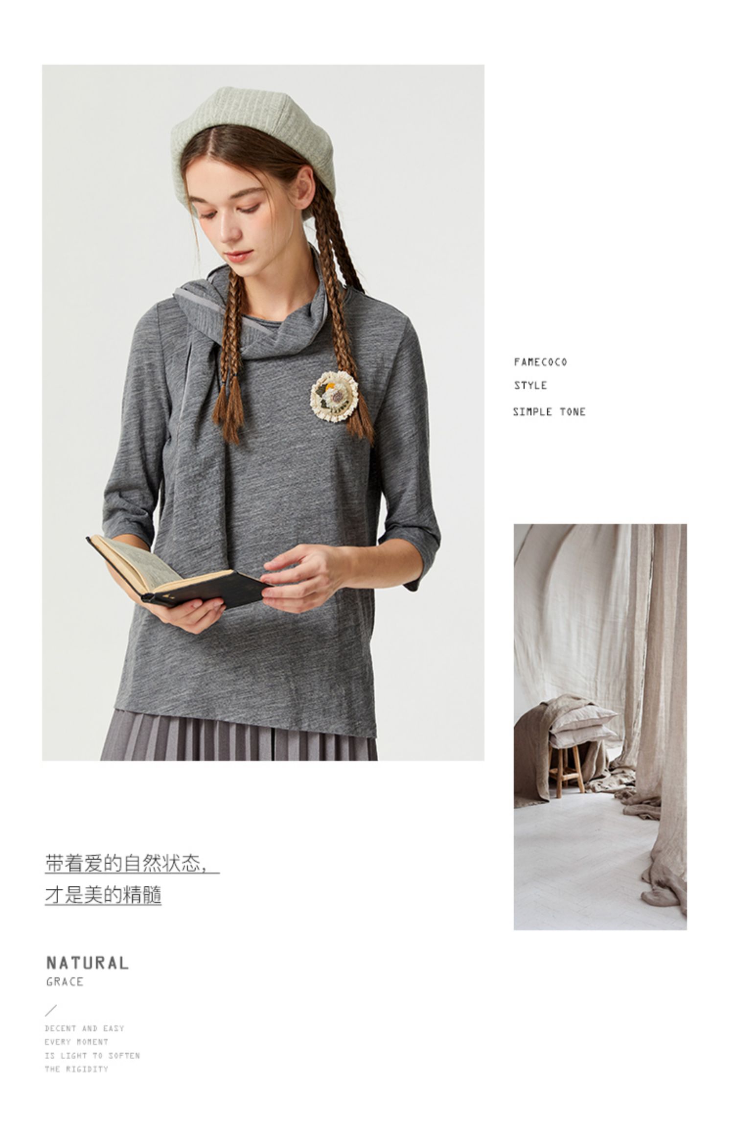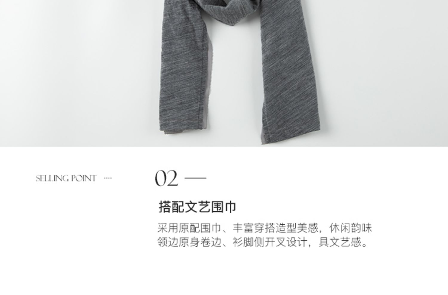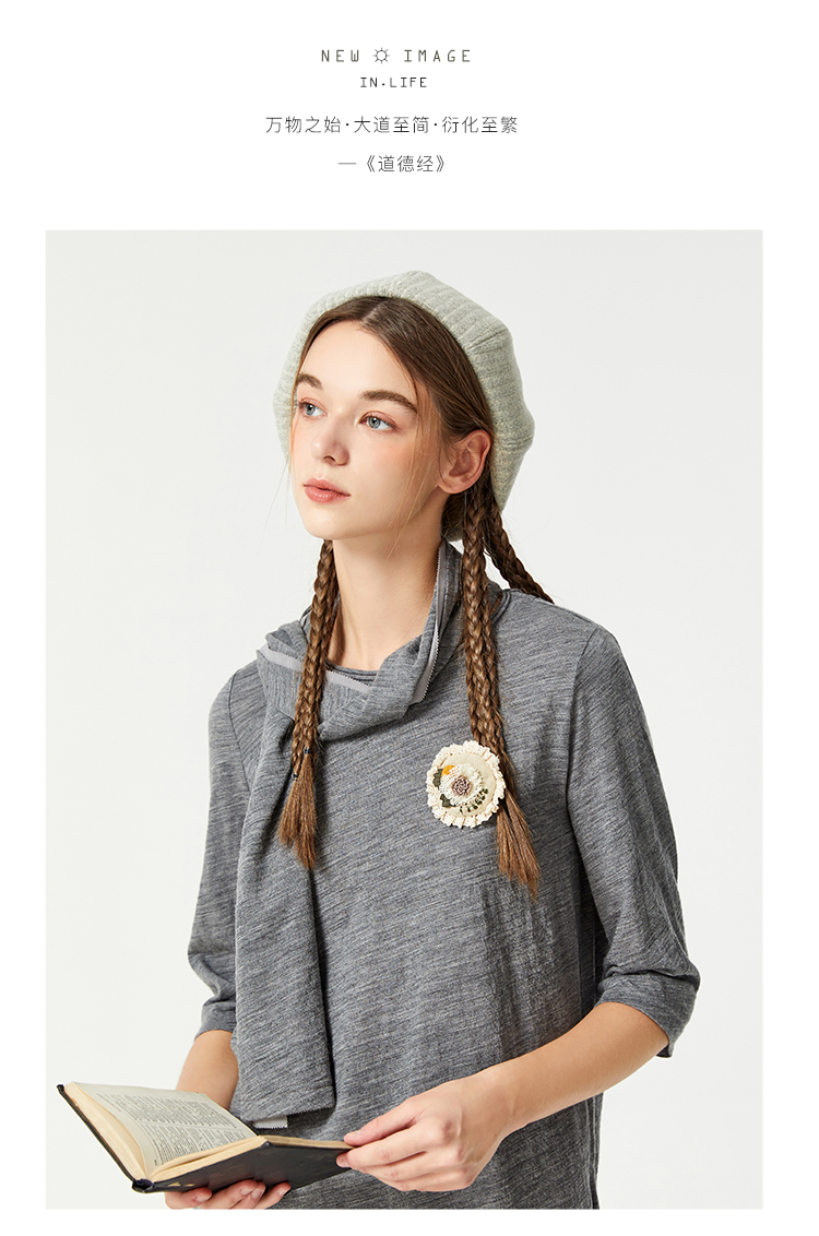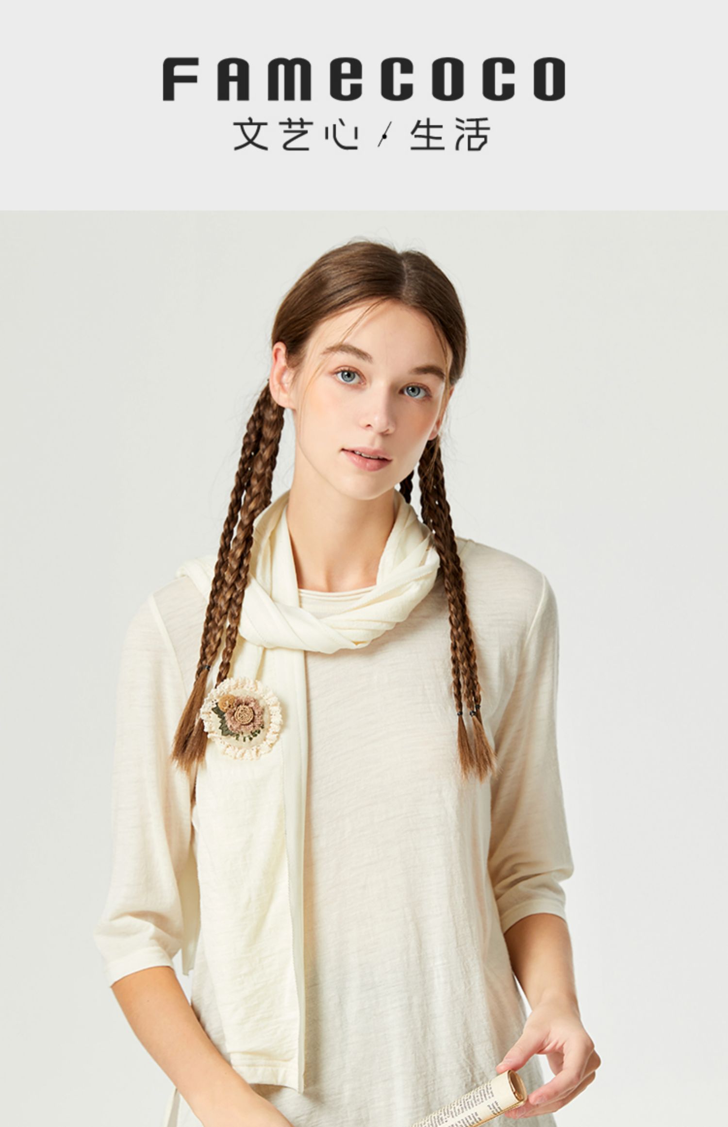 Famecoco范可儿五分袖圆领纯羊毛针织衫女春秋中长款原创围巾上衣F225BE004