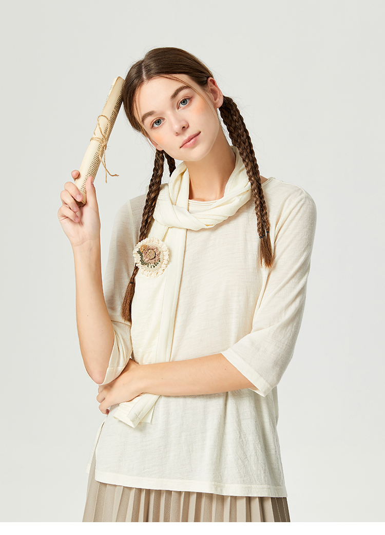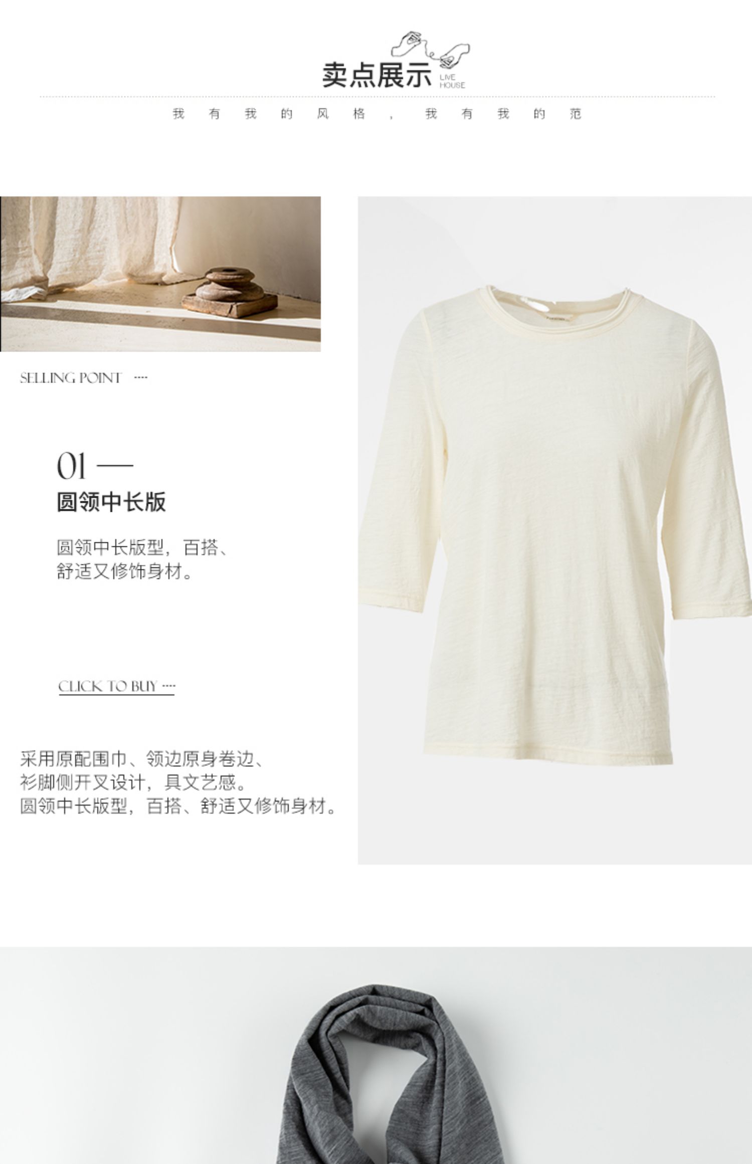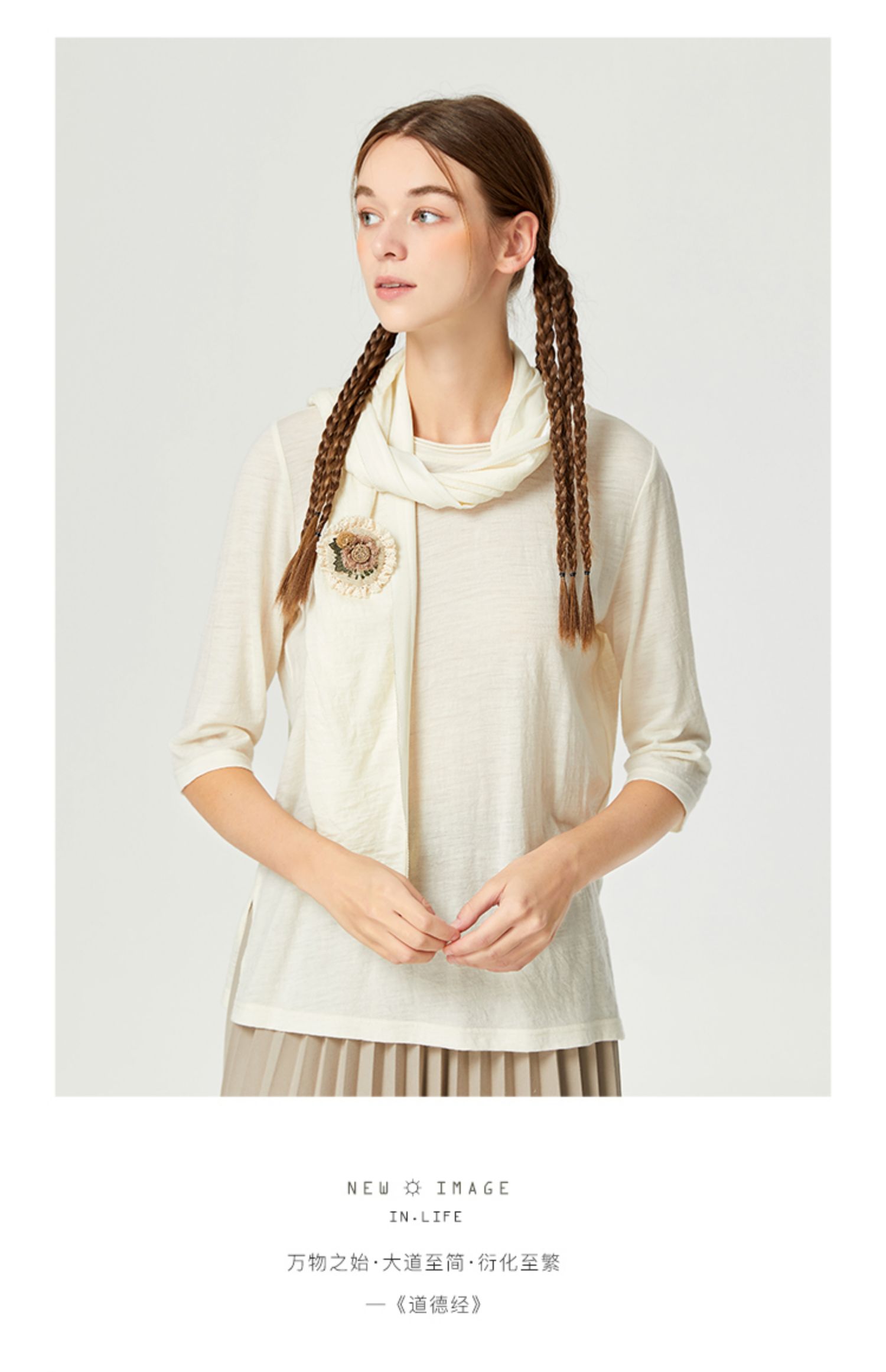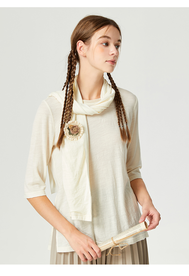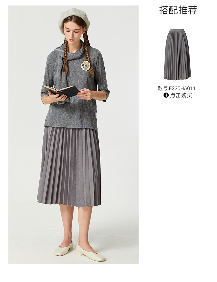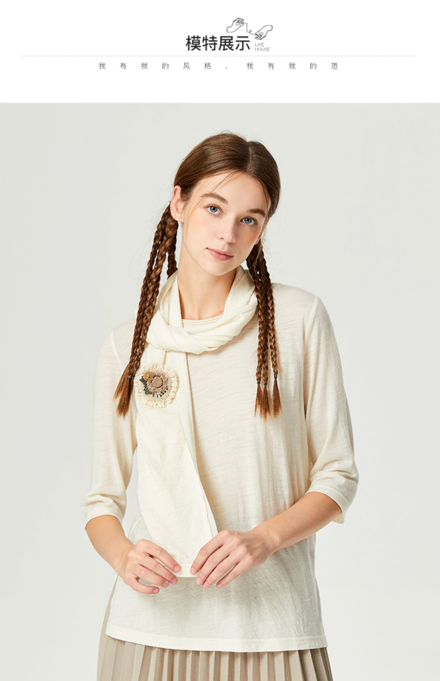 Famecoco范可儿五分袖圆领纯羊毛针织衫女春秋中长款原创围巾上衣F225BE004